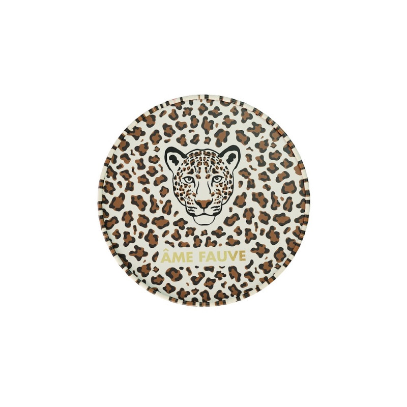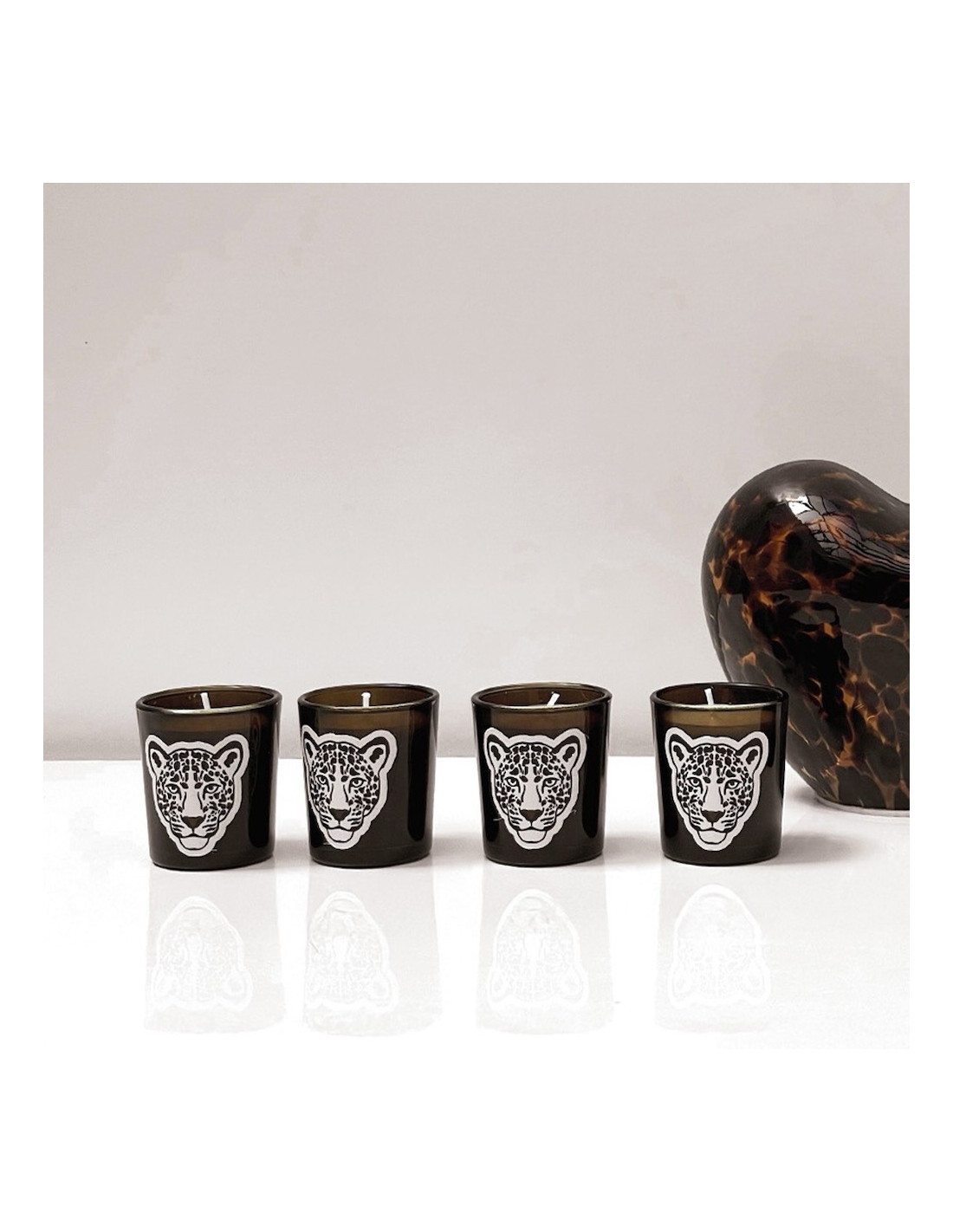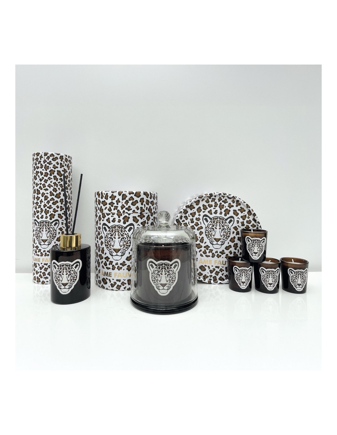Coffret rond imprimé leopard composé de 4 petites bougie, senteur cèdre.