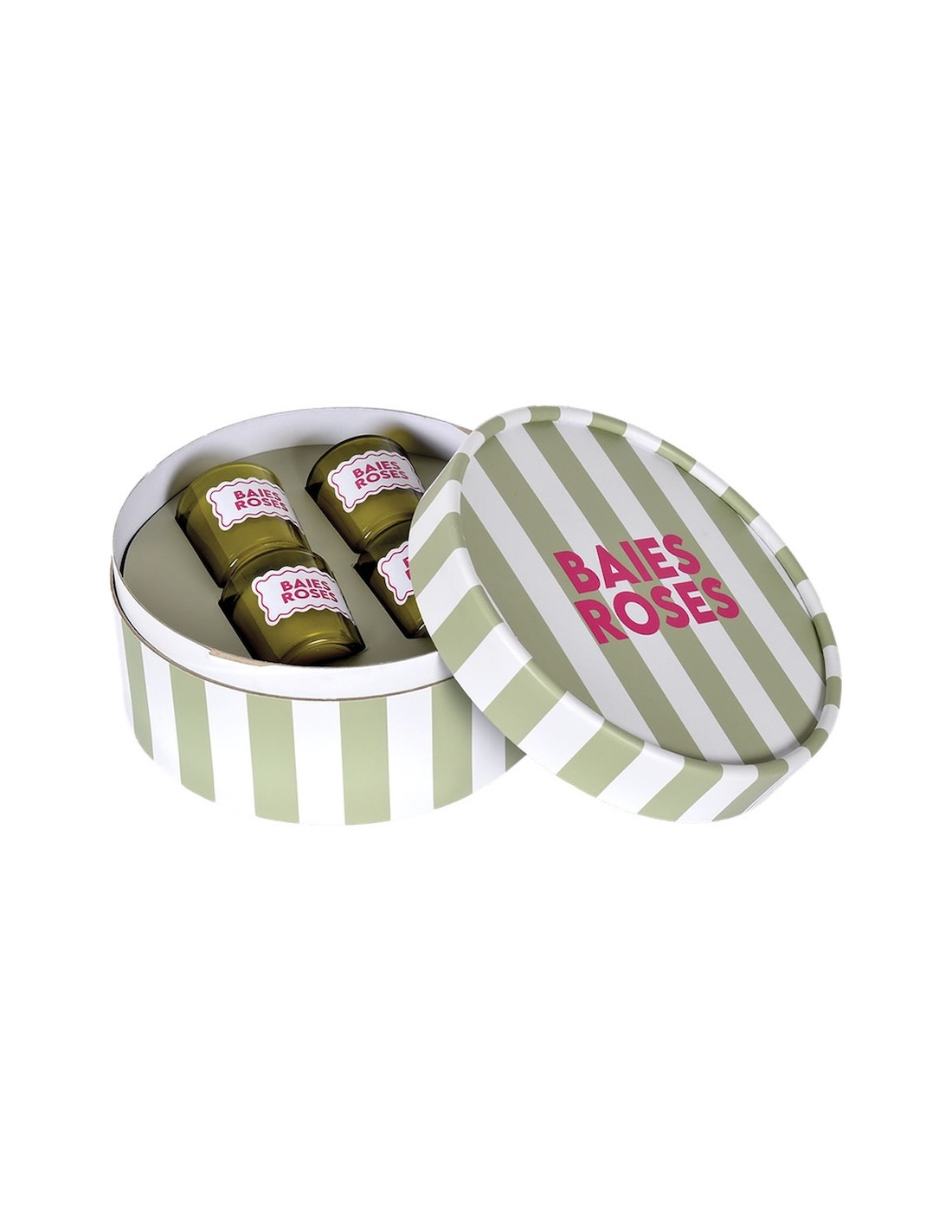 Coffret rond imprimé rayures composé de 4 petites bougie, senteur baie rose.