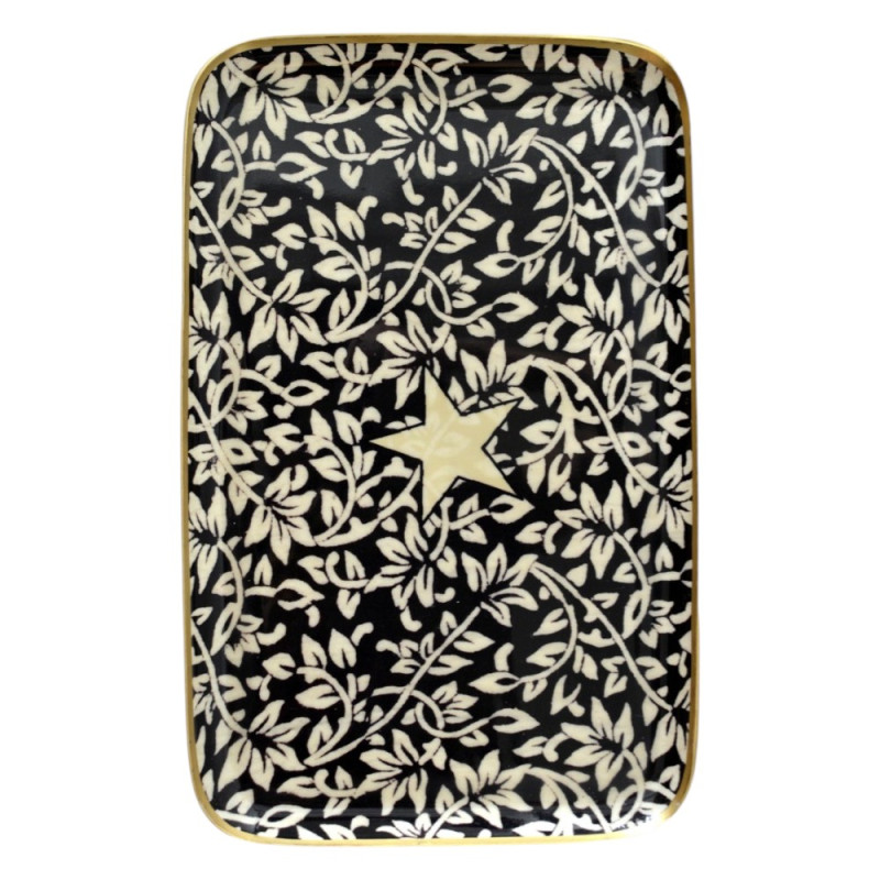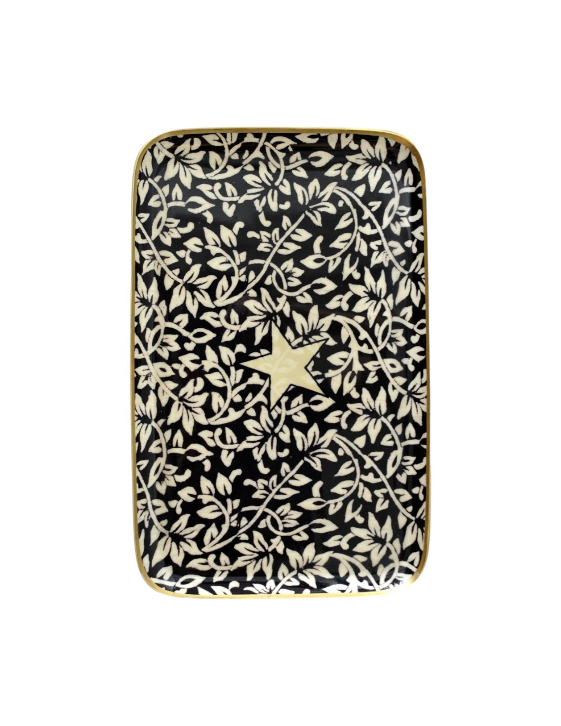 Plateau rectangulaire émaillé. Pour le service ou en déco, de jolis motifs inspirés des “block print” indiens. Imprimé Rameaux coloris carbone.
