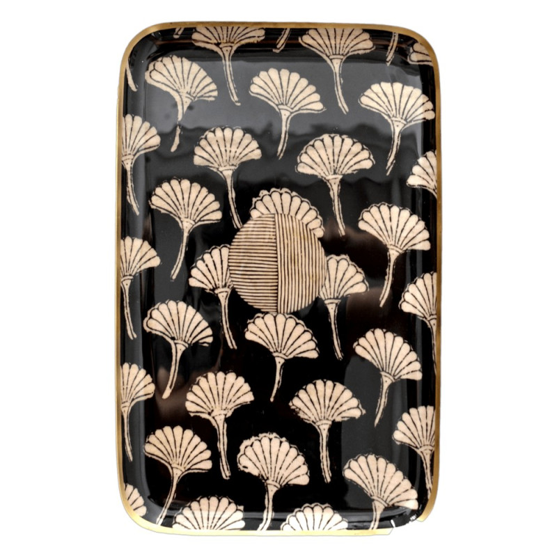 Plateau rectangulaire émaillé. Pour le service ou en déco, de jolis motifs inspirés des “block print” indiens. Imprimé Ginko.