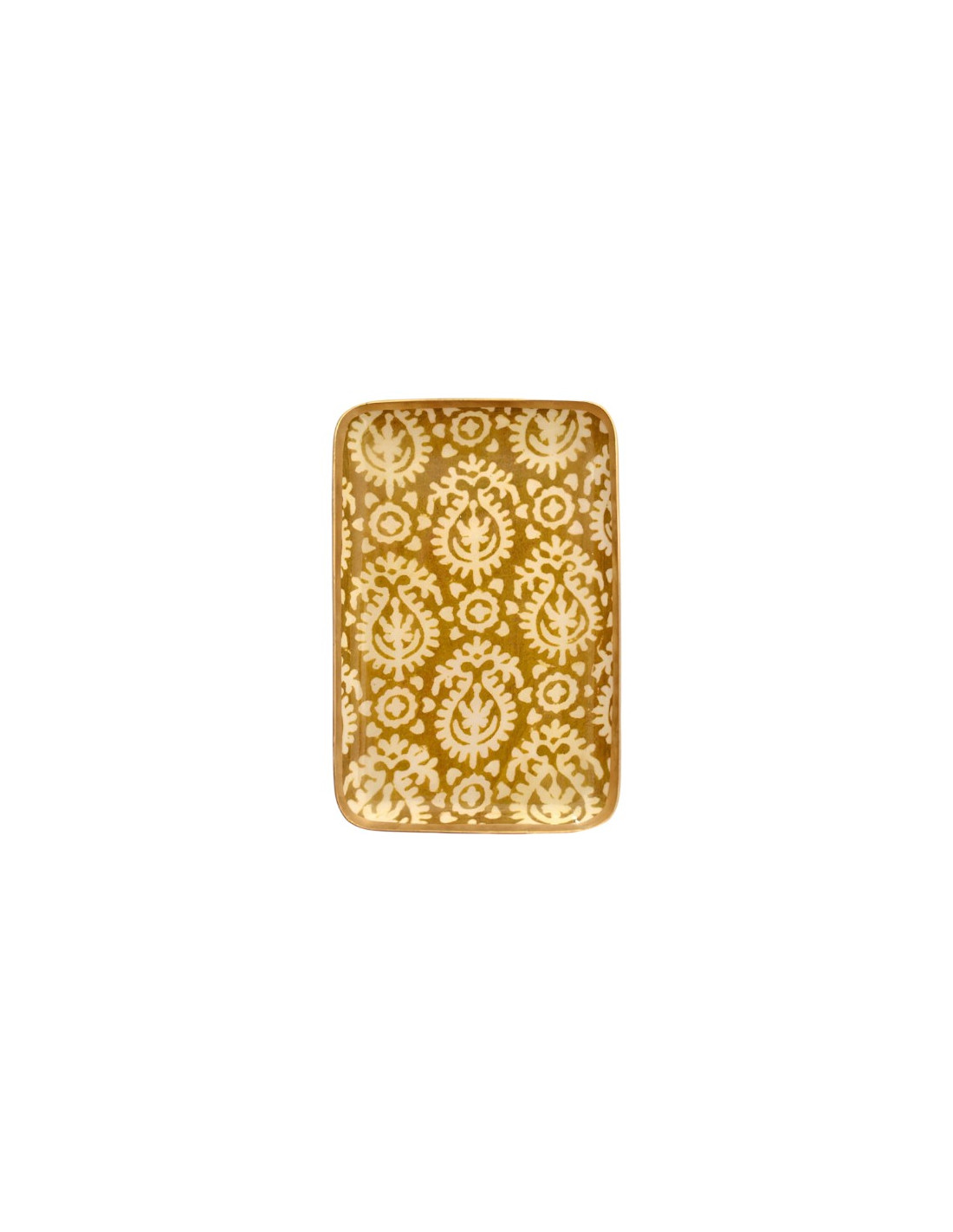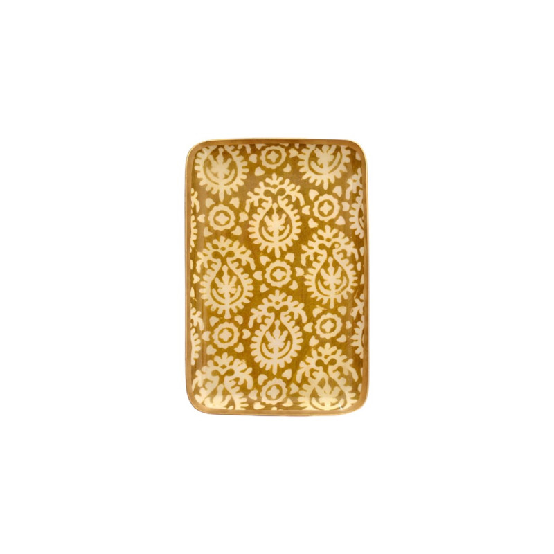 Plateau rectangulaire émaillé. Pour le service ou en déco, de jolis motifs inspirés des “block print” indiens. Imprimé Sunburn.