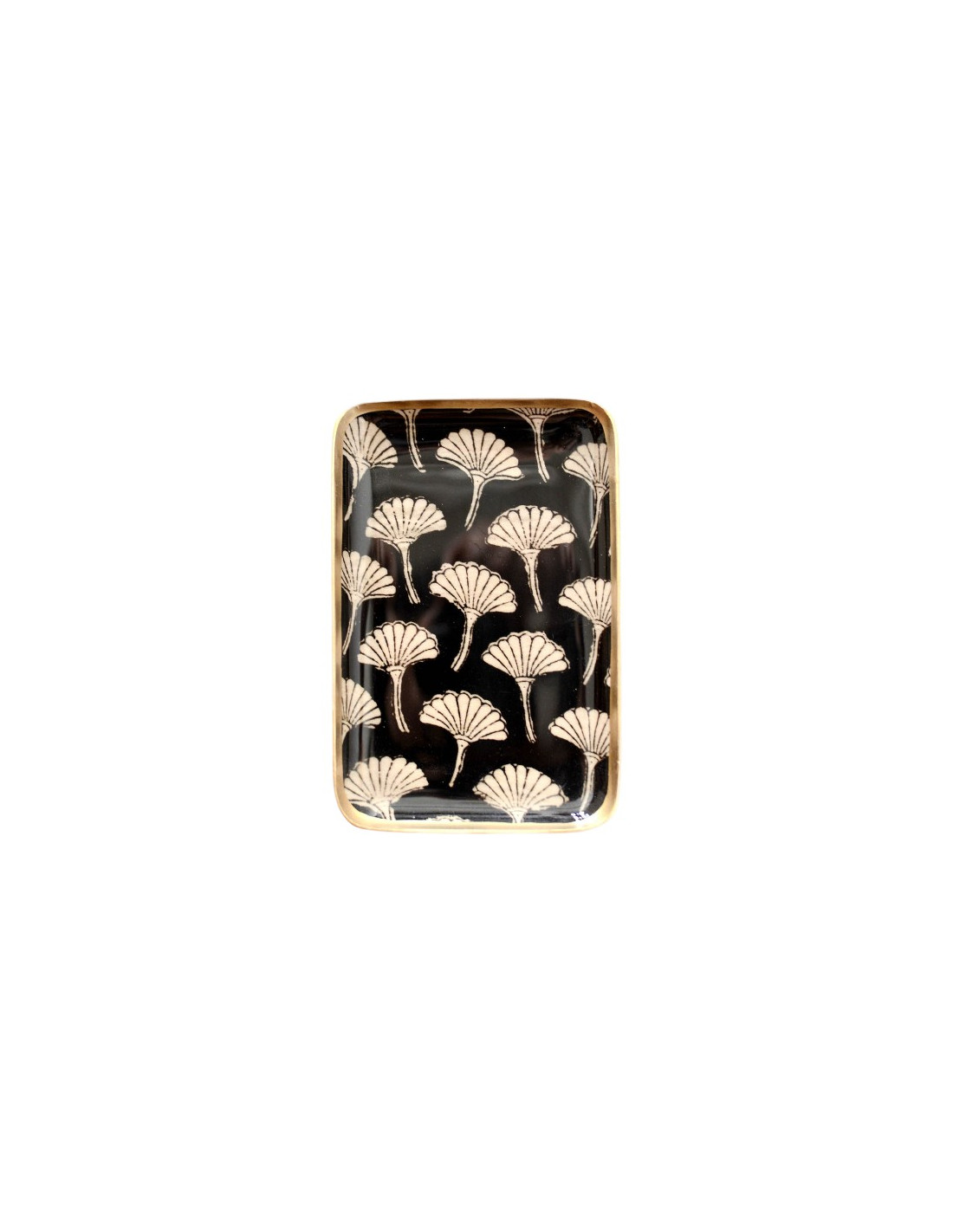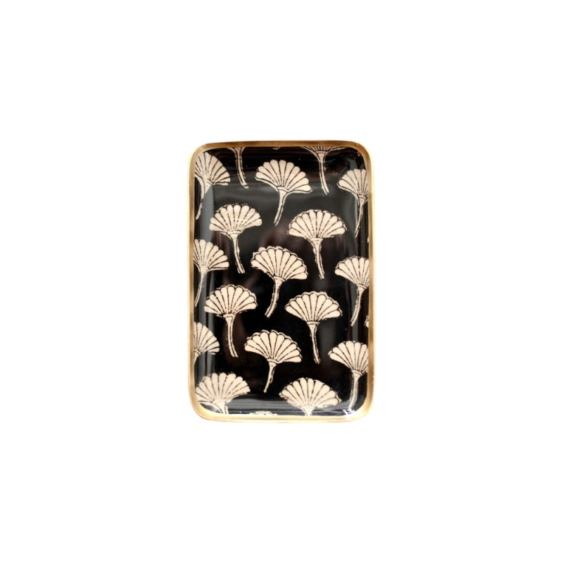 Plateau rectangulaire émaillé. Pour le service ou en déco, de jolis motifs inspirés des “block print” indiens. Imprimé Ginko.