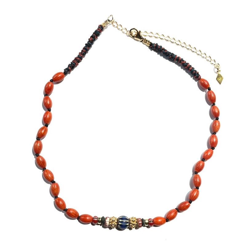 Collier tissé et perles de corail.