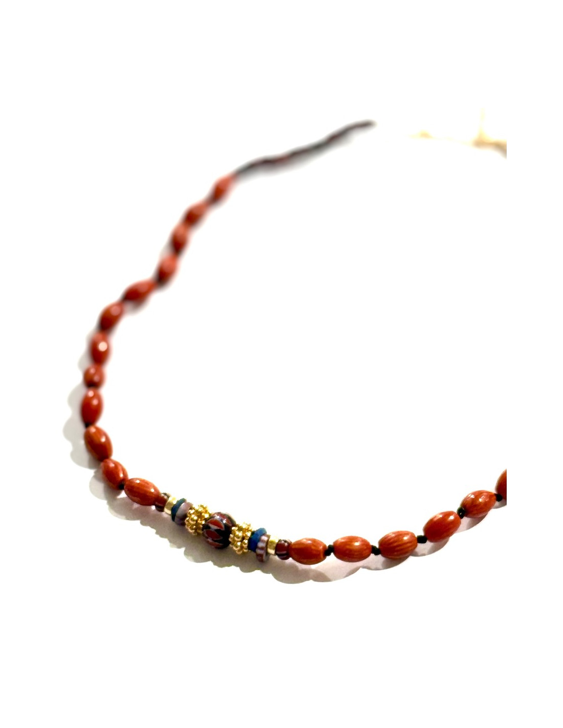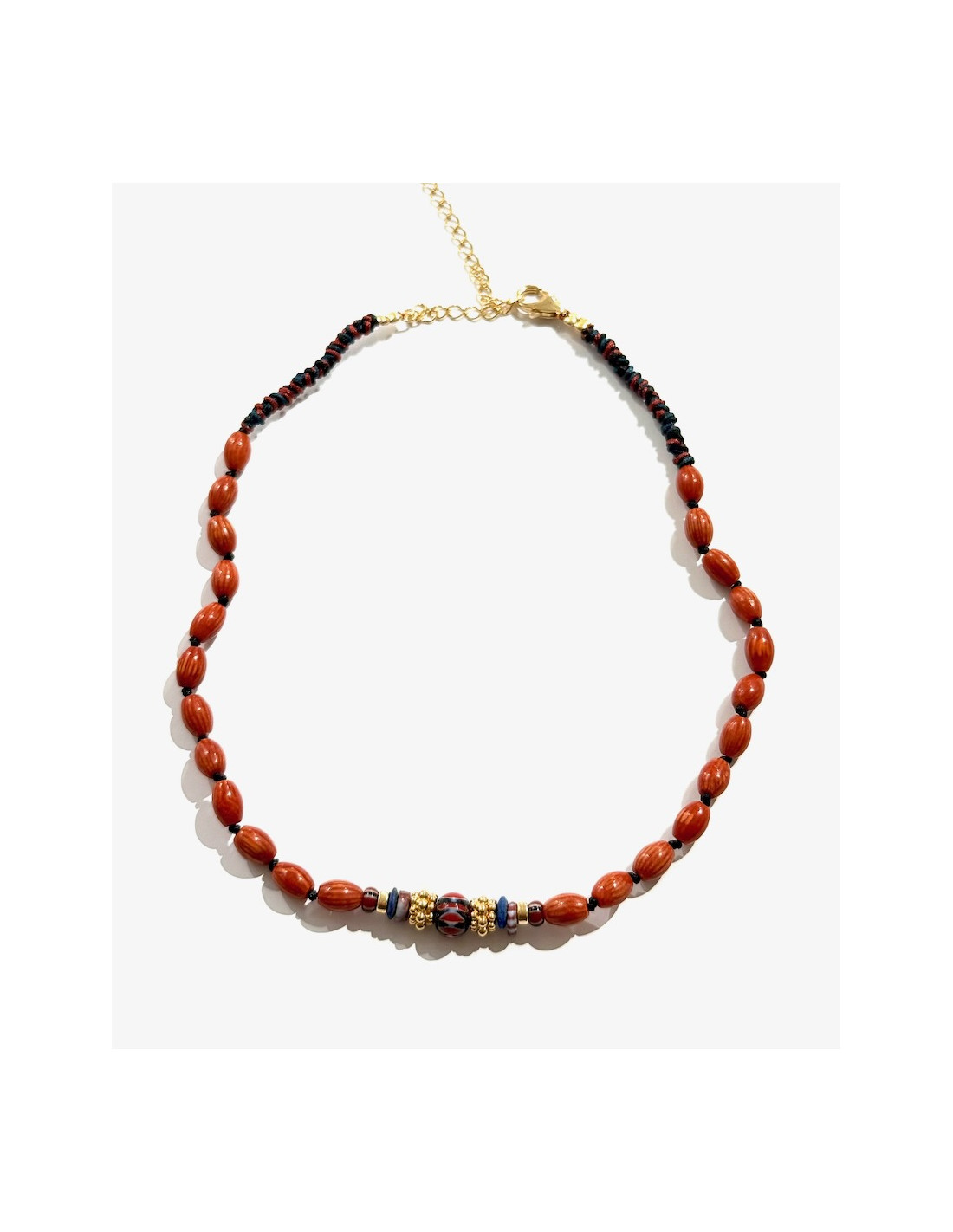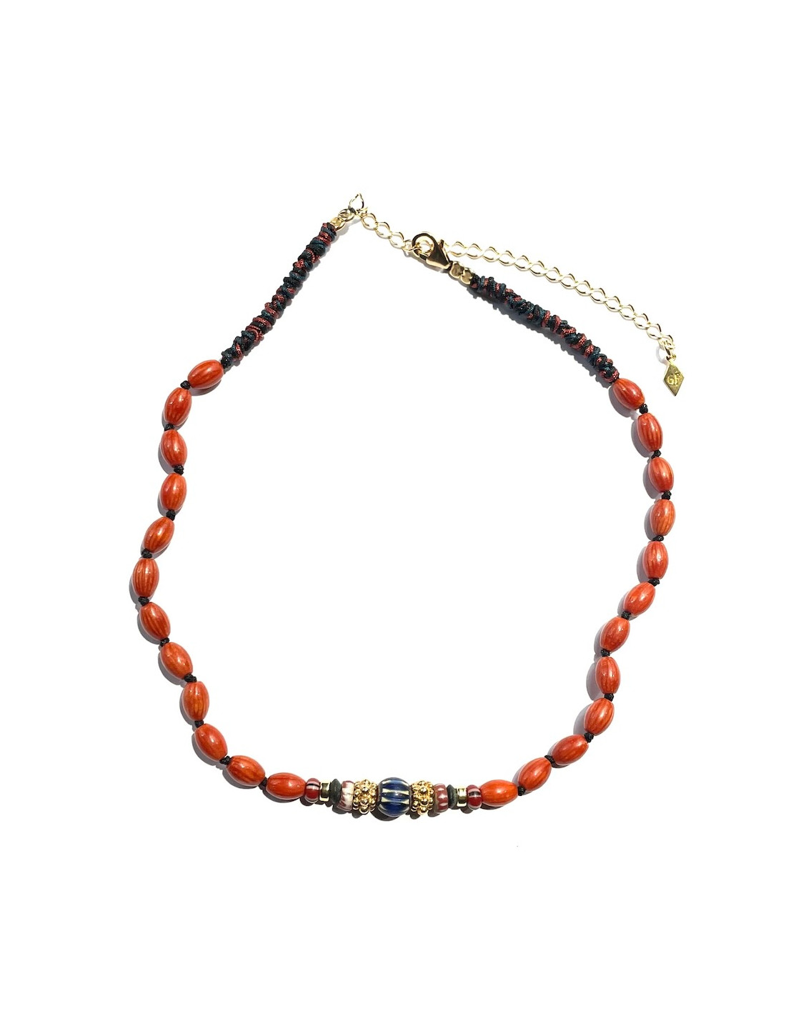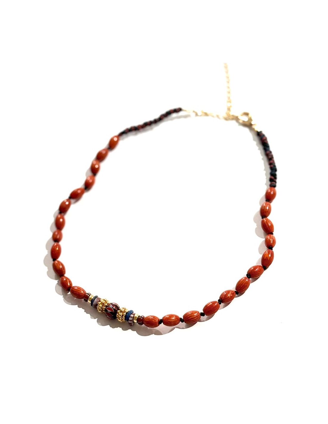 Collier court tissé à la main, serti de perles de bambou ovales, de jade noir, de perles de verres africaine et finitions plaquées or 18k.