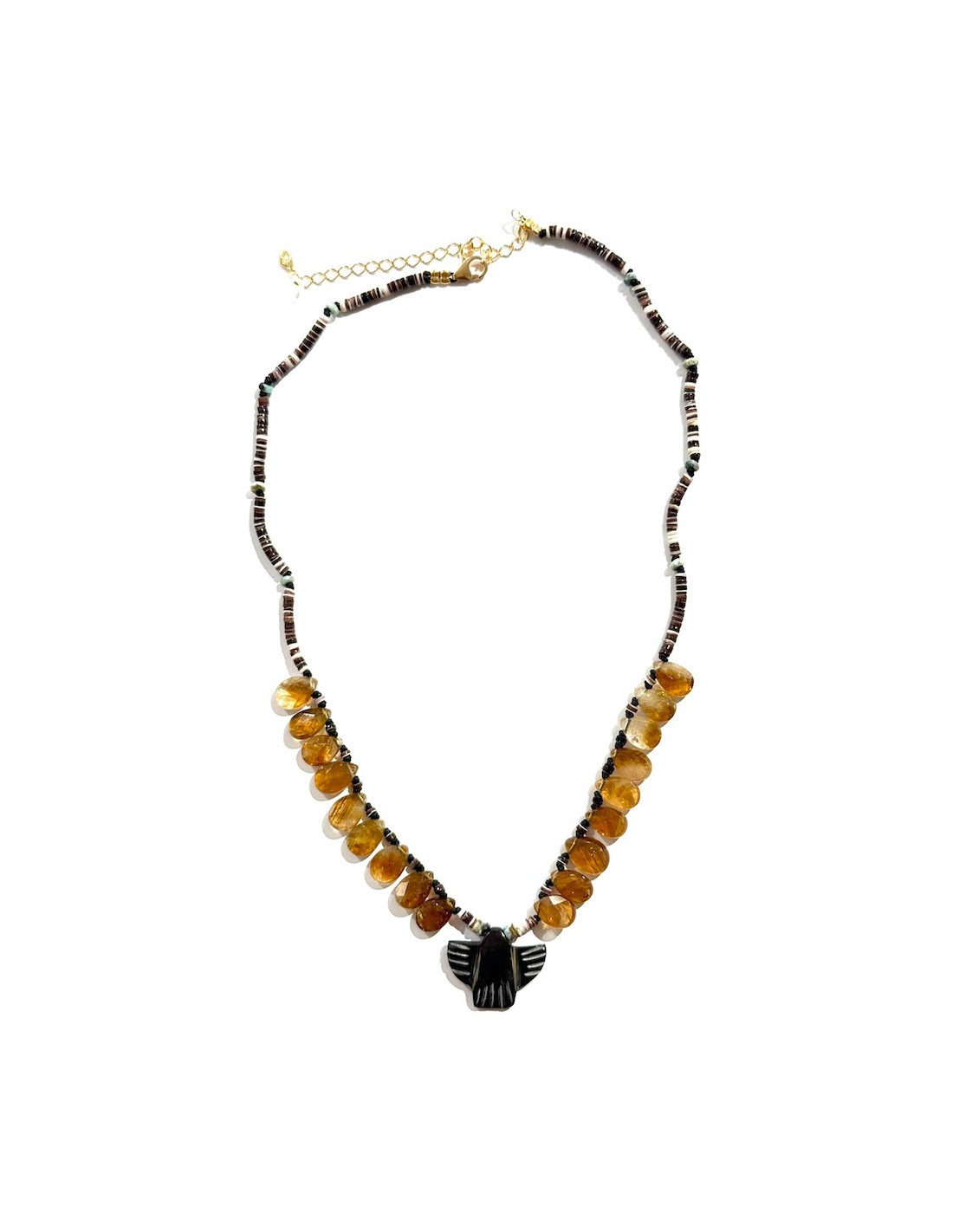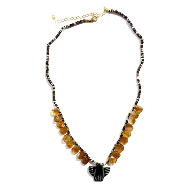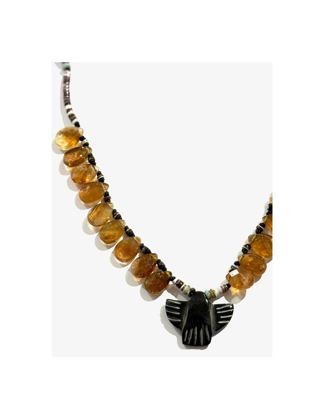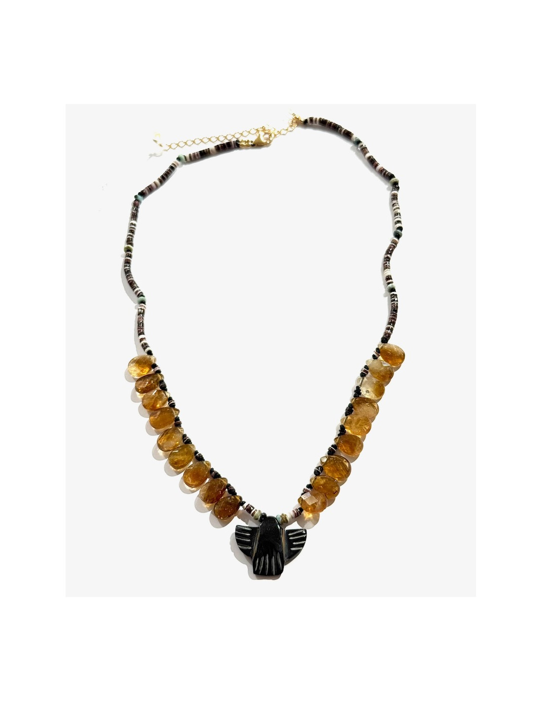 Collier tissé main, association de gouttes en citrine et de coquillage. oiseau taillé à la main en onyx.