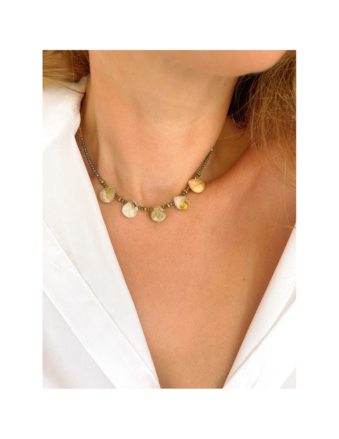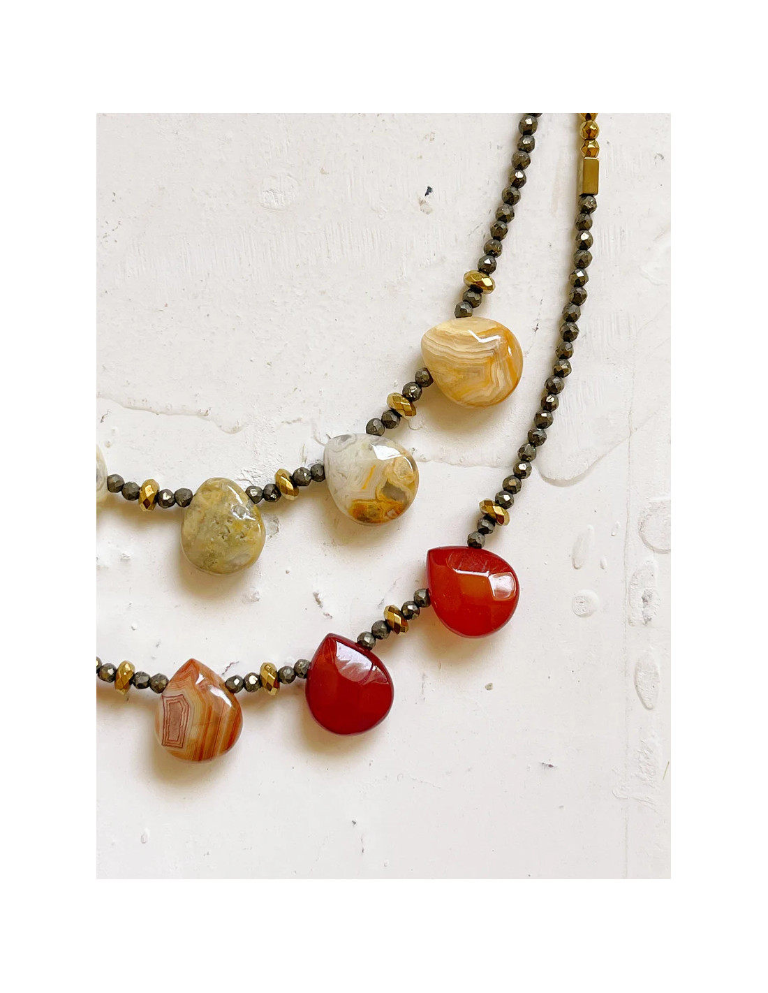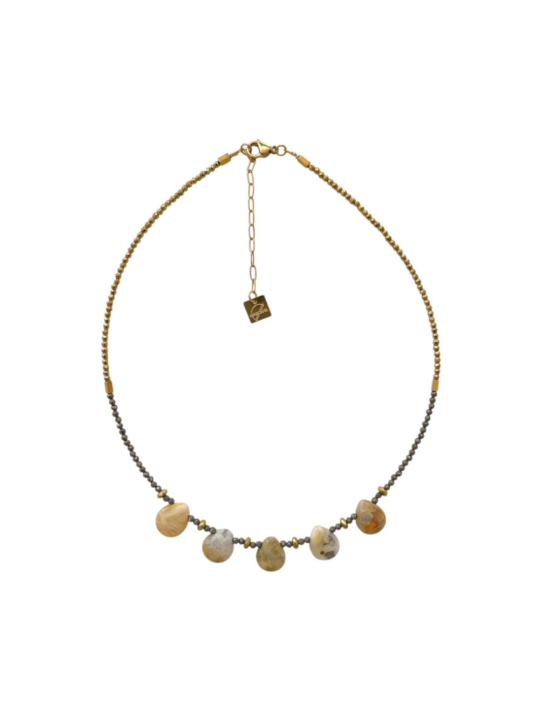 Collier plaqué or composé d'hématites, de pyrites et d'agates en forme de gouttes