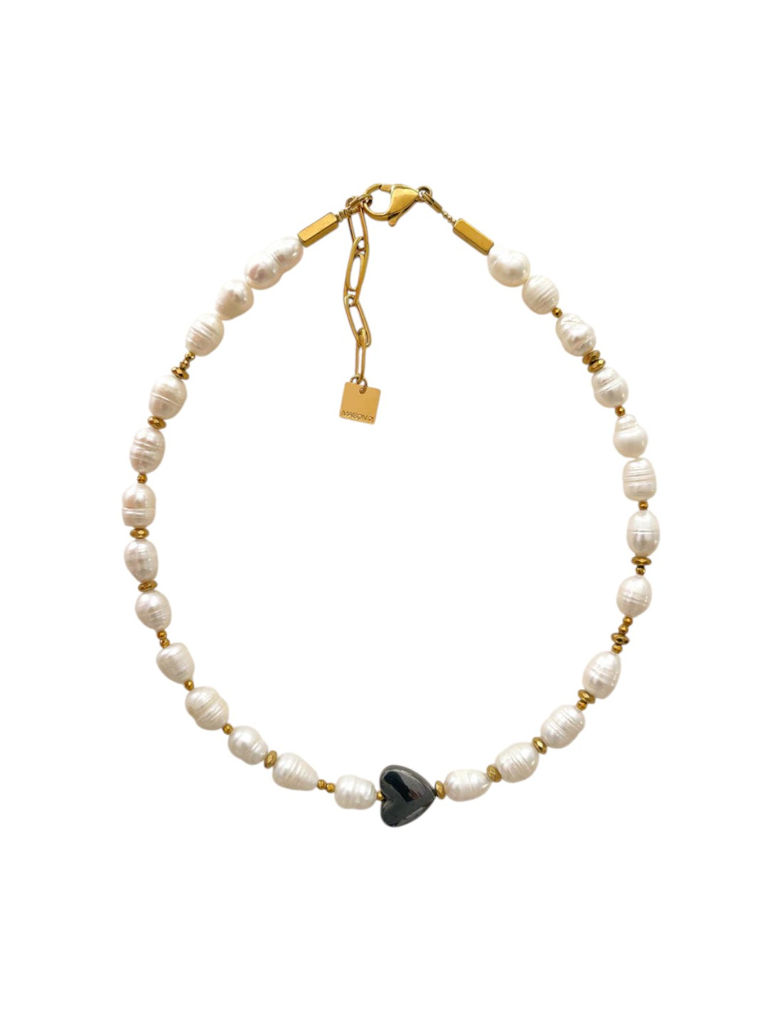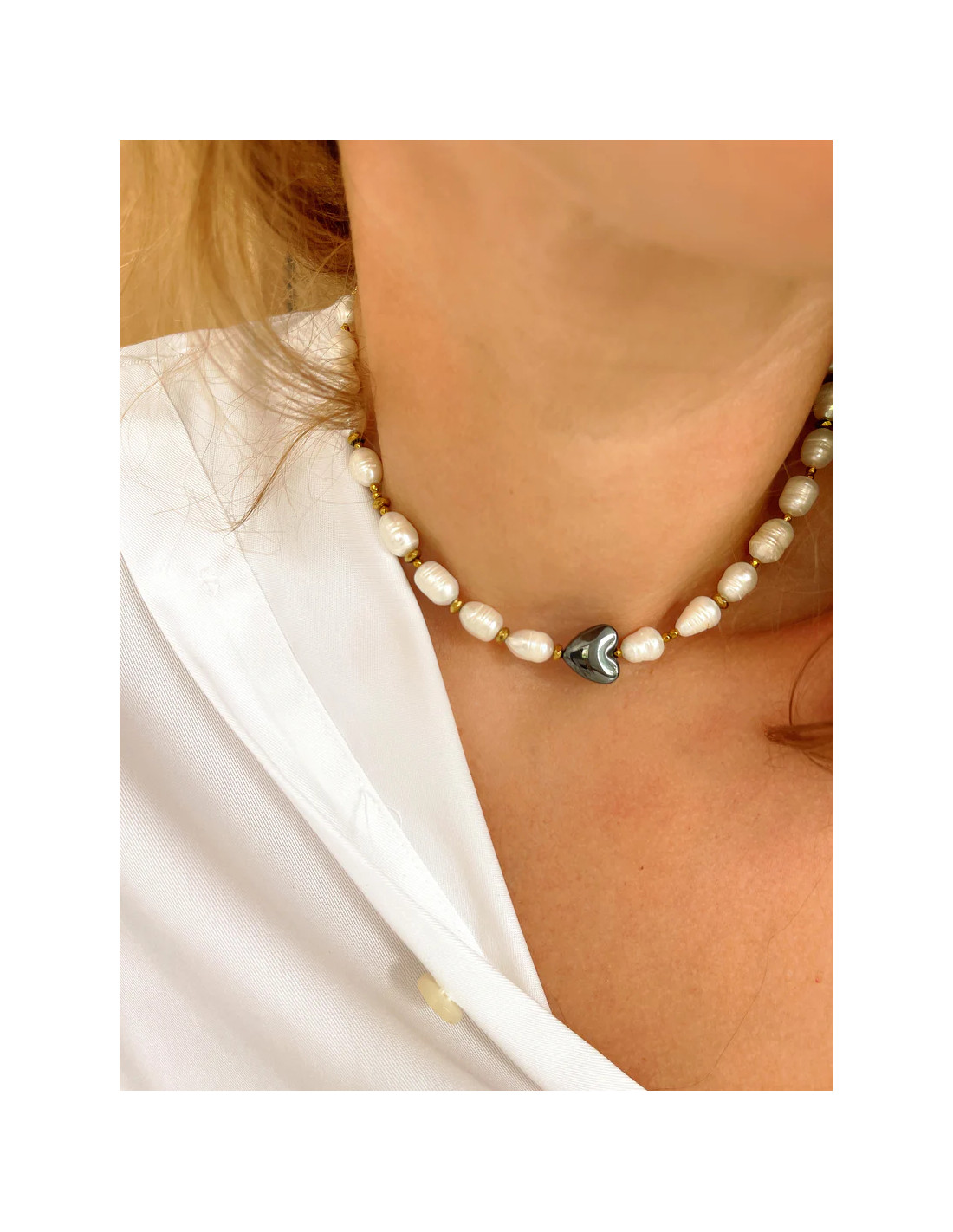 Collier composé de perles d'eau douce, d'hématites dorées et d'un coeur en hématite noire