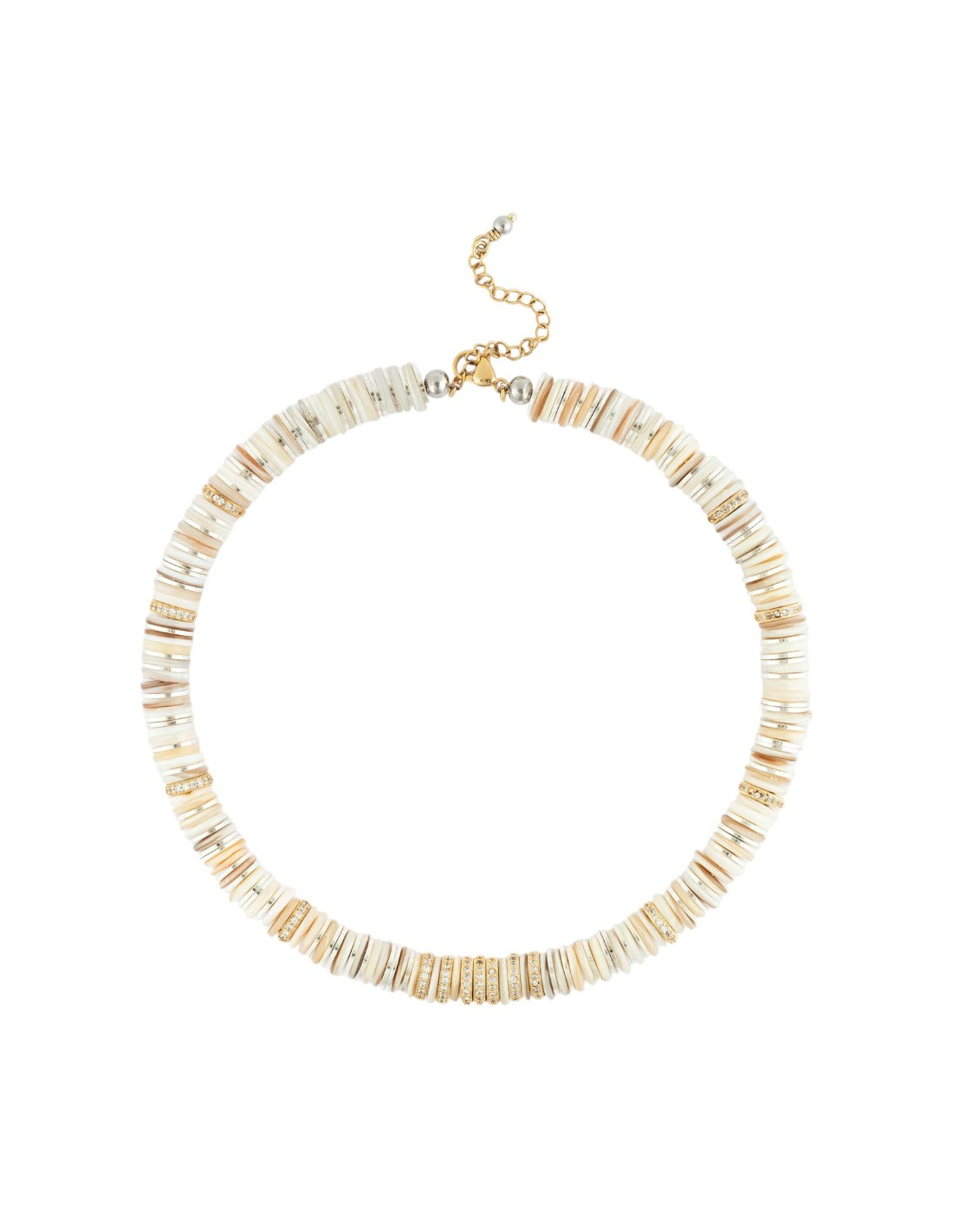 Collier mix de perles plates crème, dorées, argentées et strassées