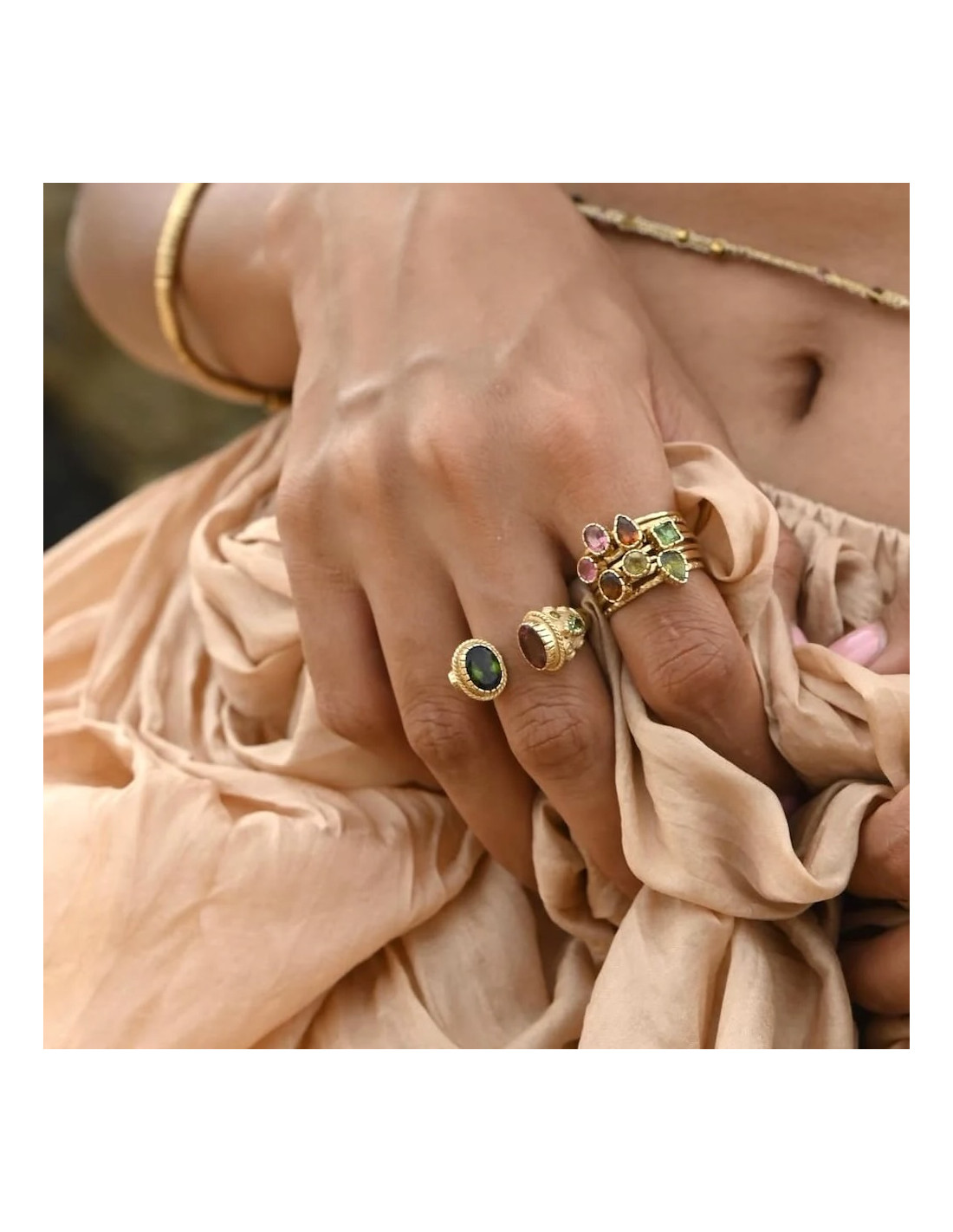 Chacun des 7 anneaux est serti de tourmalines.