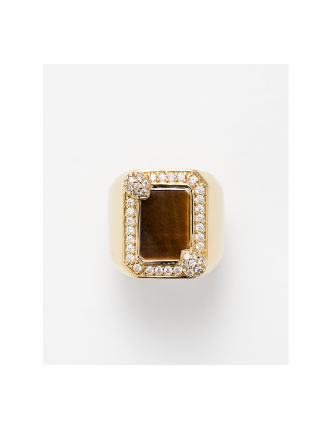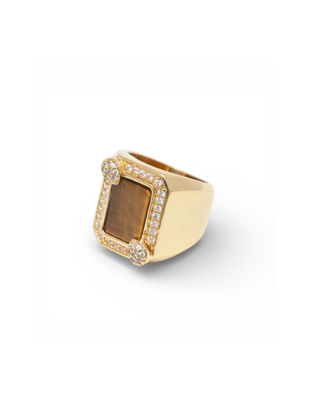 Bague chevalière en laiton plaqué or 24 carats (3 microns) sertie d'oxydes de zirconium avec pierre oeil de tigre au centre