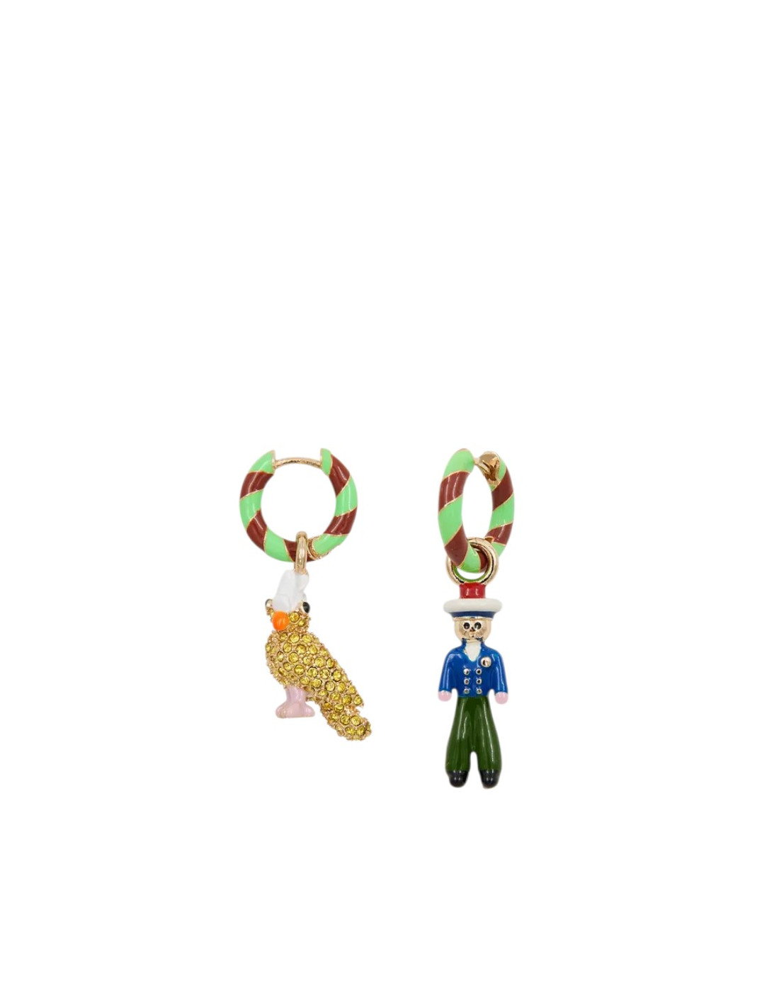 Petits anneaux verts et bruns avec deux pendentifs différents : un bonhomme émaillé et un oiseau serti de strass
