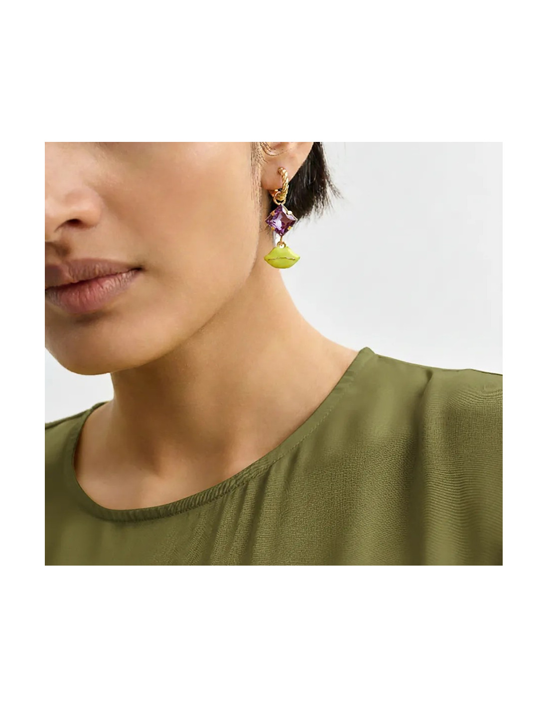 Boucles d'oreilles décalées composées d'anneaux dorés, l'un agrémenté d'une perle nacré et d'un oiseau émaillé bleu, et l'autre d'un cristal facetté violet et de lèvres émaillées jaunes
