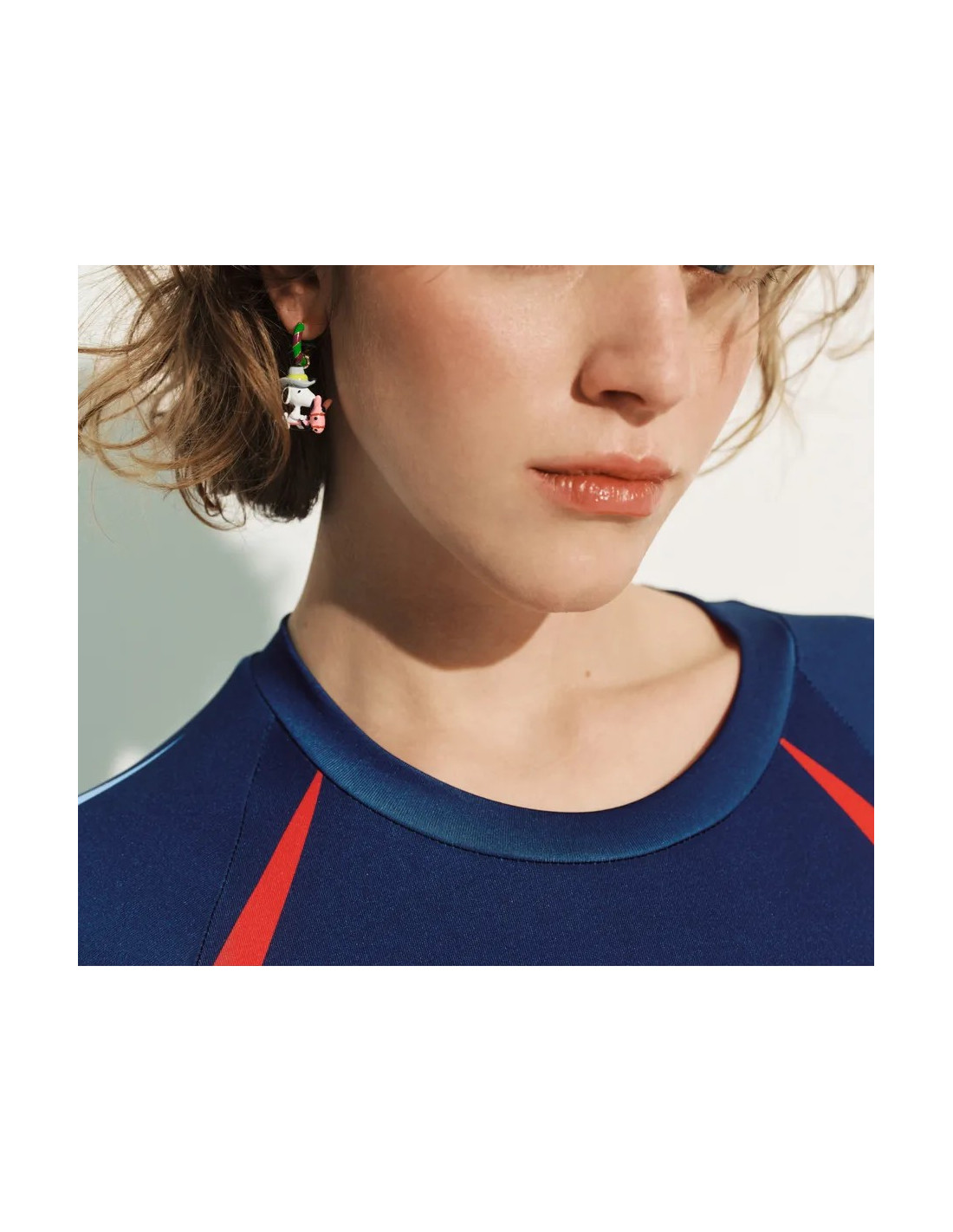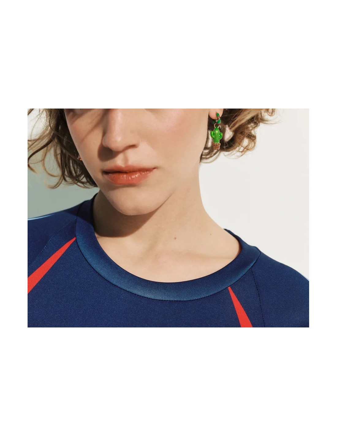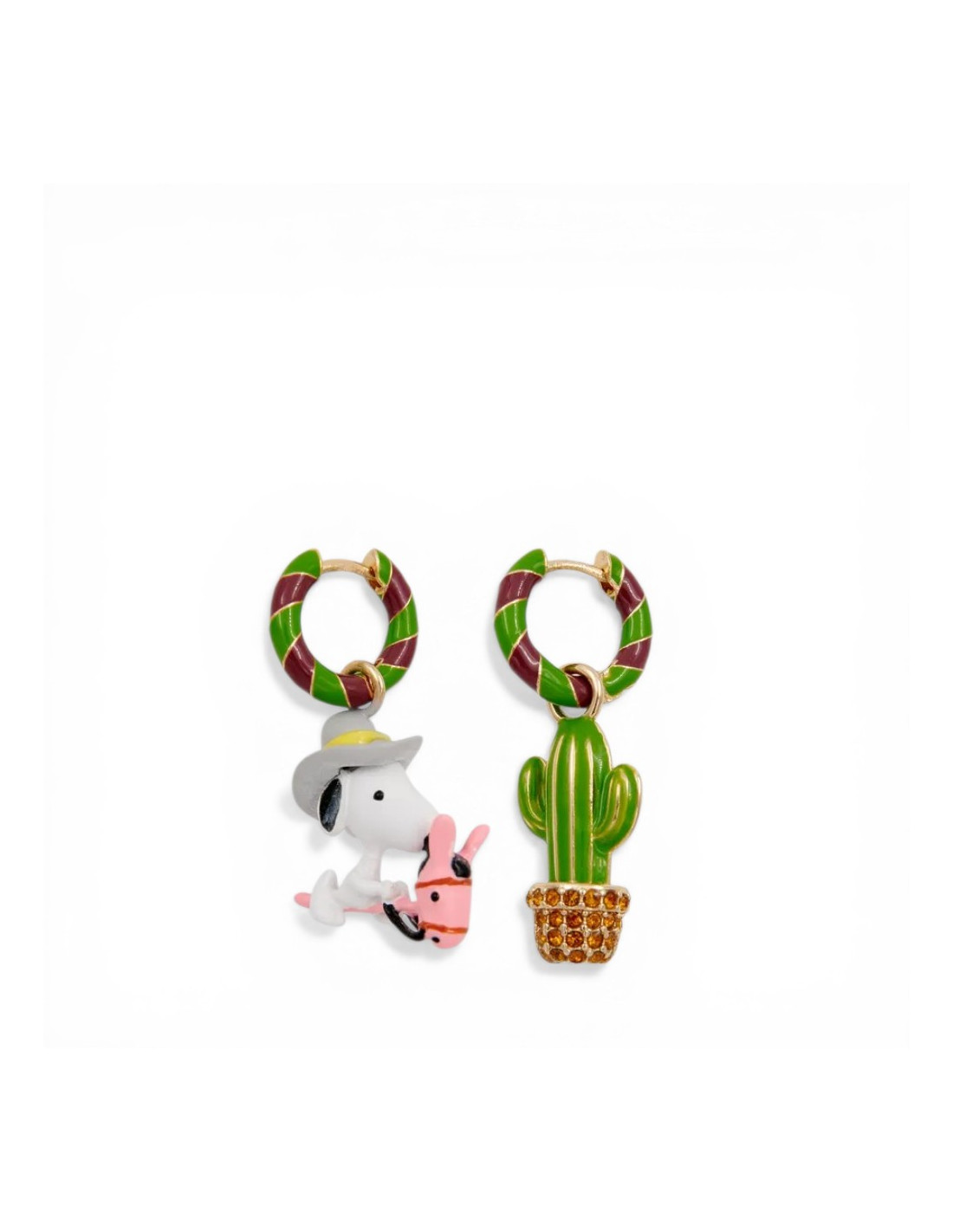 Boucles d'oreilles composées d'anneaux émaillés ornés de breloques inspirées des Peanuts : l'un est orné d'un cactus émaillé incrusté de strass et l'autre orné d'un snoopy en émail.