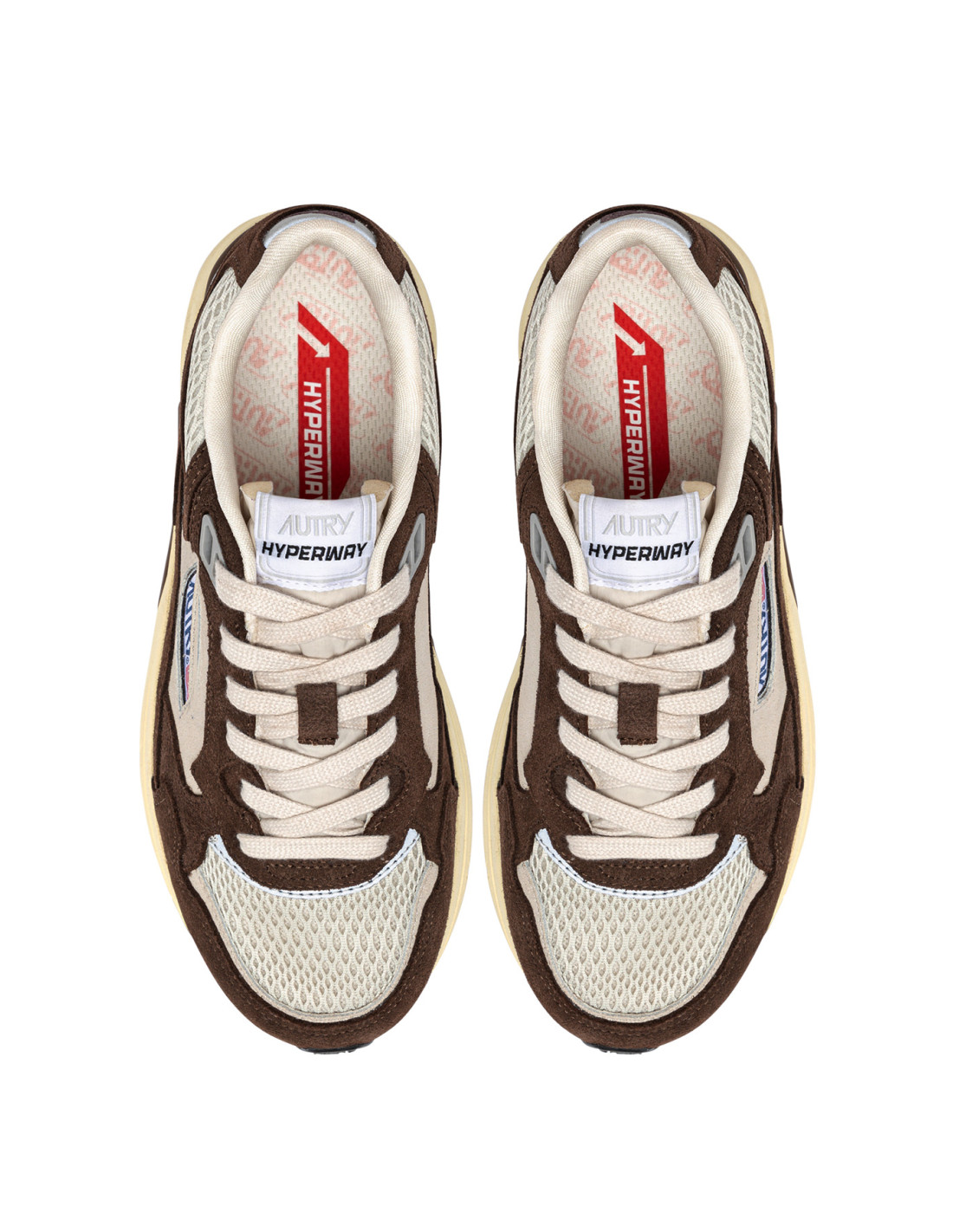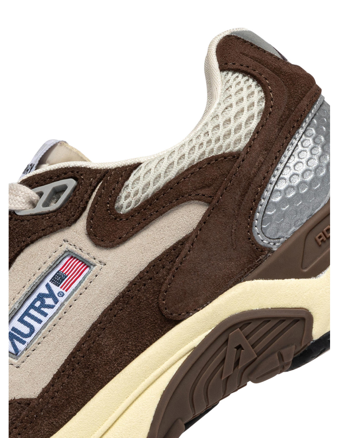 - Tige en daim marron et en mesh blanc avec détails gris argenté