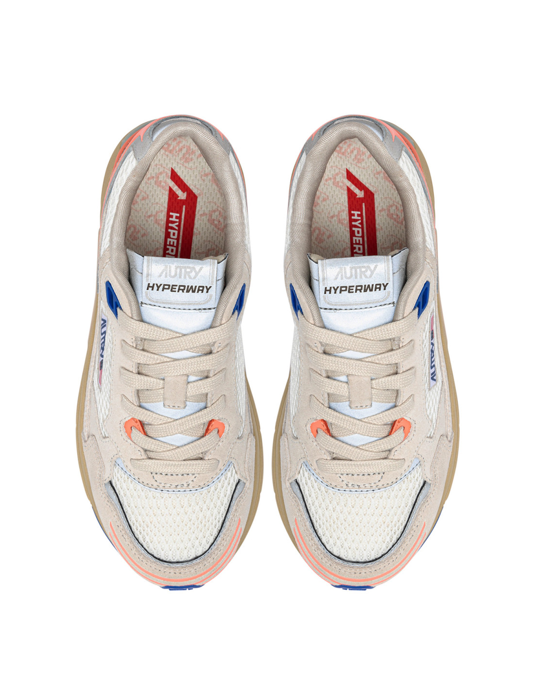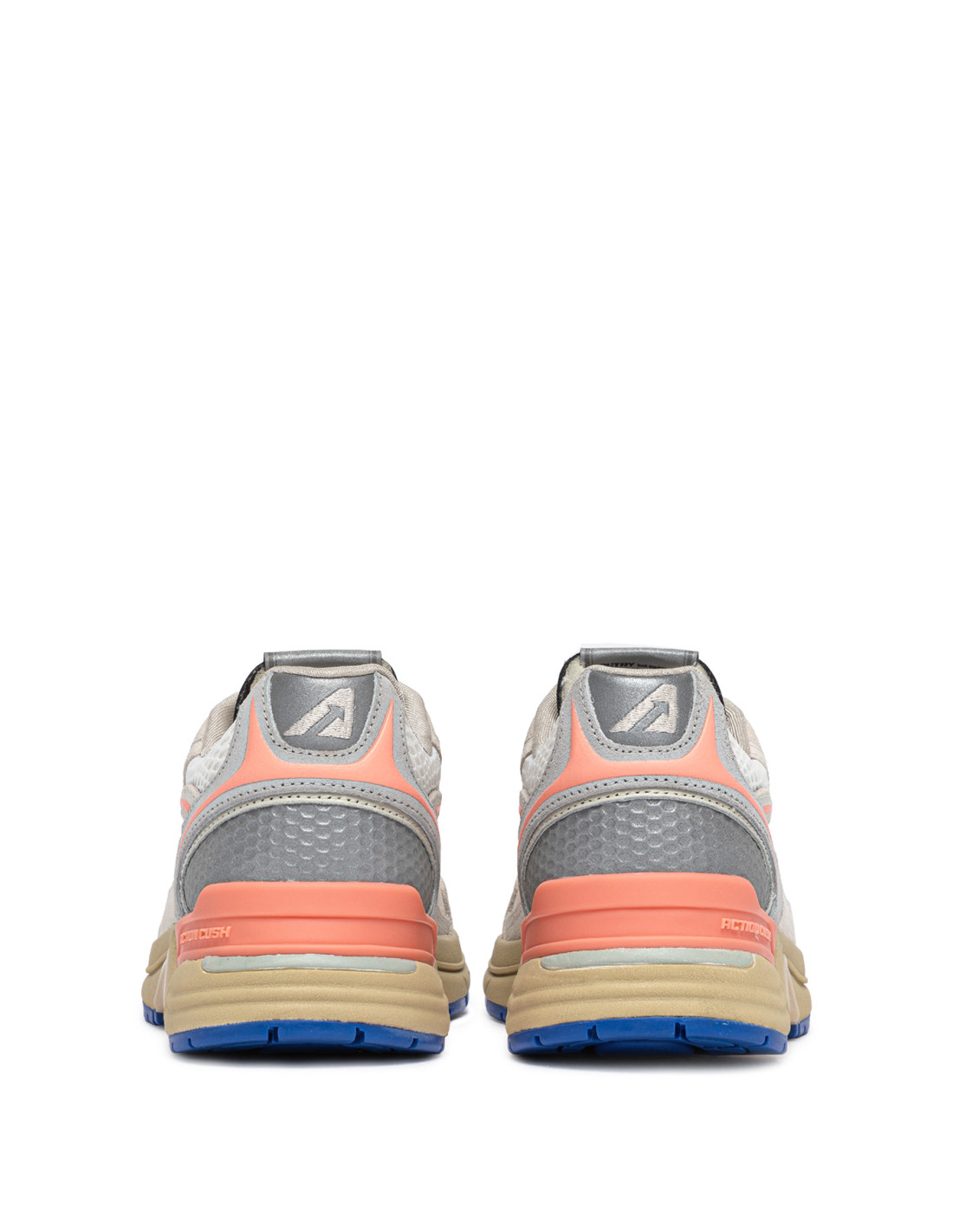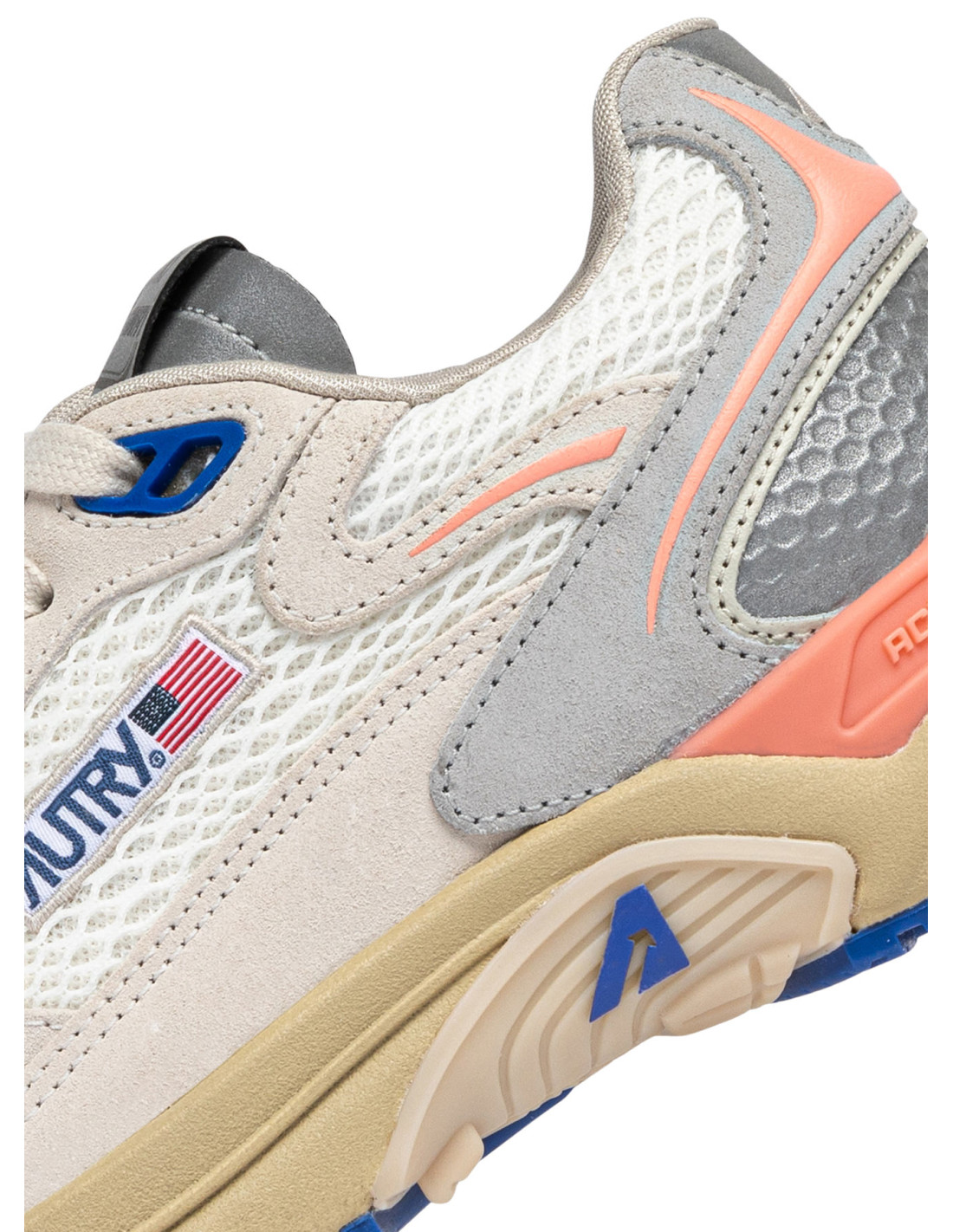 - Tige en mesh beige blanc avec empiècements en daim beige et détails gris et corail