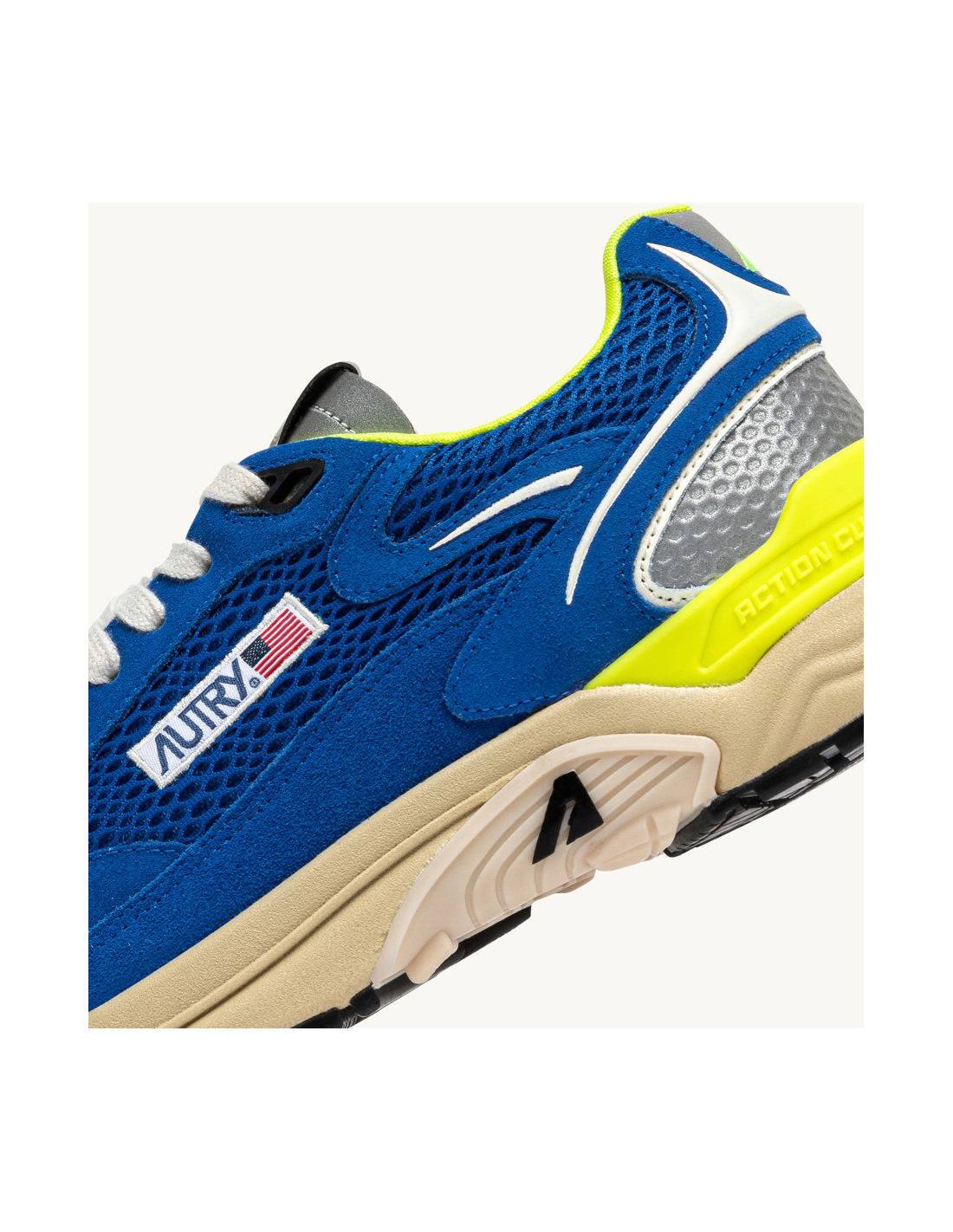 - Tige en mesh beige bleu avec empiècements en daim bleu et détails gris et jaune