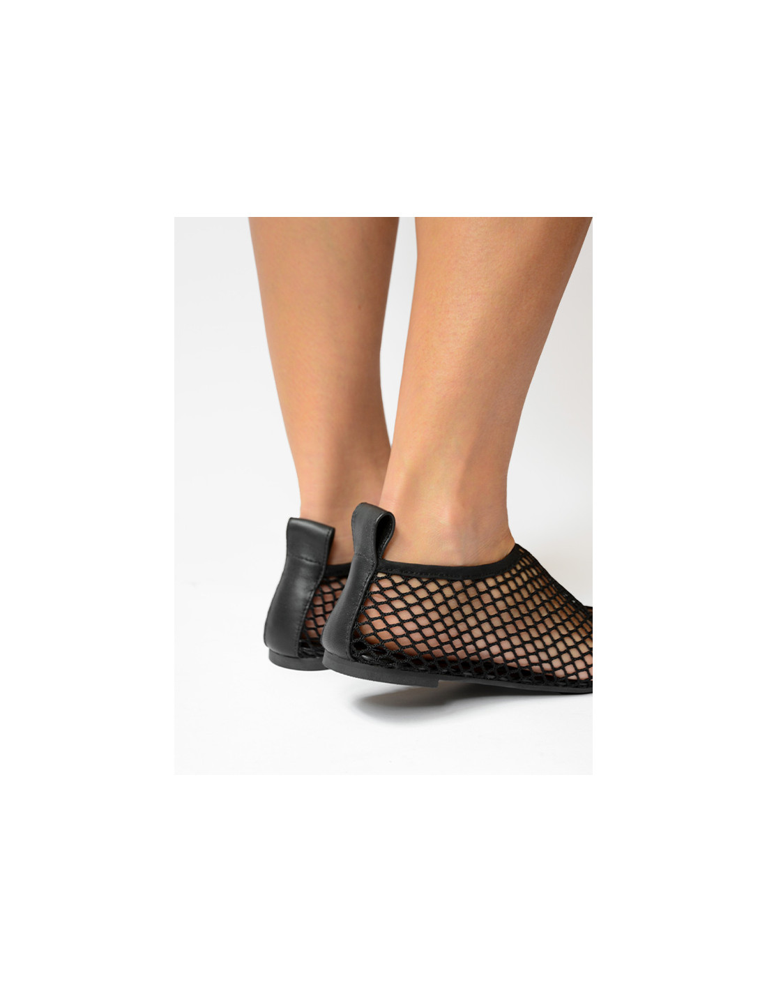 Ballerines montantes en résille noire, à bout rond et col élastiqué.