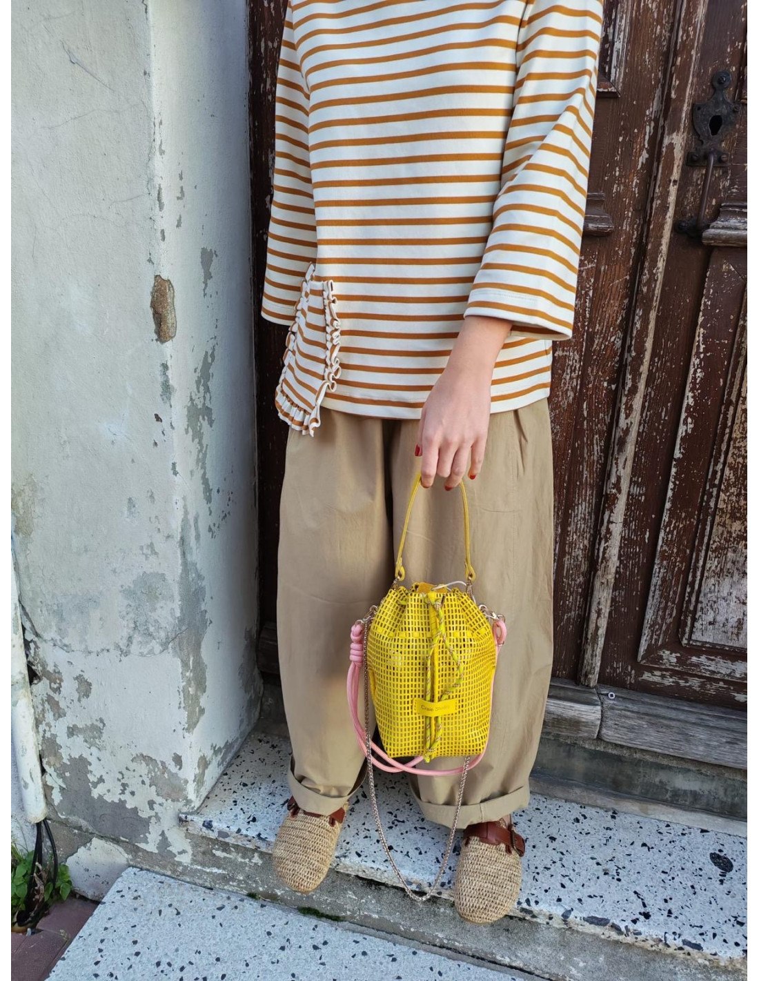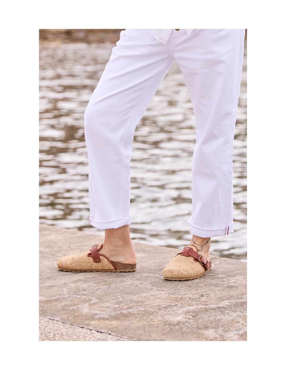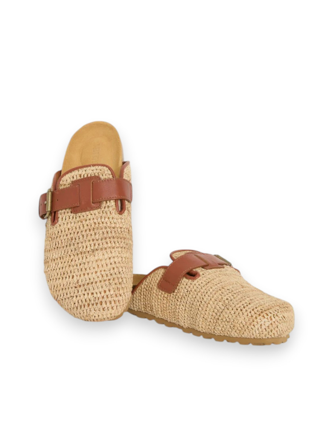 Sabots en raphia naturel crocheté main et cuir avec boucle en métal doré vieillé