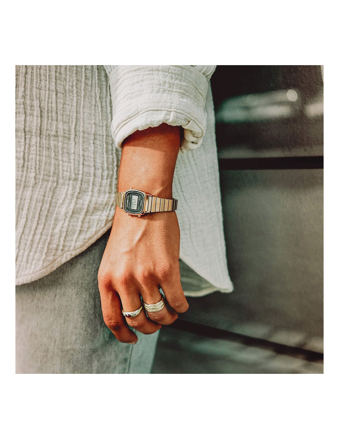 Montre numérique avec un boîtier et bracelet métallique. Elle est équipée de fonctions utiles au quotidien, telles qu'un rétroéclairage EL, un chronomètre et une alarme ainsi qu'une autonomie d'environ deux ans.