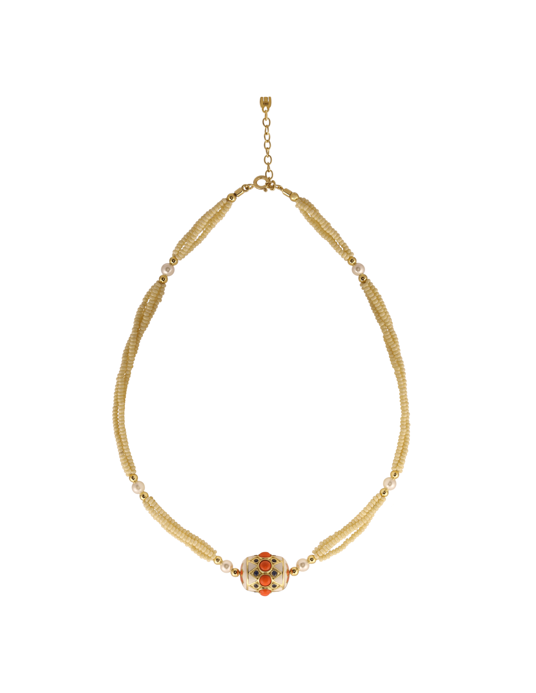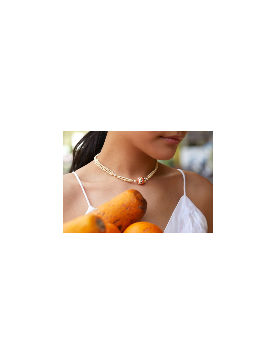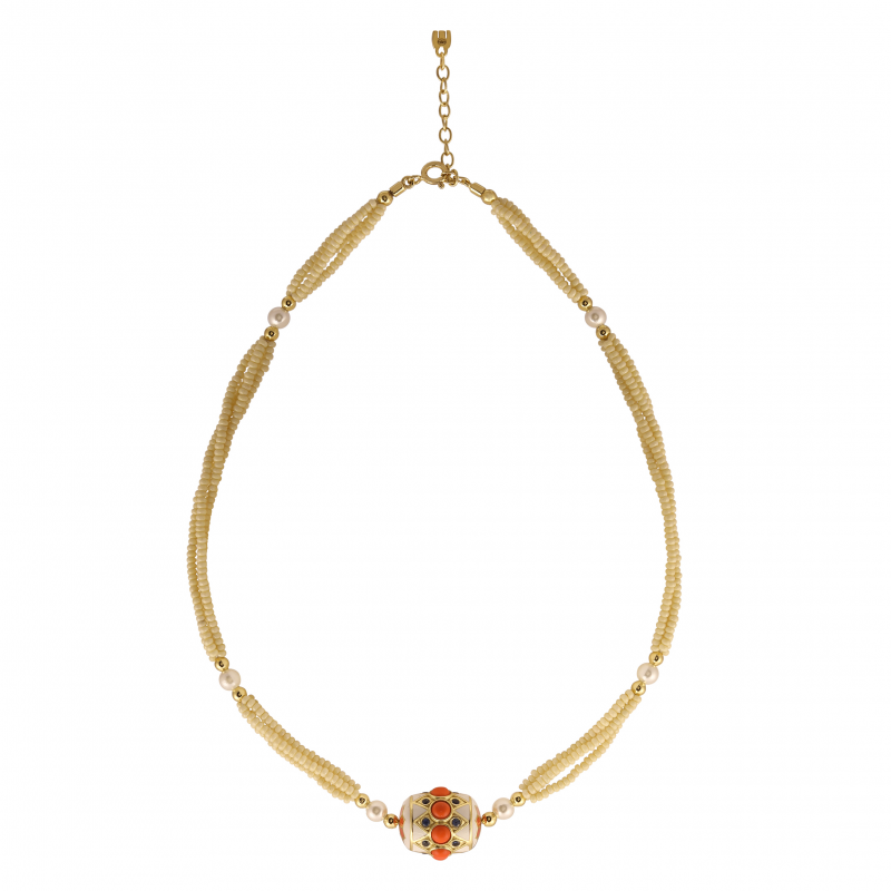 Collier inspiré des dieux afro-cubans appelés Orishas. Ceux qui aiment les Orishas et donc la Regla de Ochoa ont une protection spirituelle dans leur vie quotidienne. Le Babalawo (le prêtre), grâce à l'Oracle de l'Ifà, nommera une Orisha, comme un ange gardien, pour protéger le donneur. Chaque Orisha a sa propre couleur et son propre bijou qui représente son âme.Argent 925 plaqué or 18 caratsPierres : Cabochons ronds artificiel Corail 4mm., zircon bleu rond à facettes 1,8mm. corail rose et émail blancPerles de verre : Rondes 2mm. blanc casséTaille des perles – 17x14MM.Longueur de la chaîne réglable : 36 cm + 4 cm.Livré dans une pochette pour protéger vos bijoux au quotidien. Cette pochette est fabriquée à partir de déchets de tissu par des femmes afghanes qui font partie d'une ONG travaillant avec les réfugiés.Livraison gratuite en France métropolitaine à partir de 150€ d'achat.
