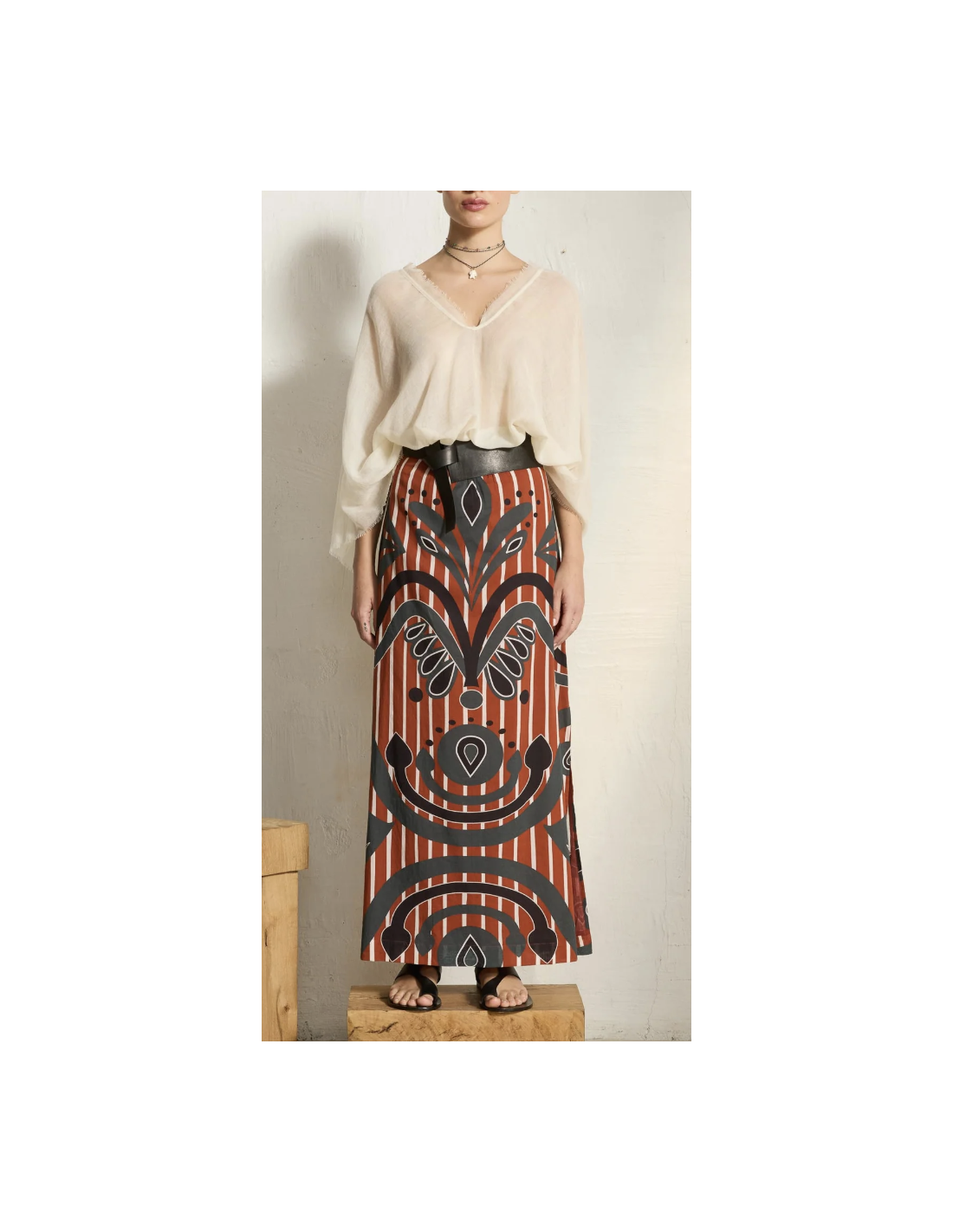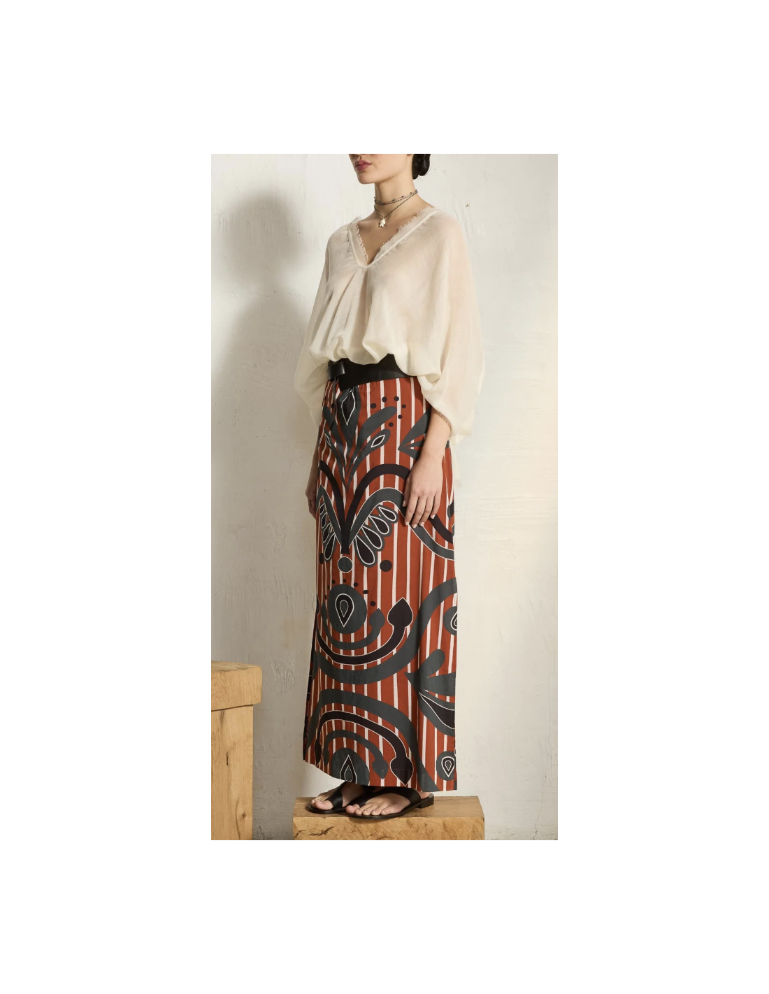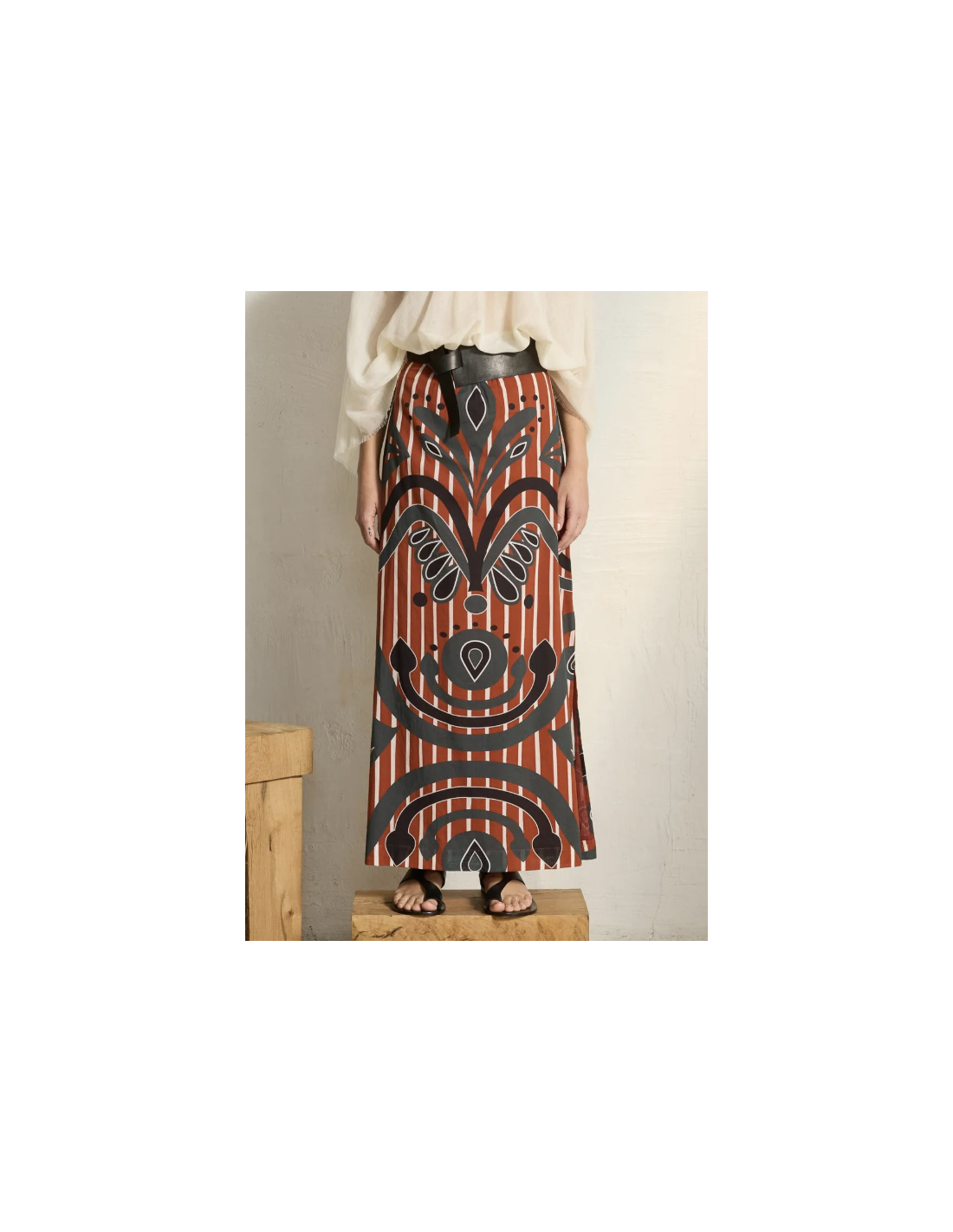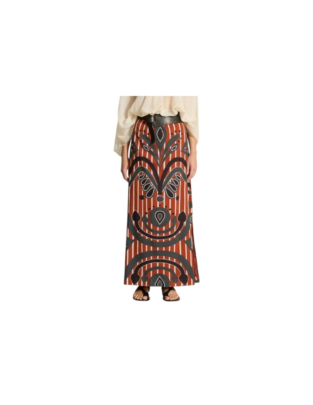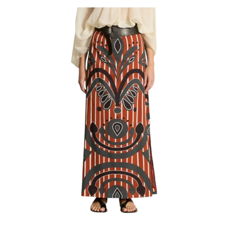 Jupe longue en voile de coton imprimé rouge/gris