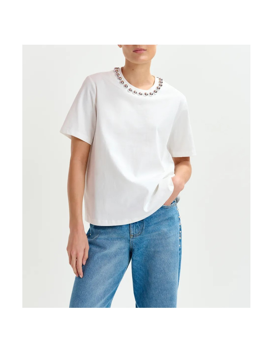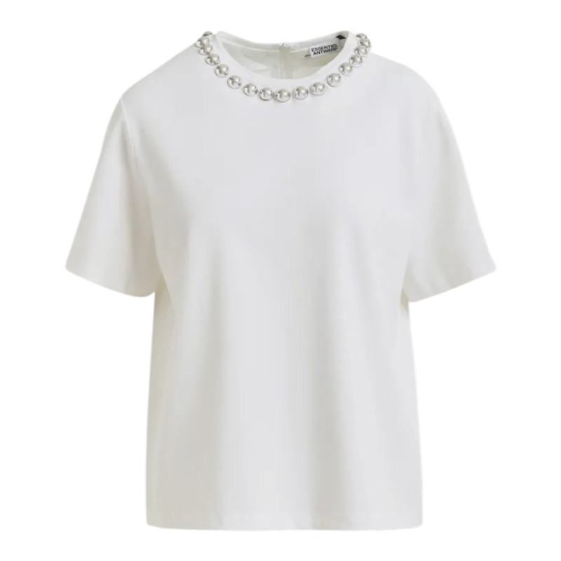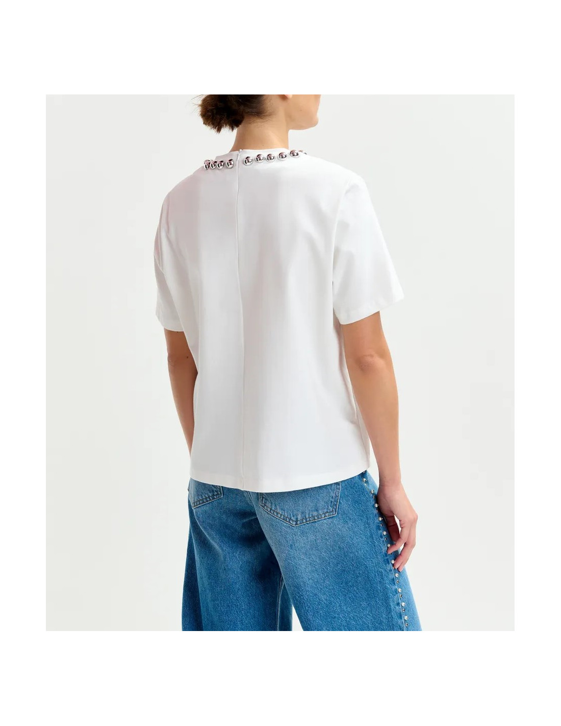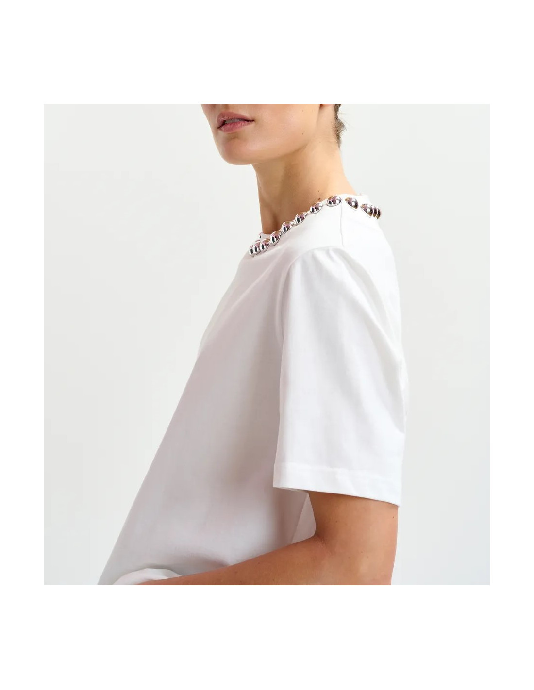 T-shirt blanc col bijou perles argentées