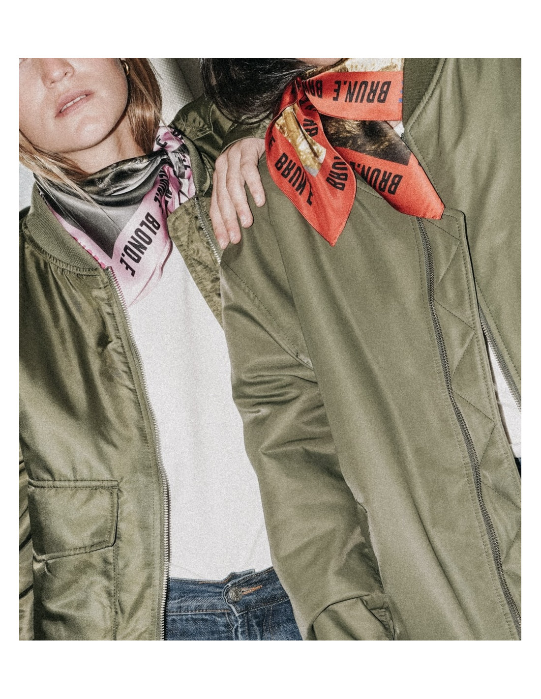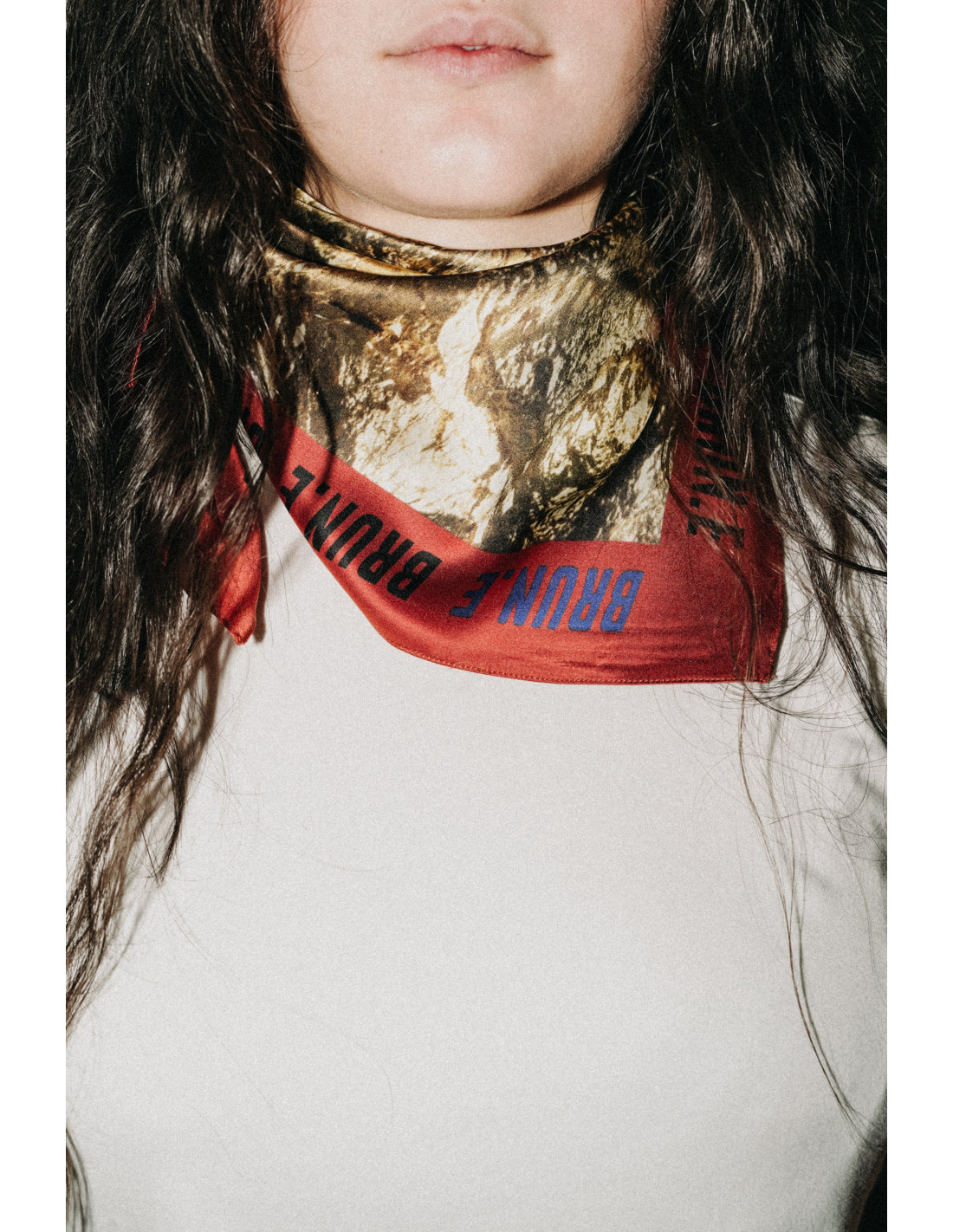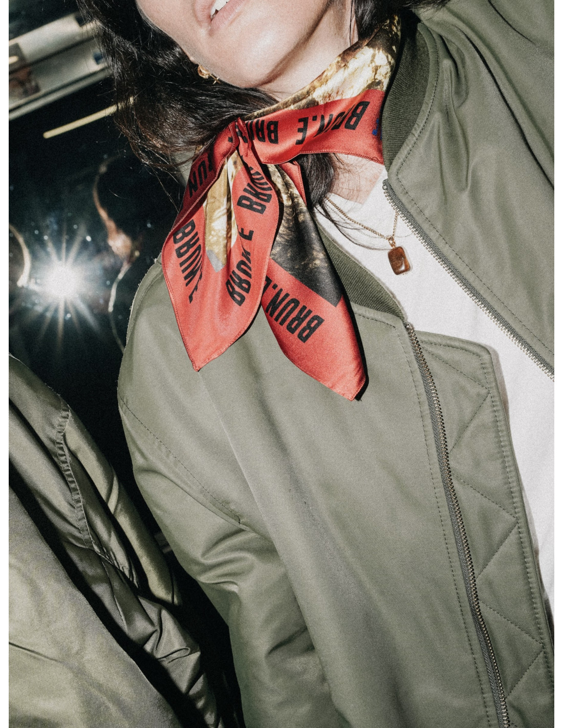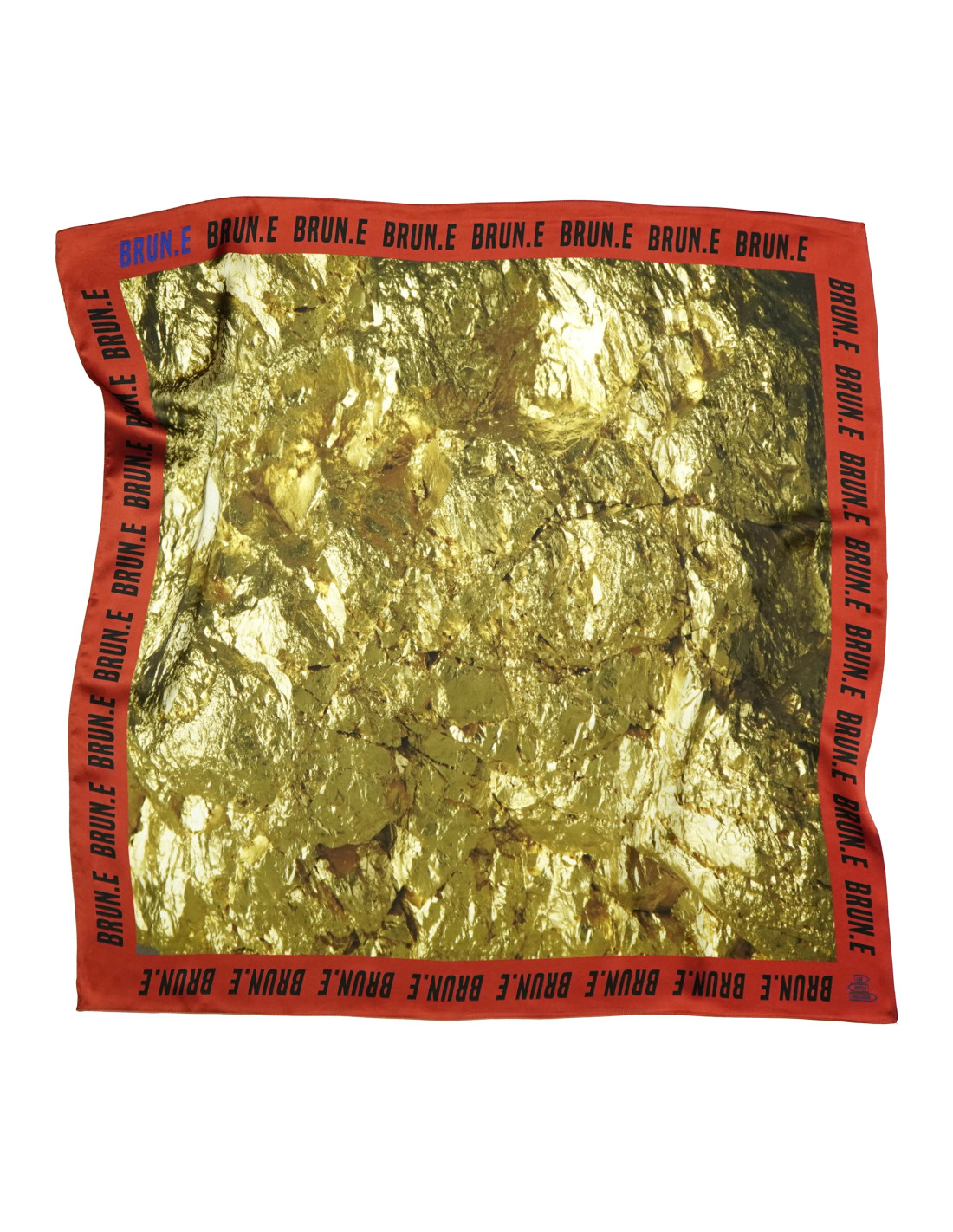 Carré de soie imprimé feuille d'or, bord contrasté rouge avec écriture.