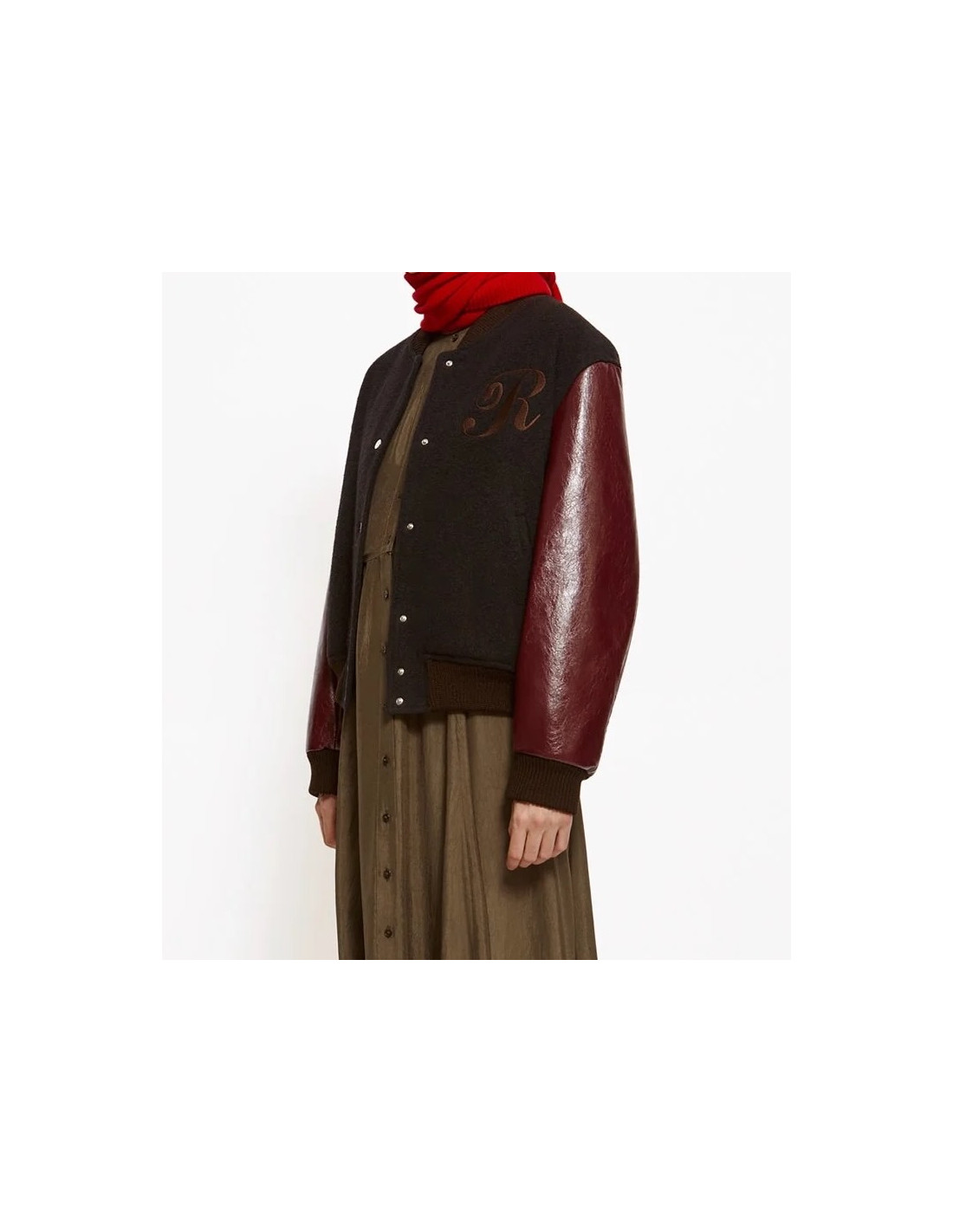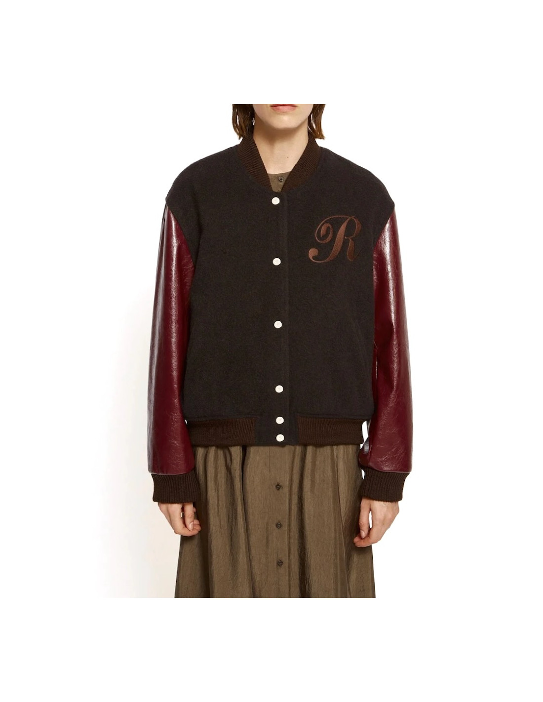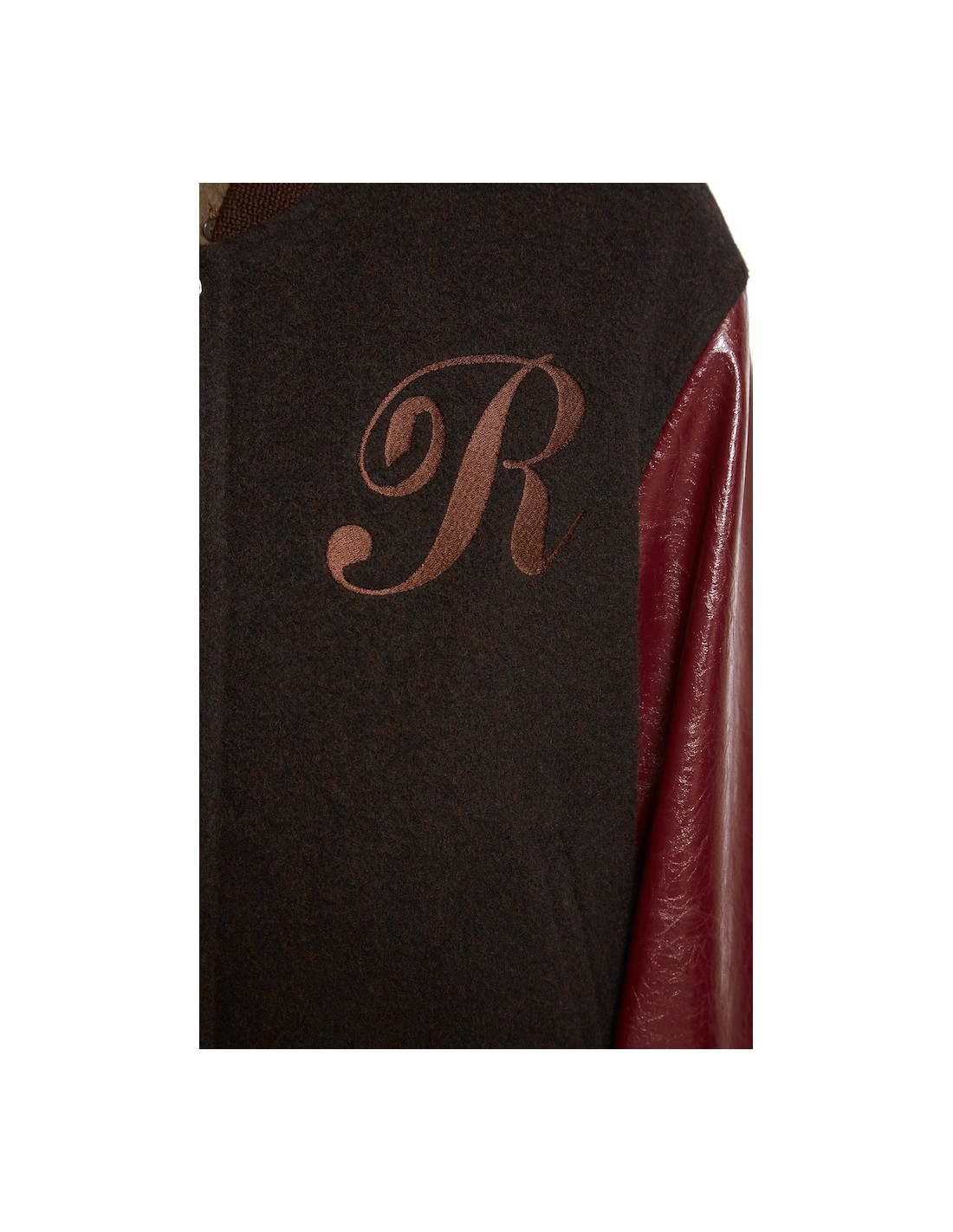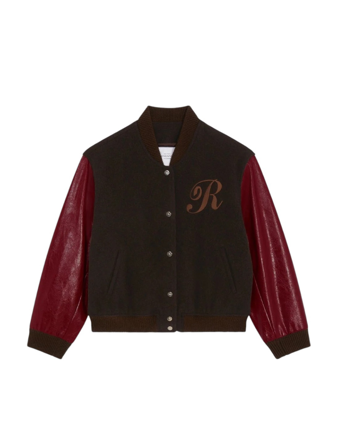 Blouson Teddy bi-matière en laine et vernis, esprit varsity, avec broderie "R" sur la poitrine.