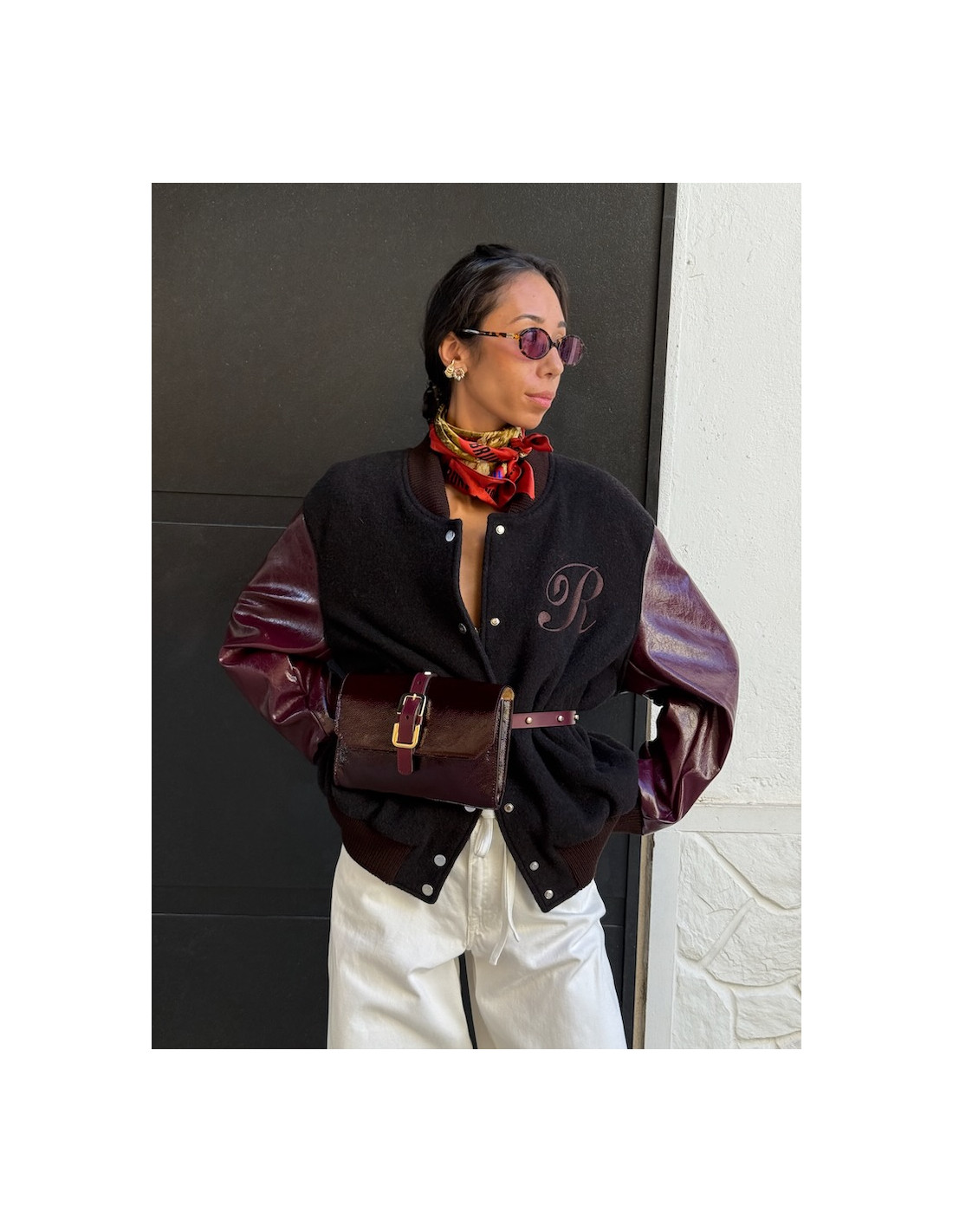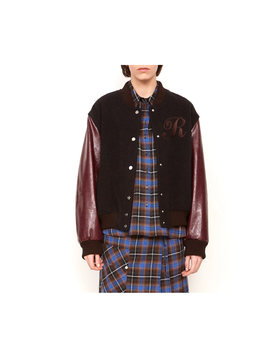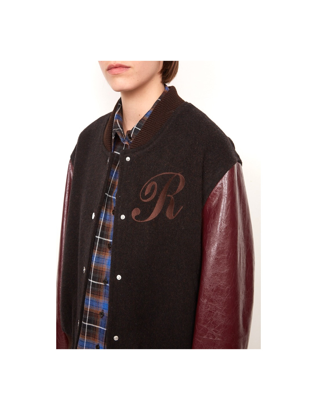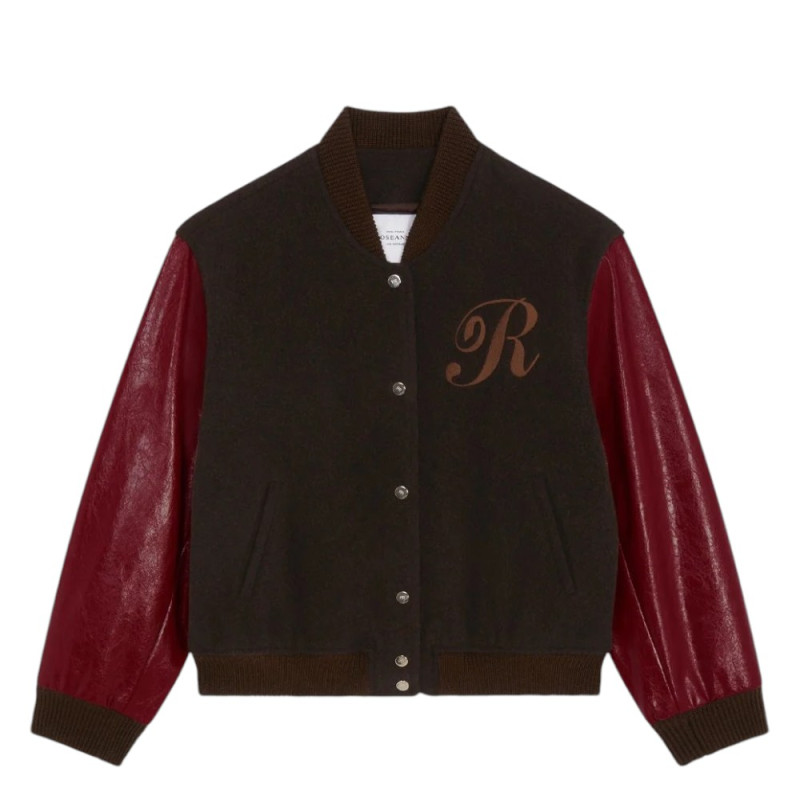 Blouson Teddy bi-matière en laine et vernis, esprit varsity, avec broderie "R" sur la poitrine.