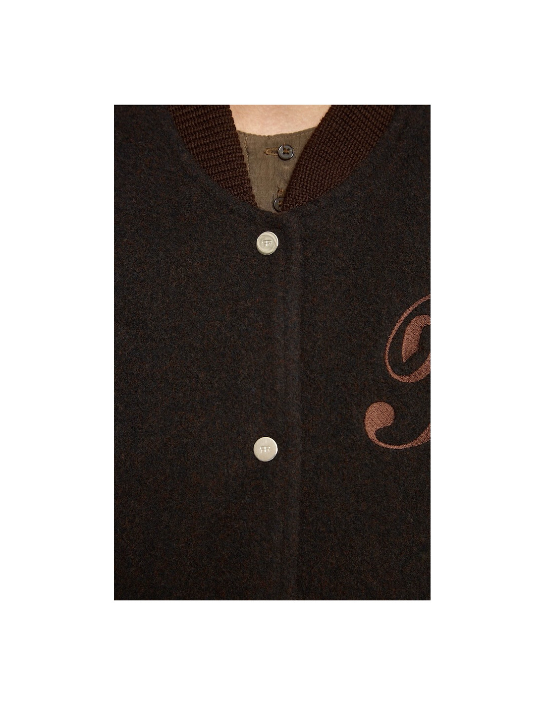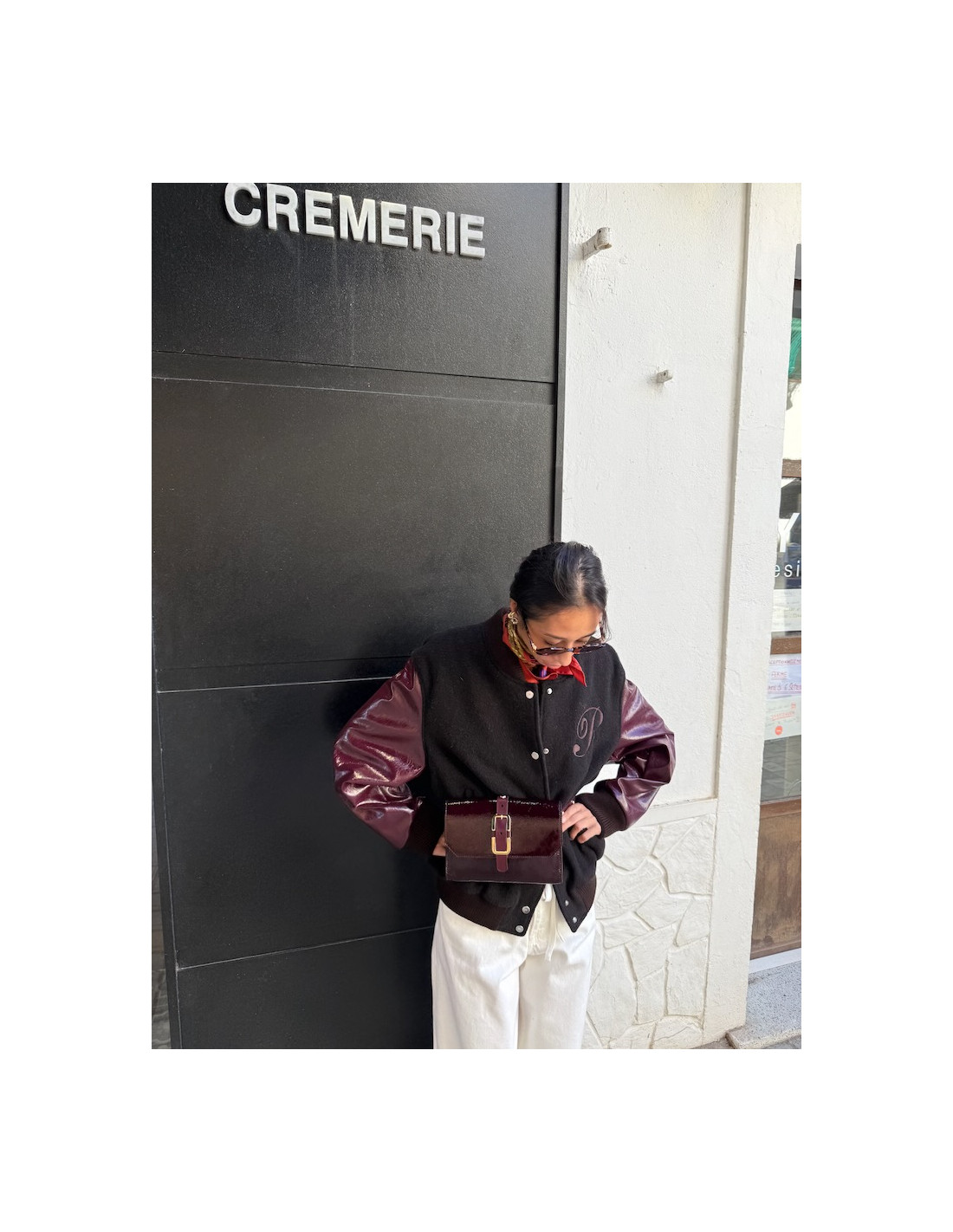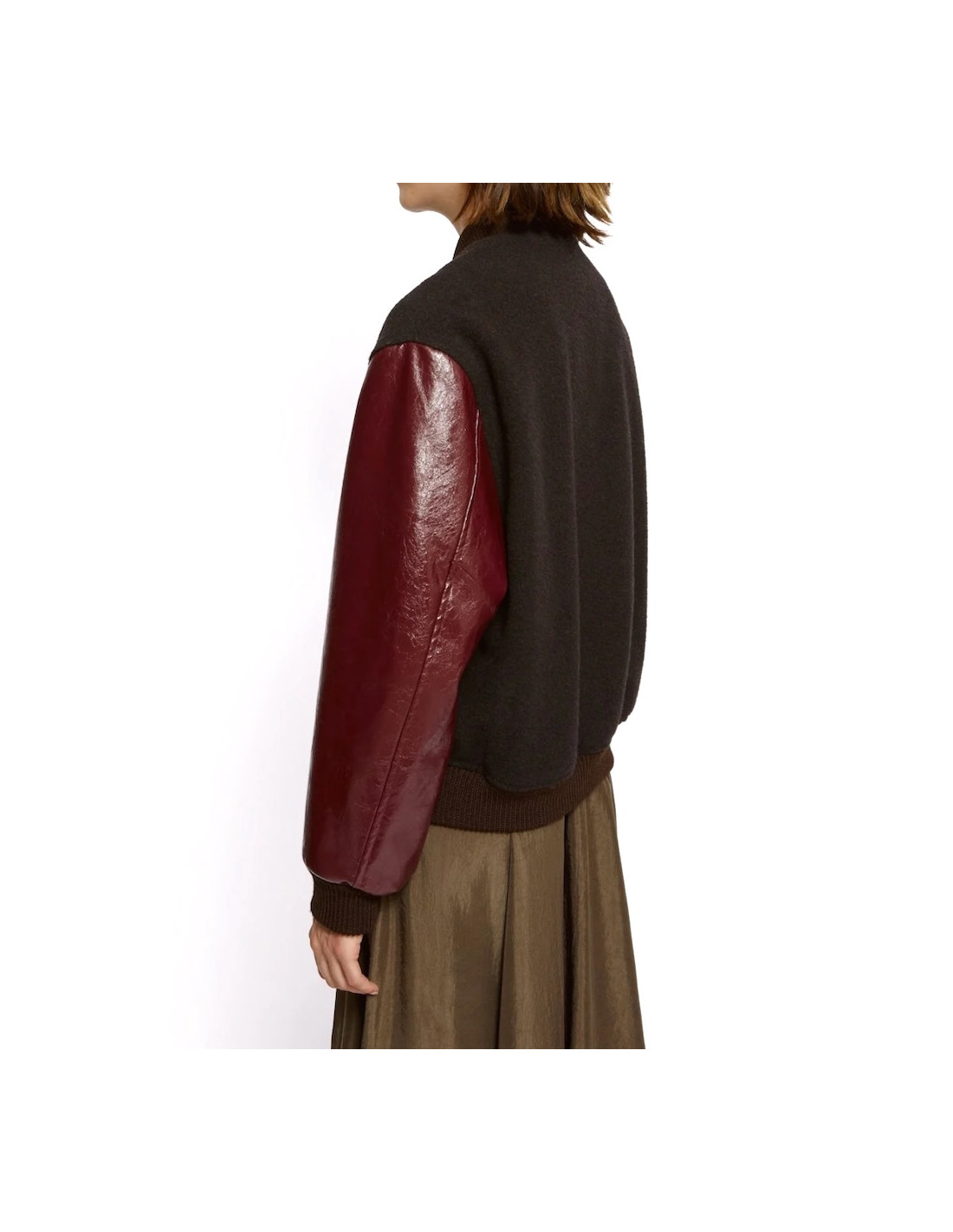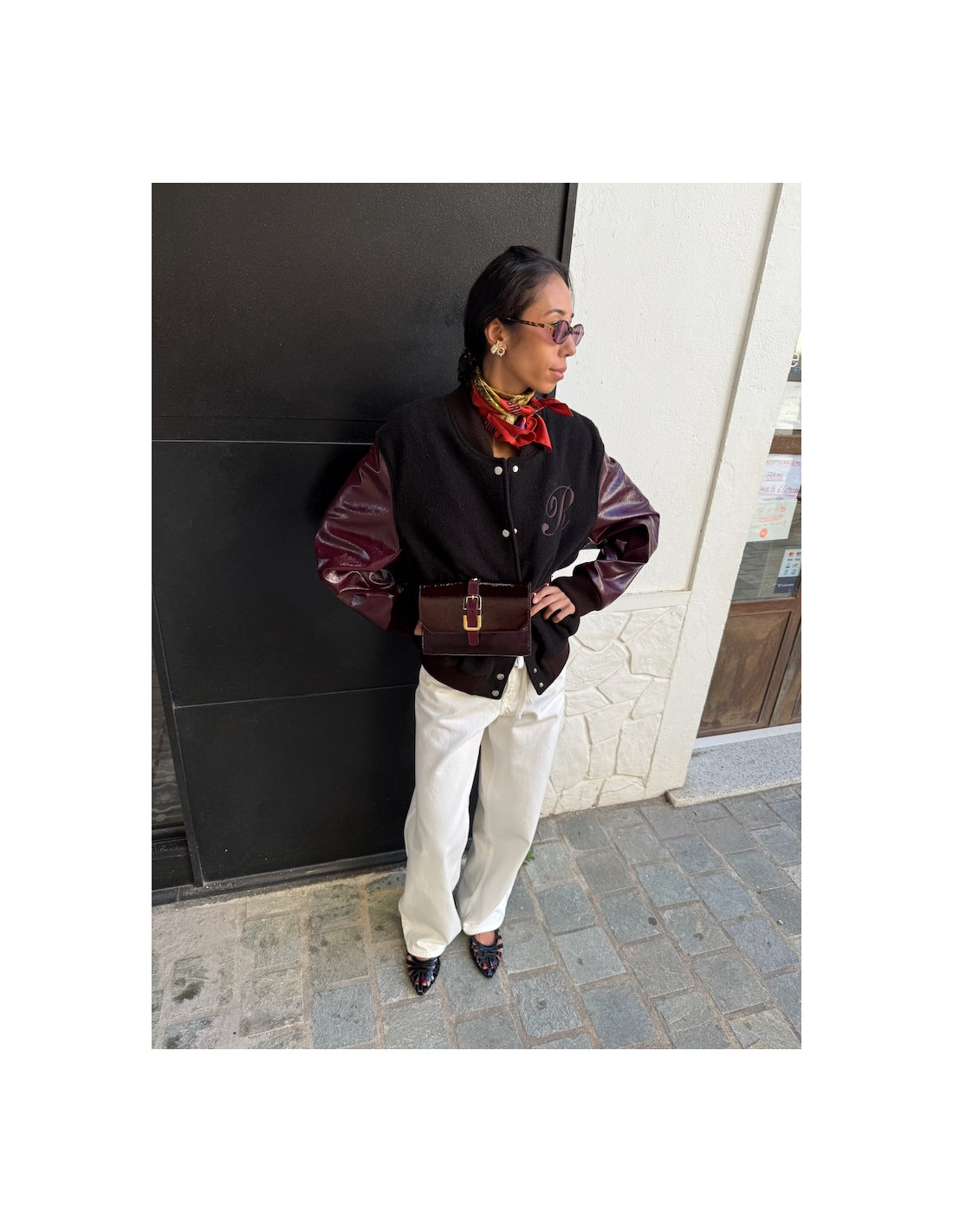 Blouson Teddy bi-matière en laine et vernis, esprit varsity, avec broderie "R" sur la poitrine.