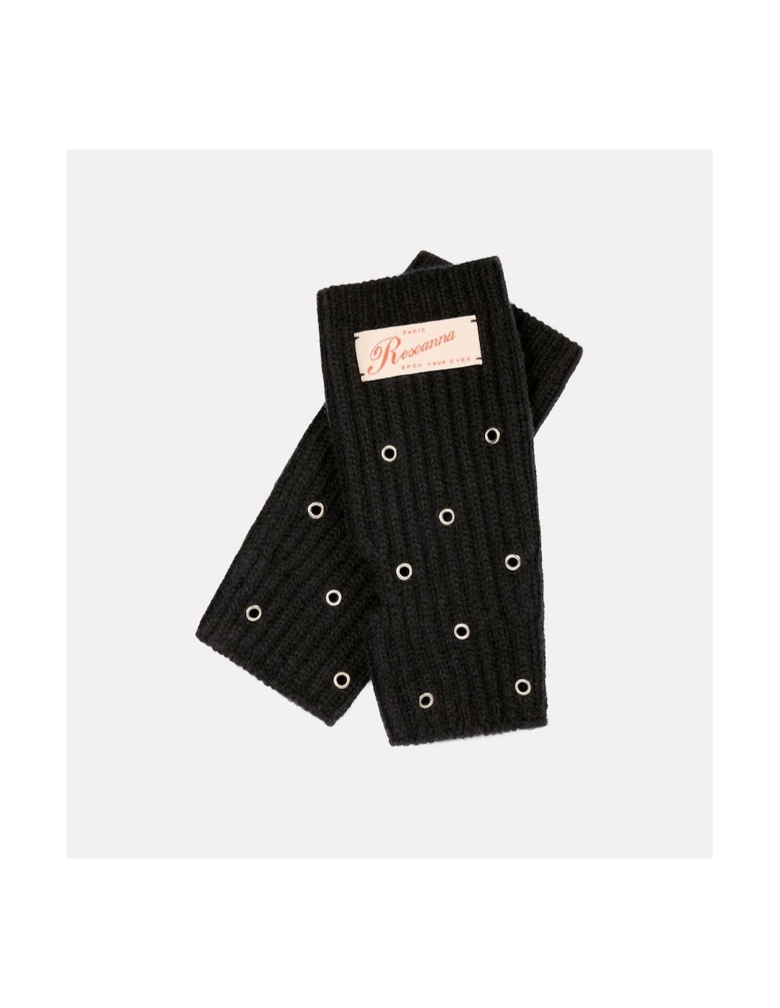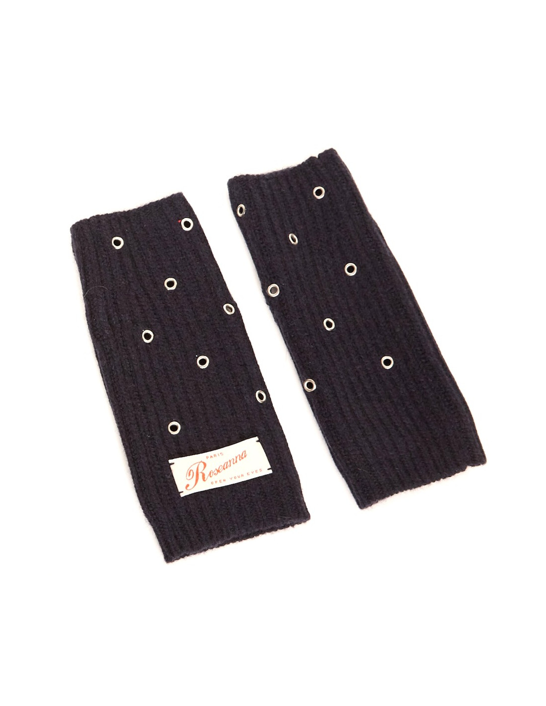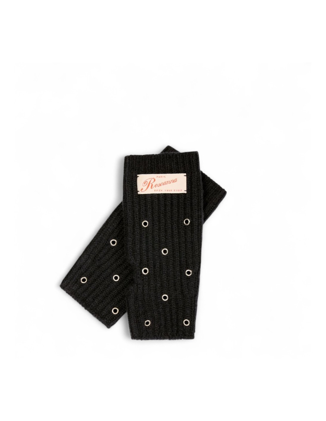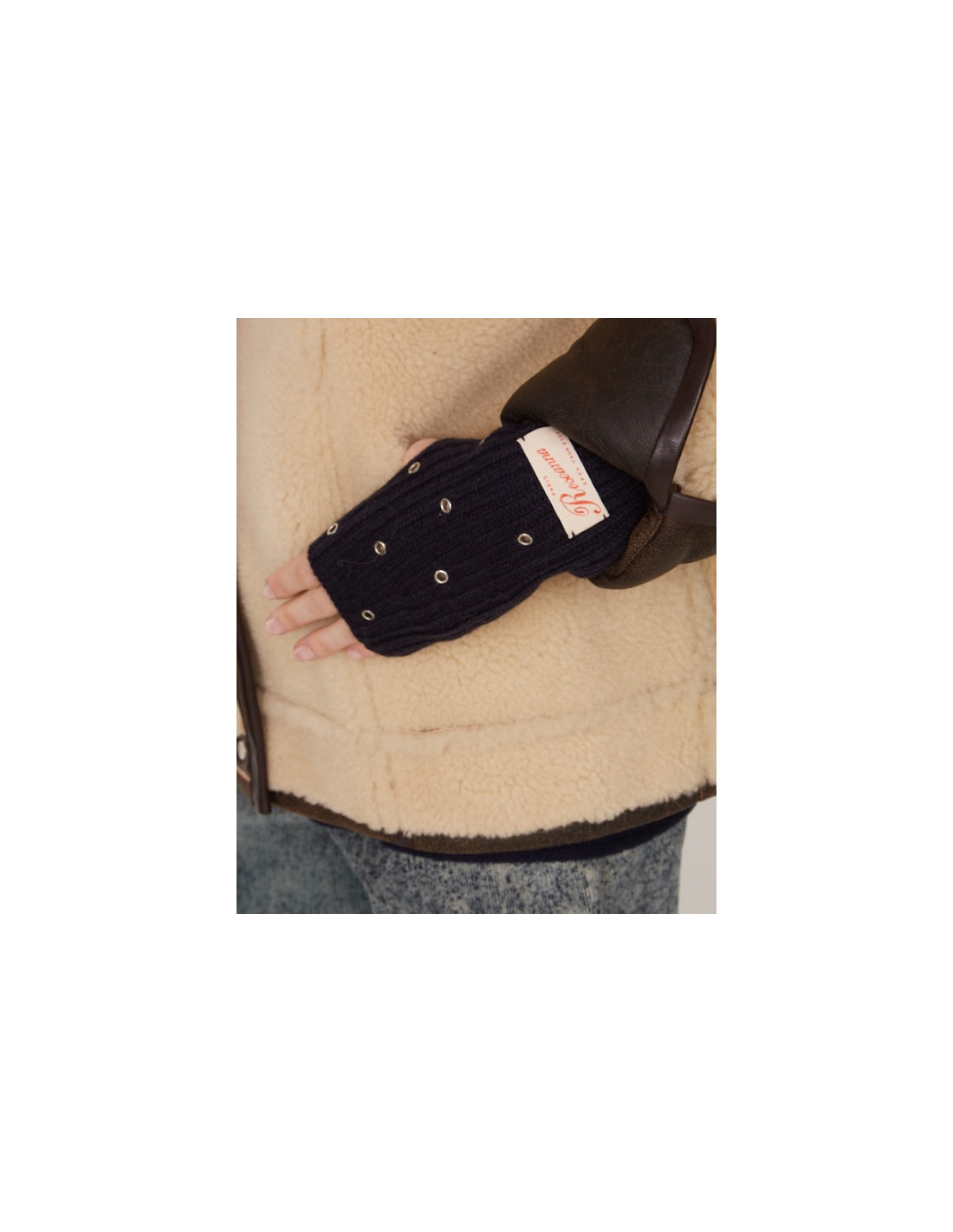 Ces mitaines en maille côtelée sont rehaussées d'œillets métalliques posés à la main, pour une touche de modernité discrète et travaillée.