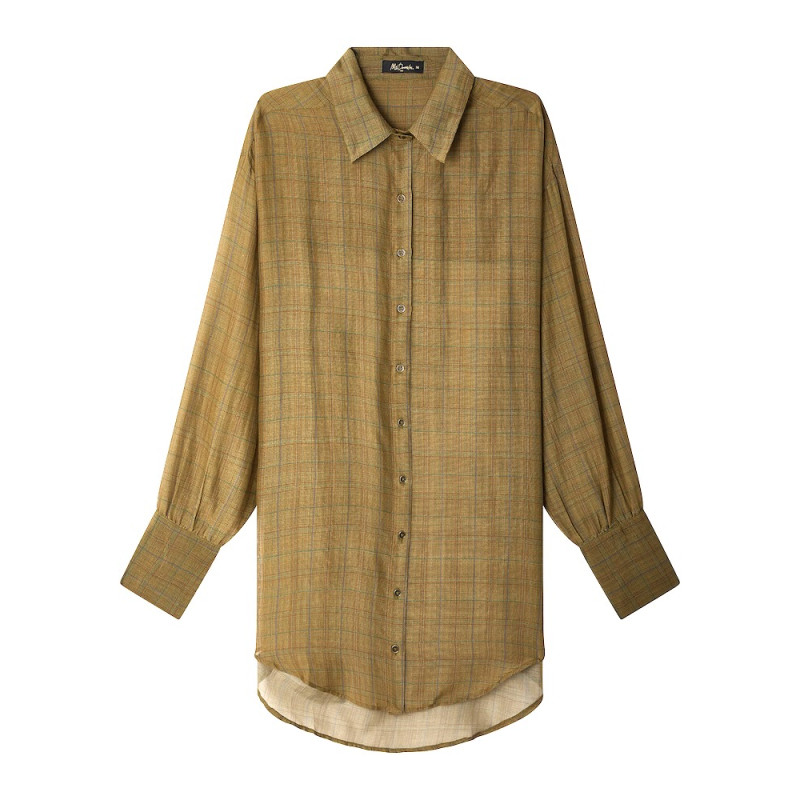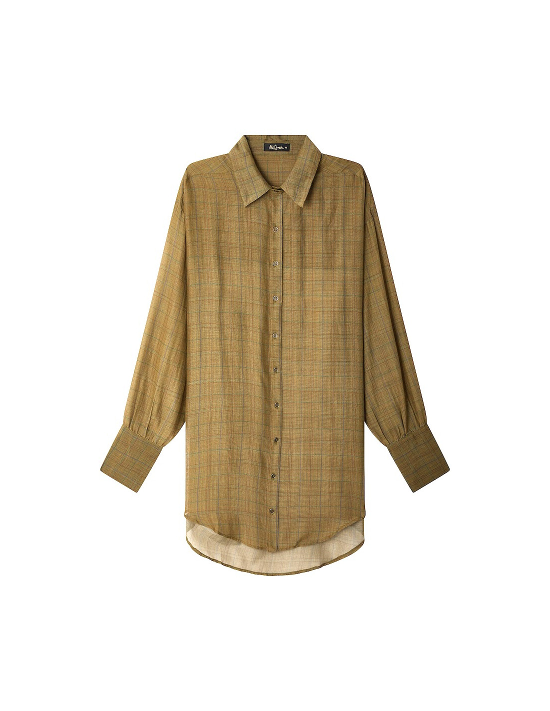 Chemise oversize en coton et soie, imprimé petits carreaux sur fond kaki.