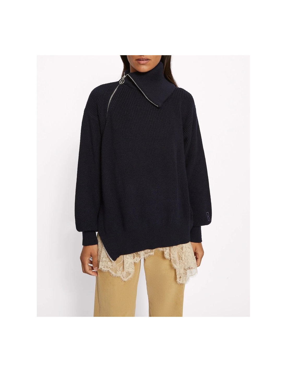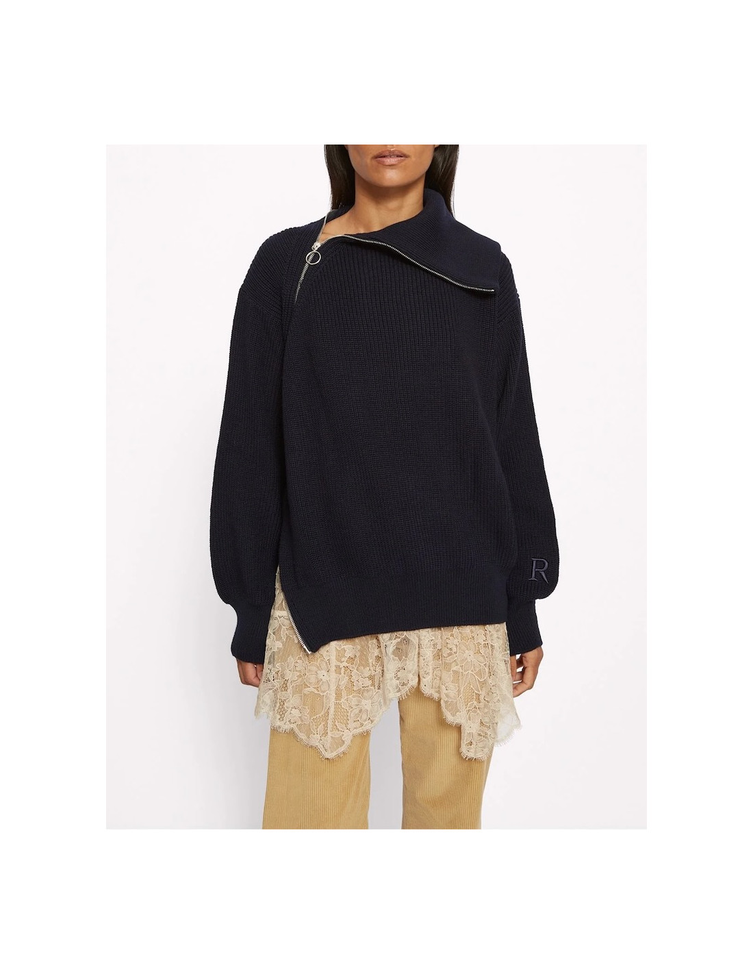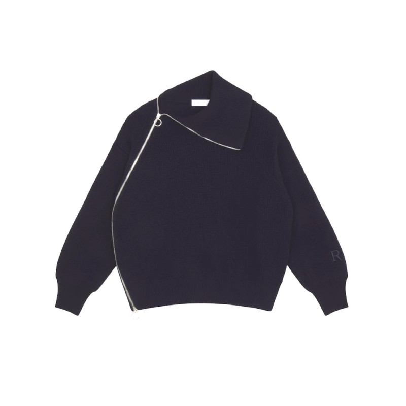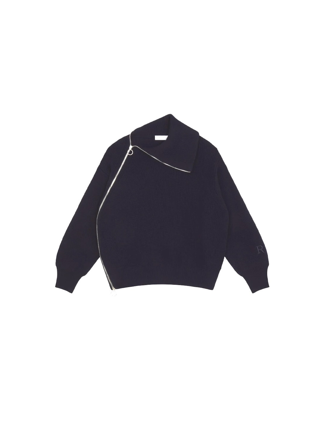 Pull en pure laine vierge asymétrique. Col montant avec zip intégral et double curseur. Tricoté en côtes perlées.