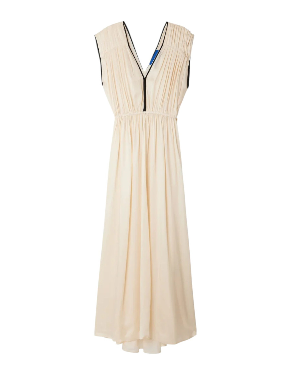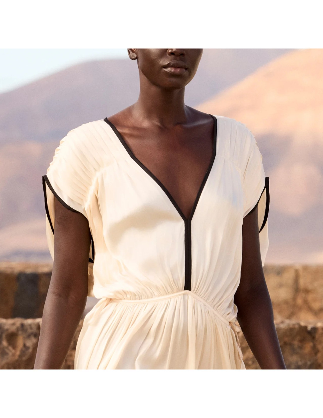 Décolleté en V et découpes soulignés par de fins biais noirs.