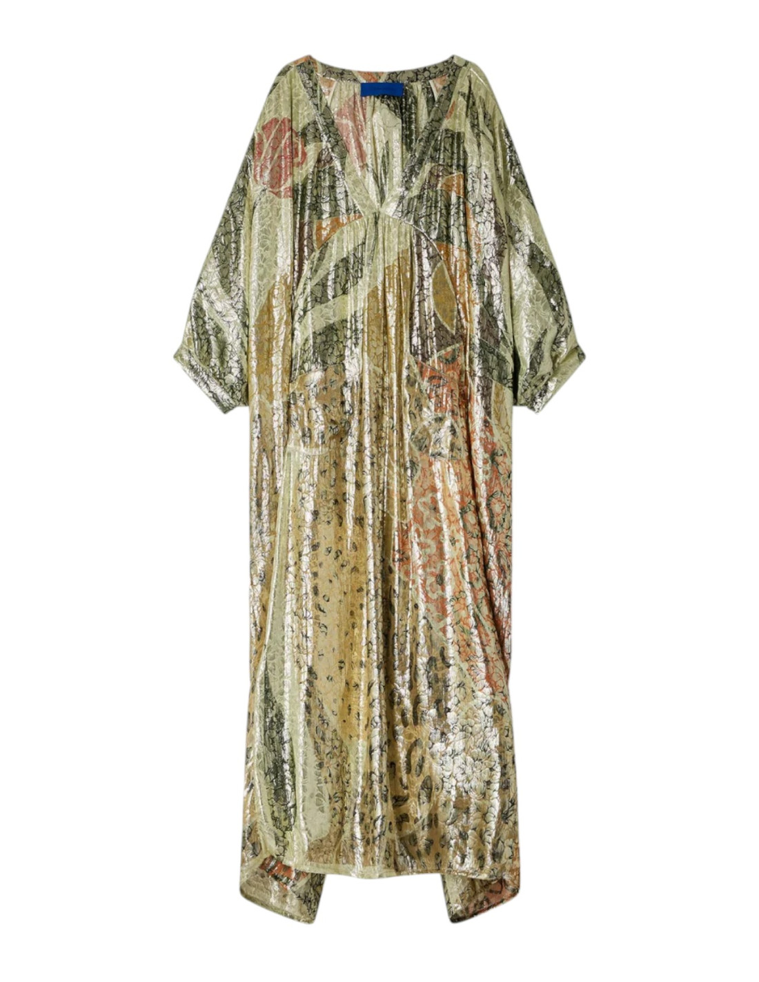 Robe caftan longue en jacquard lurex métallisé et imprimé placé multicolore, au reflet irisé et effet mouillé.