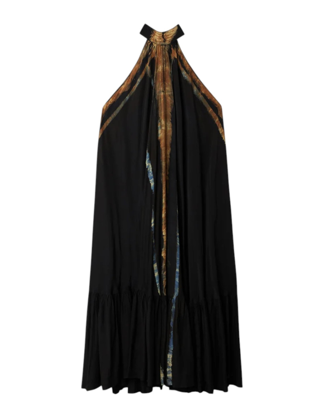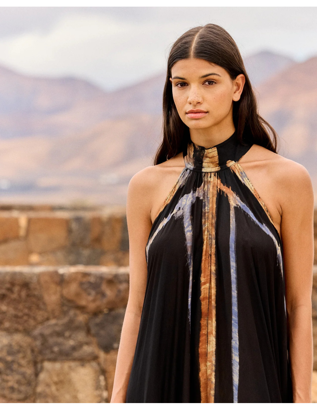 Robe longue fluide à la coupe trapèze aérienne sublimée par un tie & dye à la main, minutieusement placé pour un effet artistique et unique à chaque pièce.