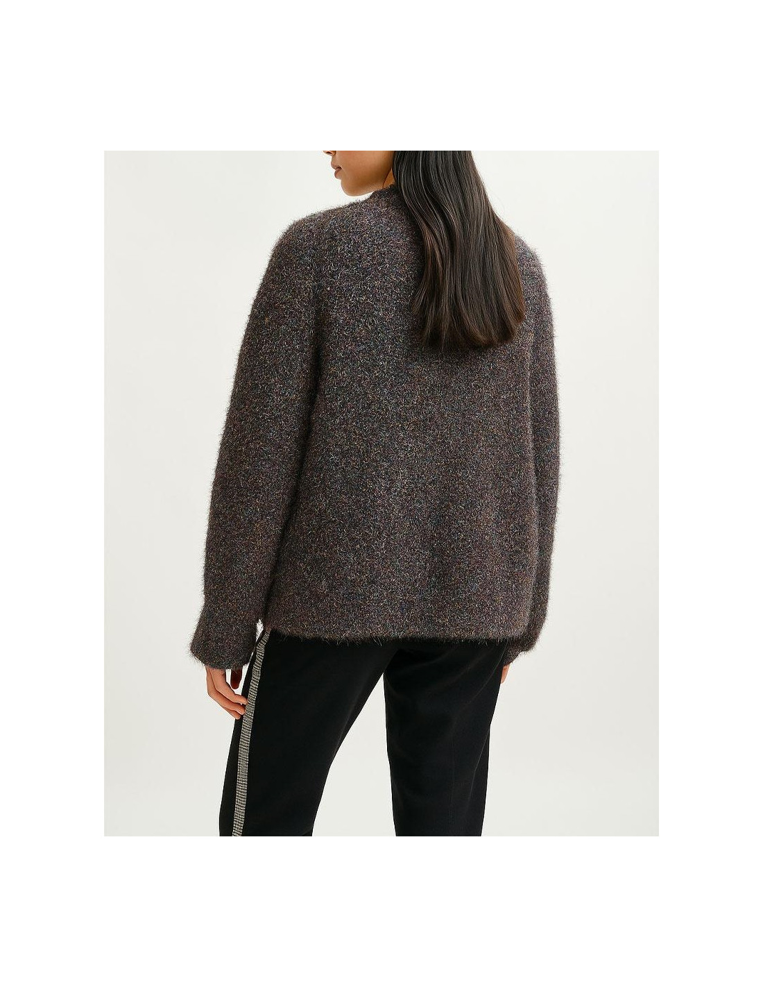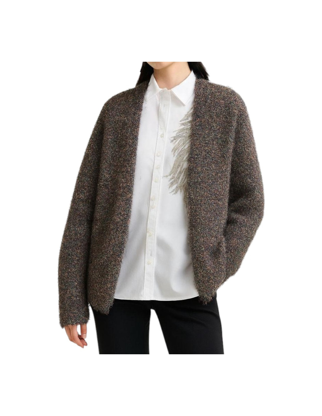 Cardigan confectionné à partir d'un fil doux et texturé, mélangé à des fibres métallisées.