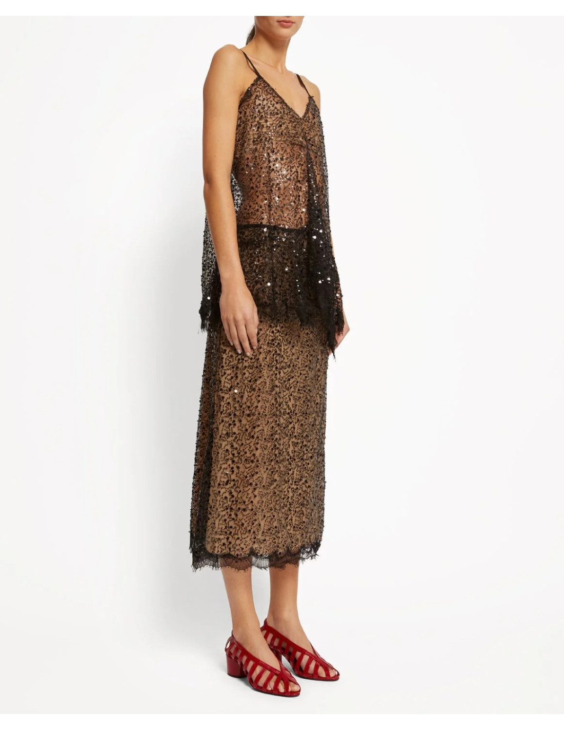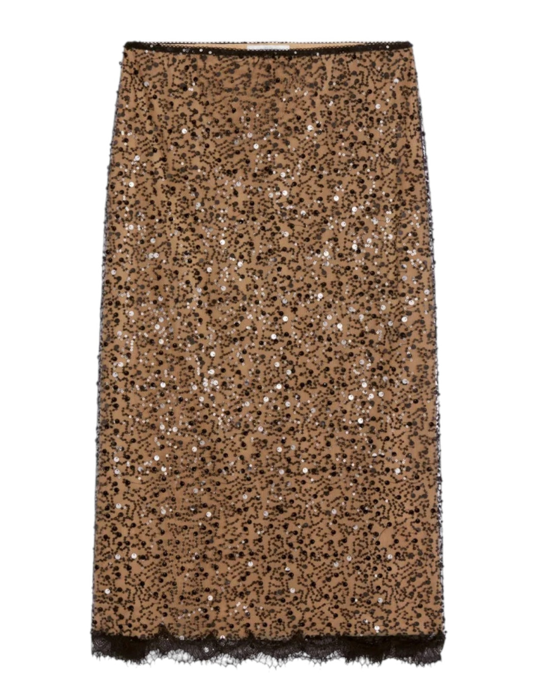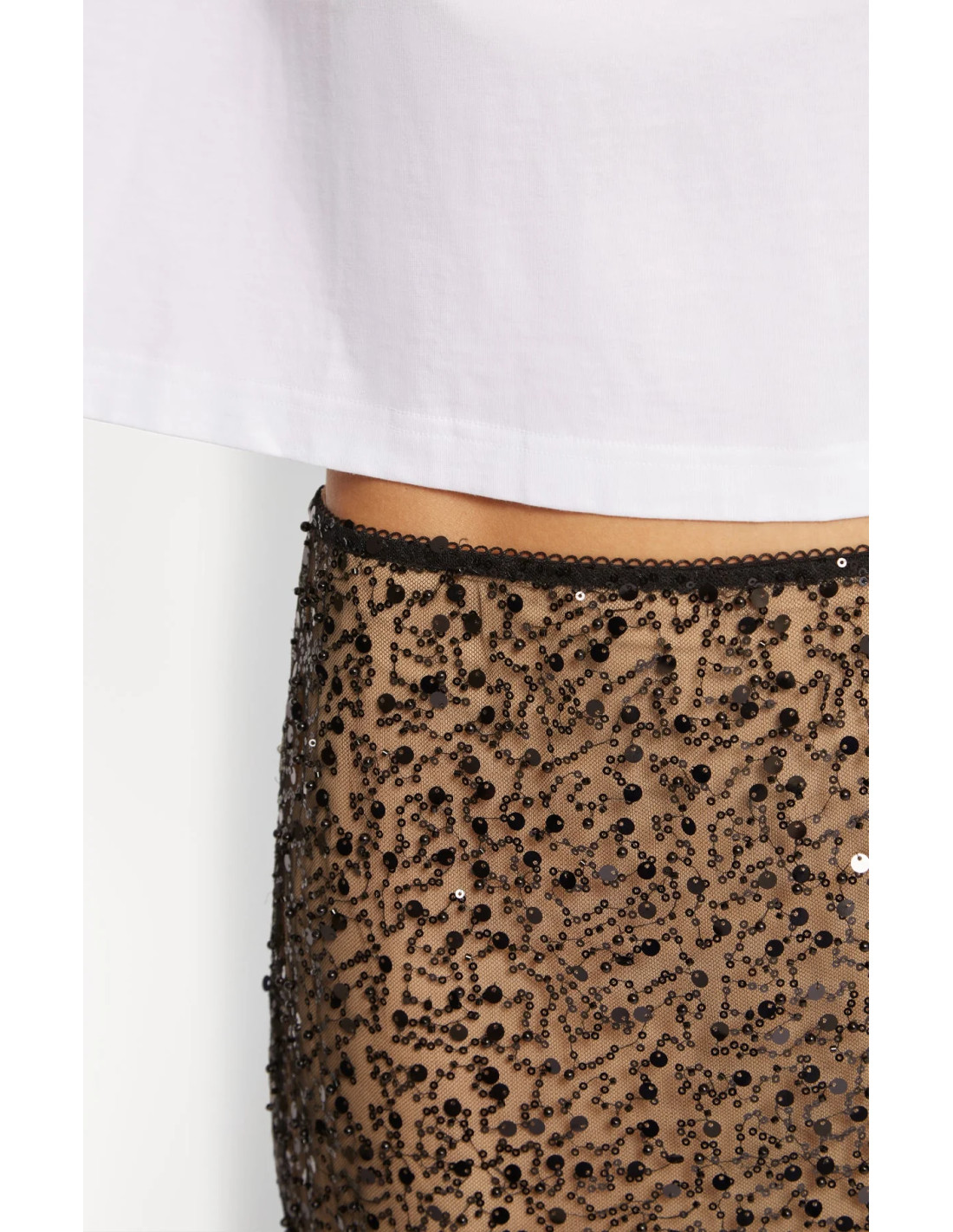 Jupe doublée associant sequins et perles brodés sur un tulle couleur chair, réhaussé de galons de dentelle.
