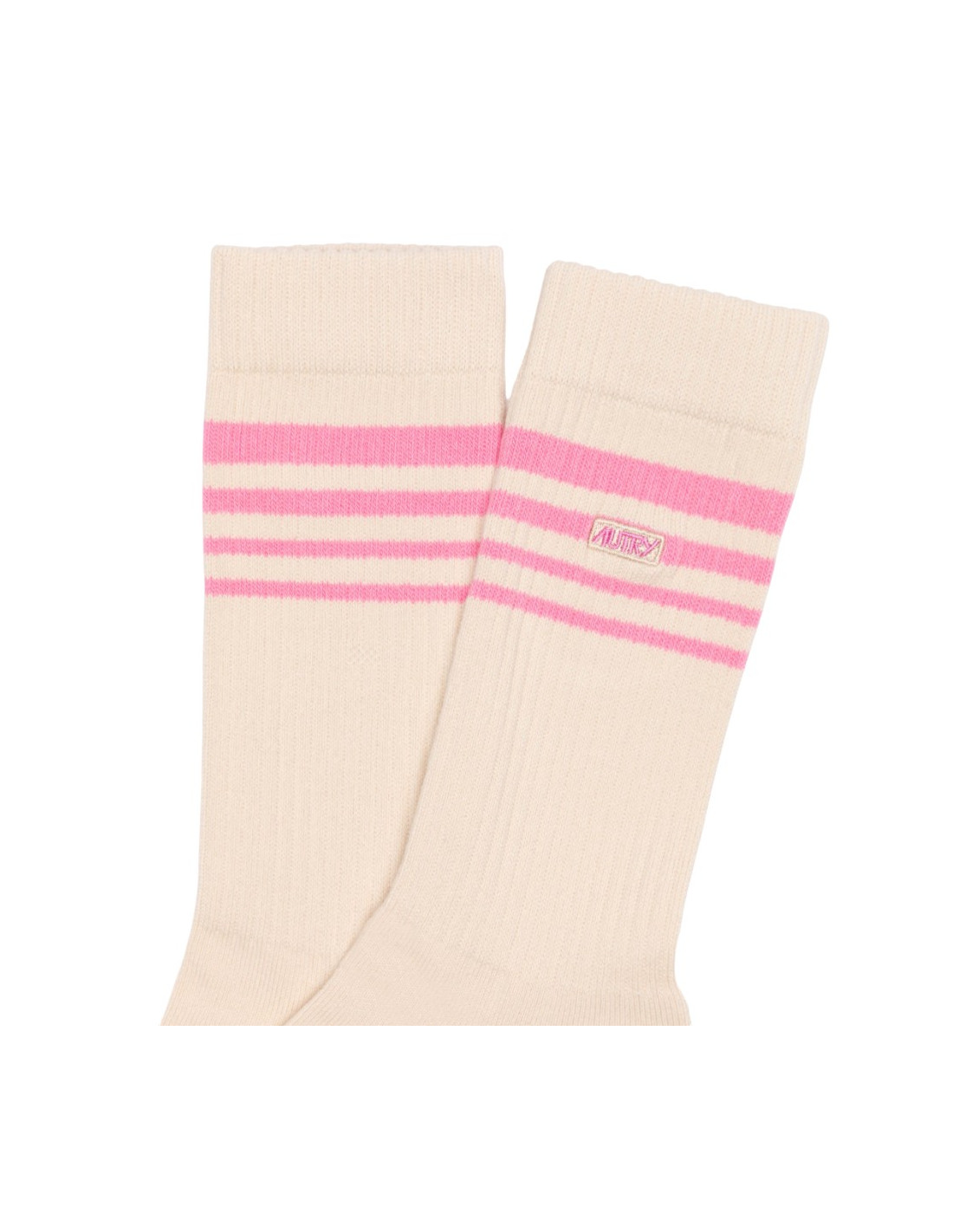 Chaussettes côtelées blanc cassé à rayures roses avec logo brodé