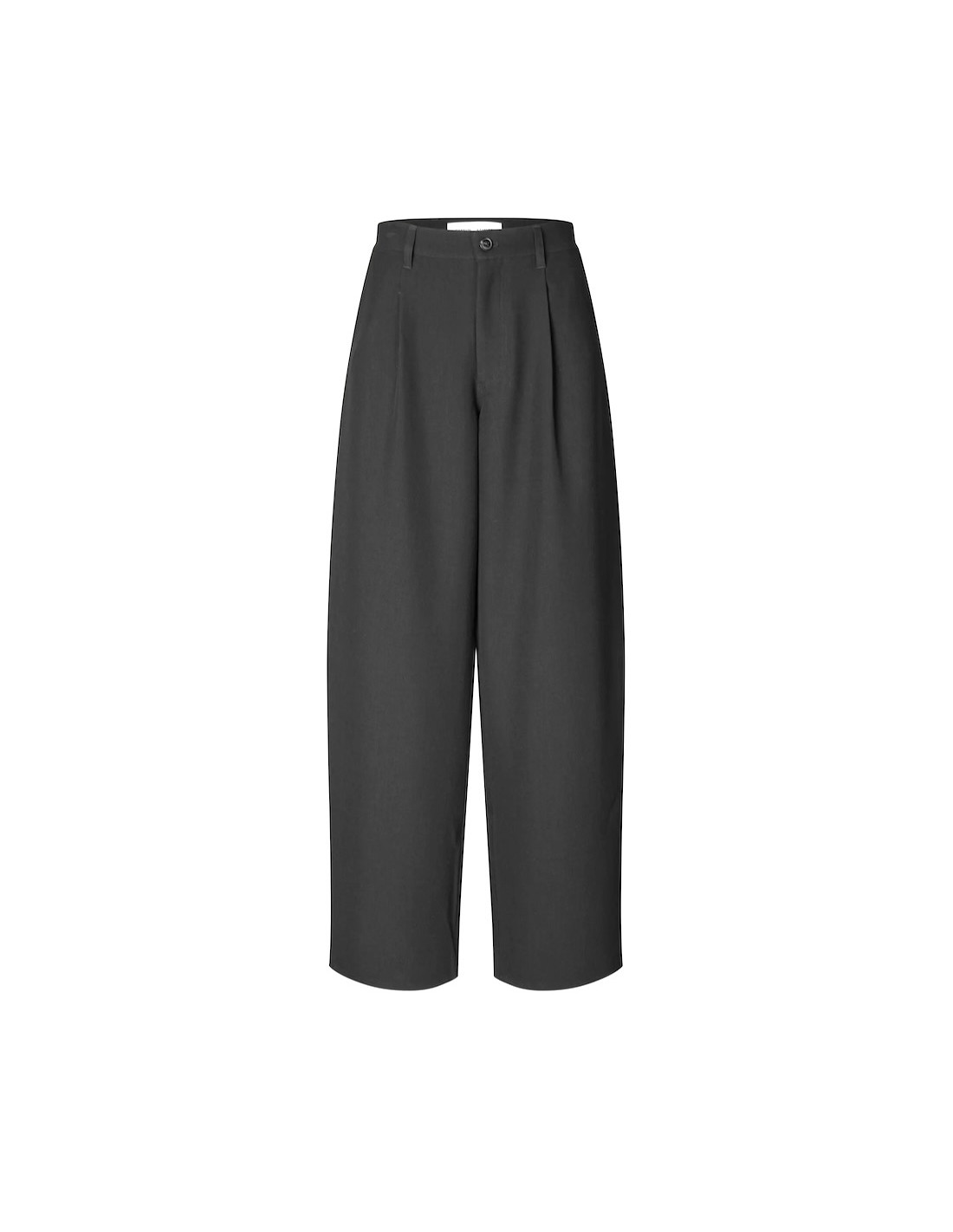 Pantalon taille mi-haute, coupe ample et jambe large.