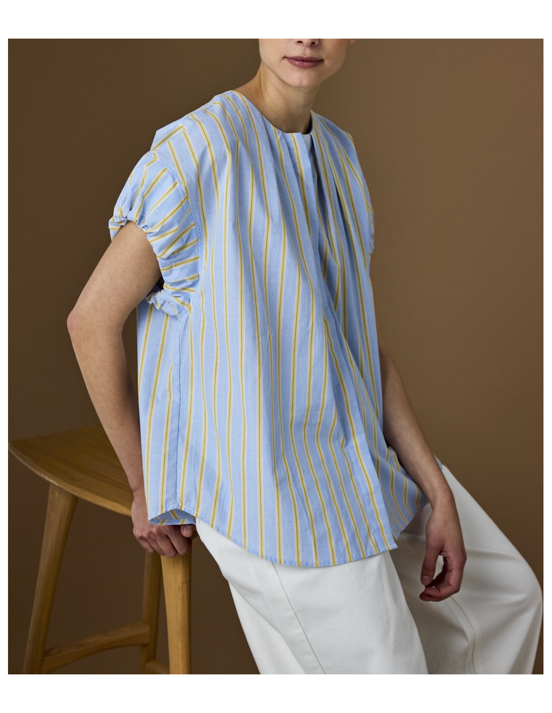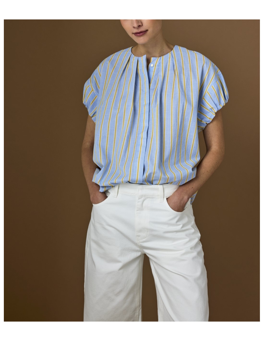 Blouse en coton bleu clair à rayures jaunes