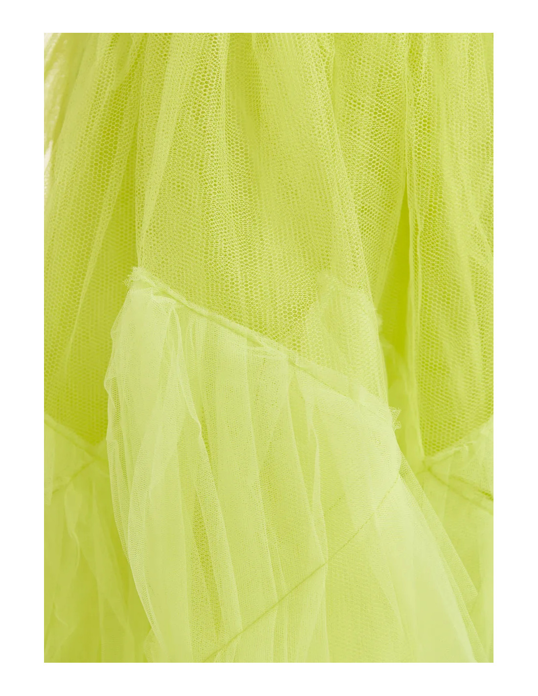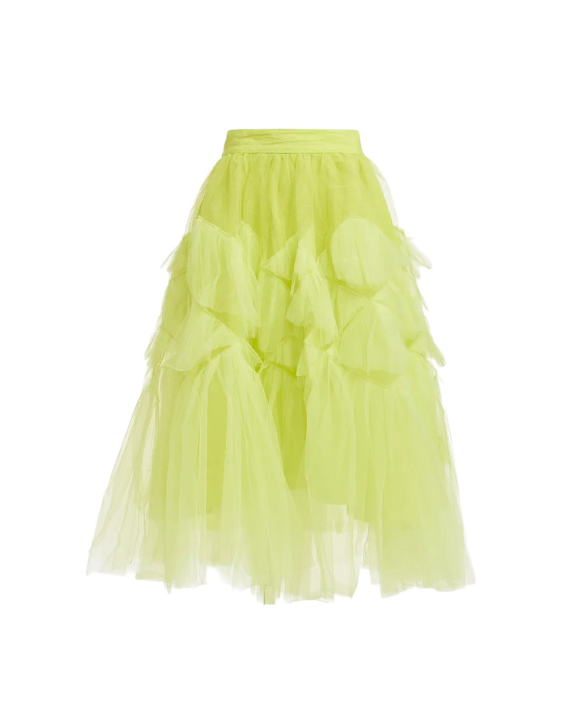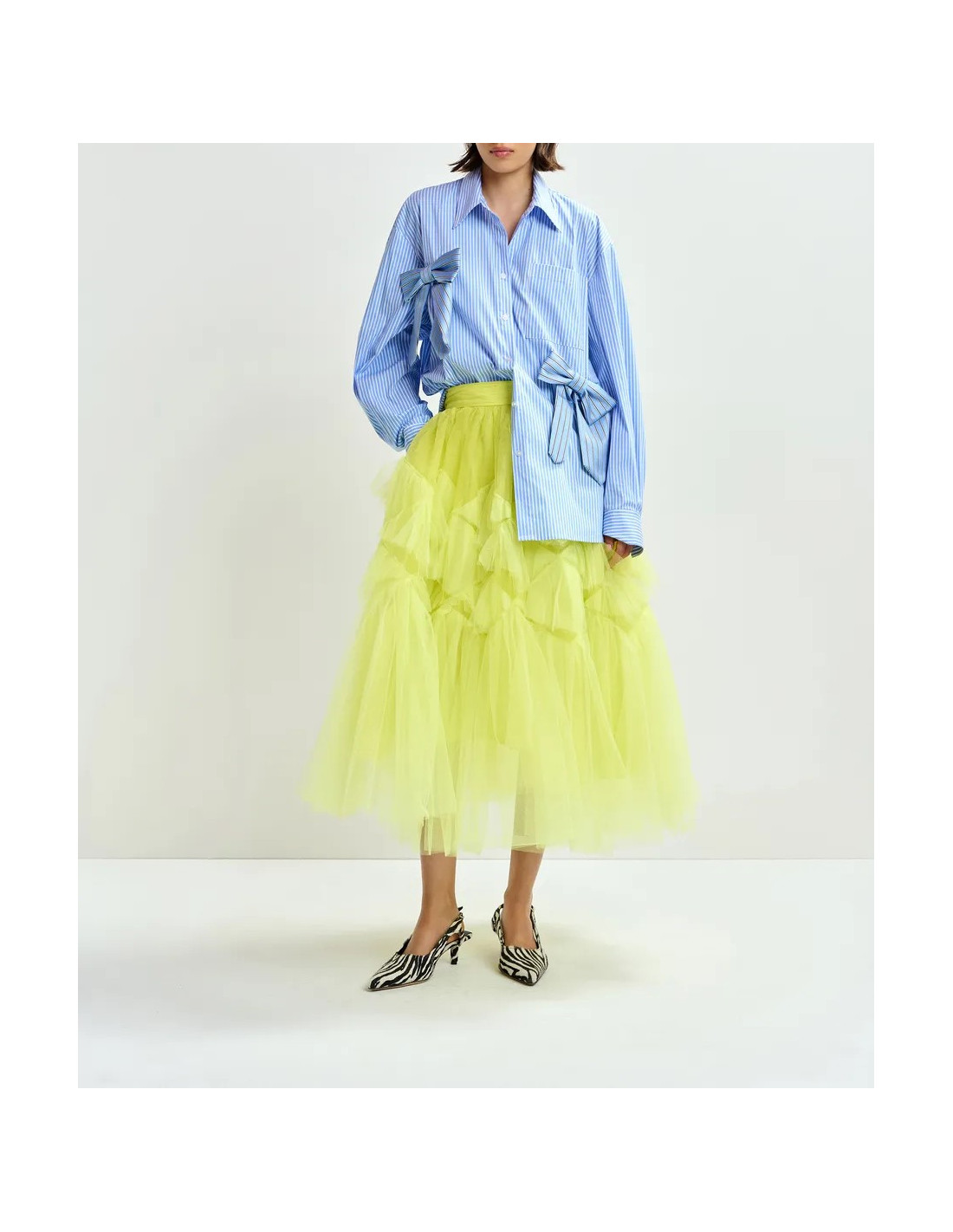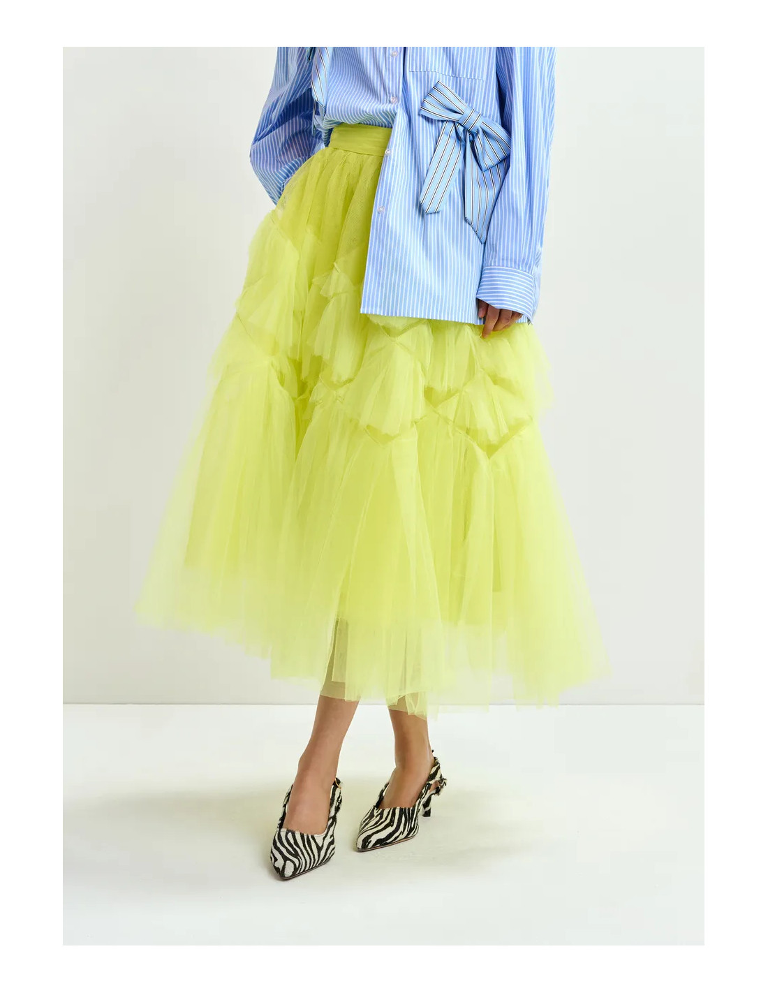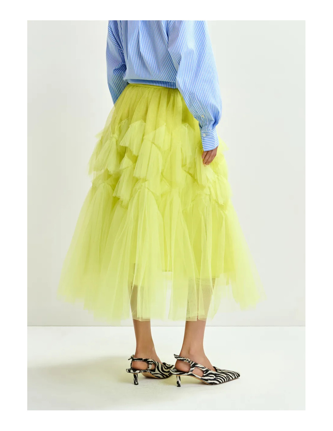 Jupe mi-longue asymétrique composée de couches de tulle aéré agencées en volants