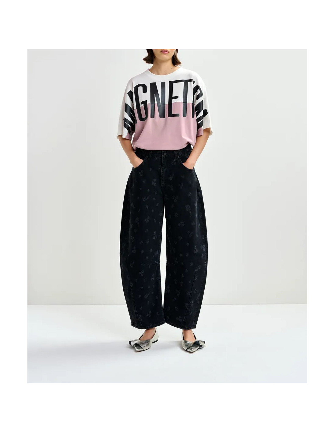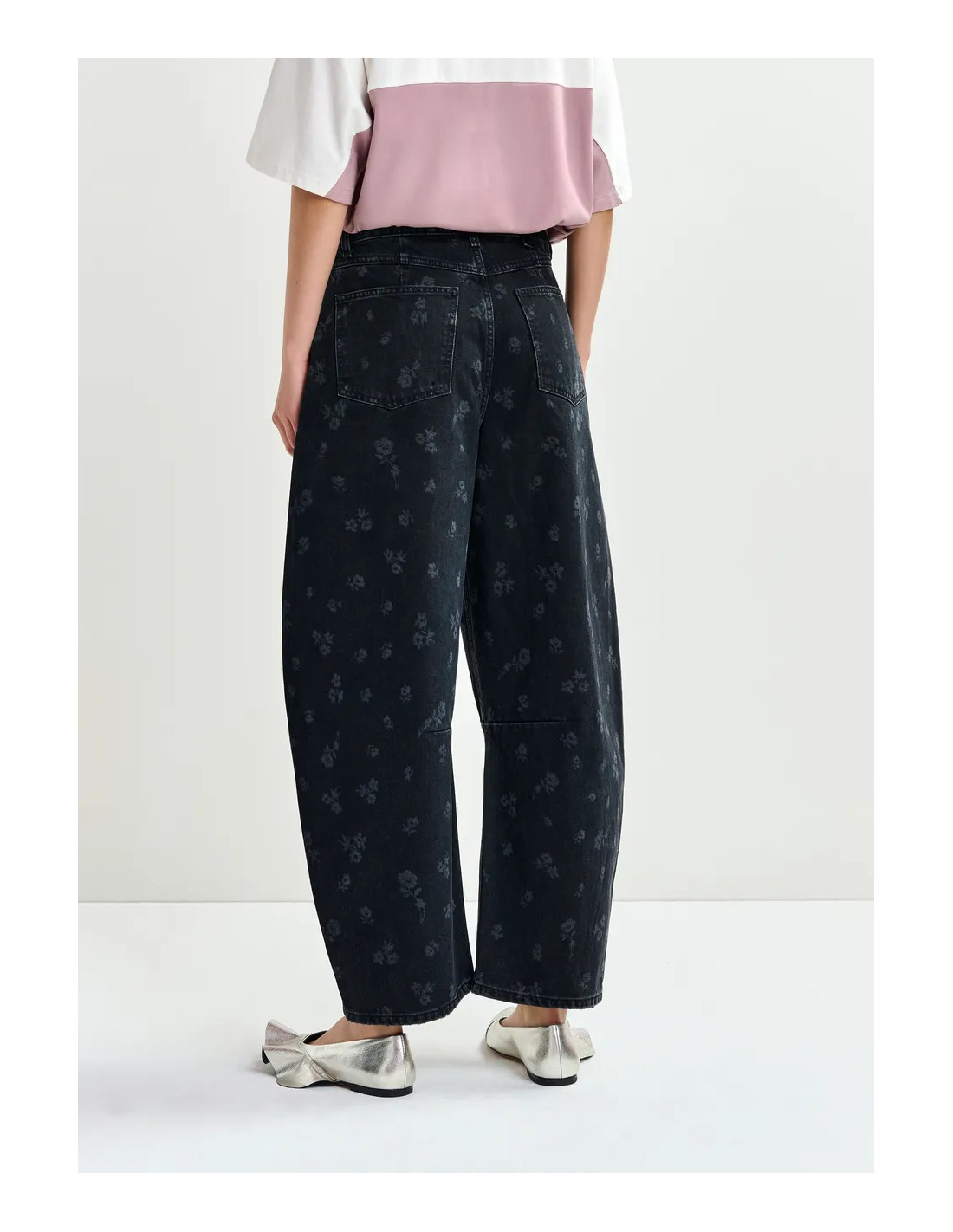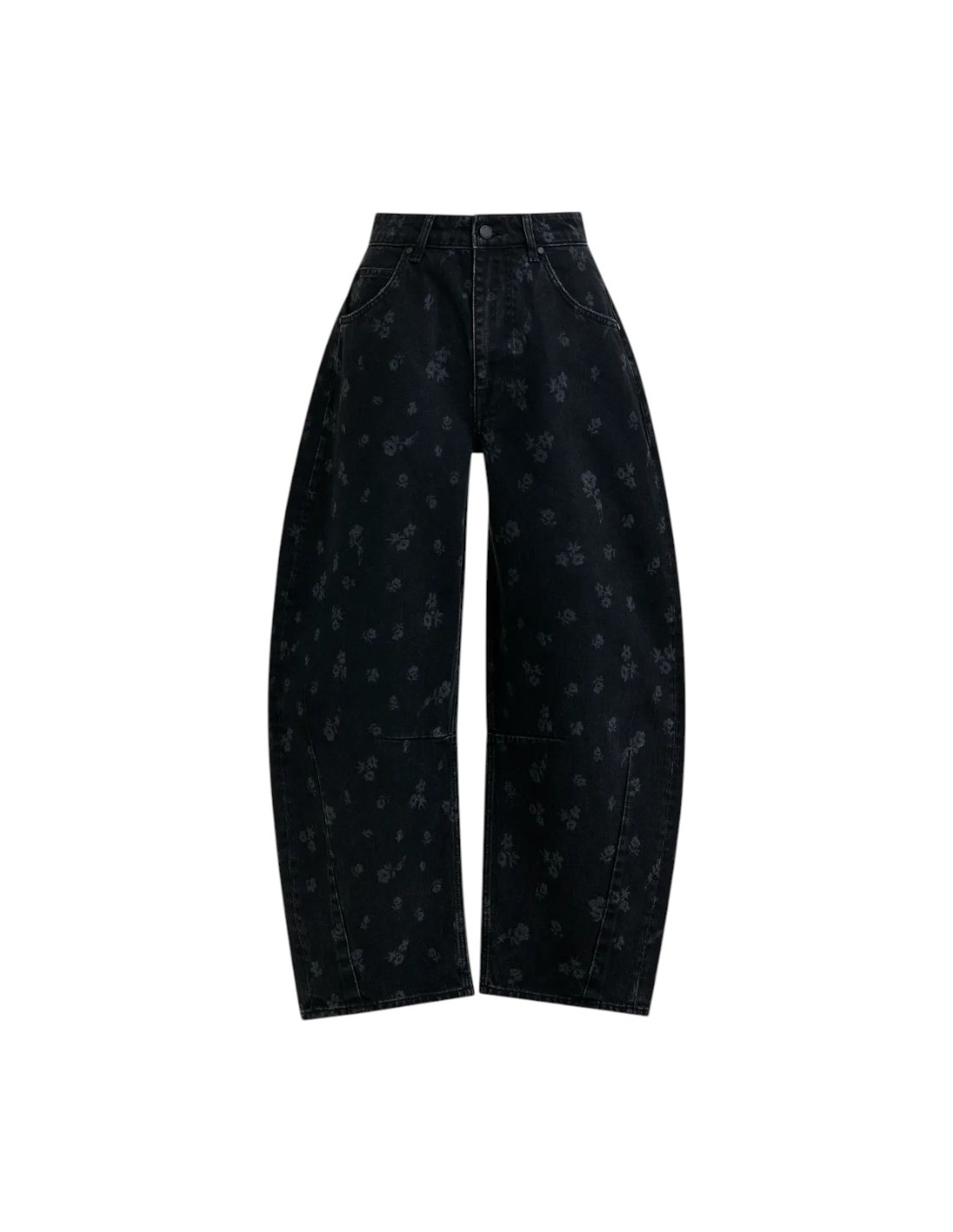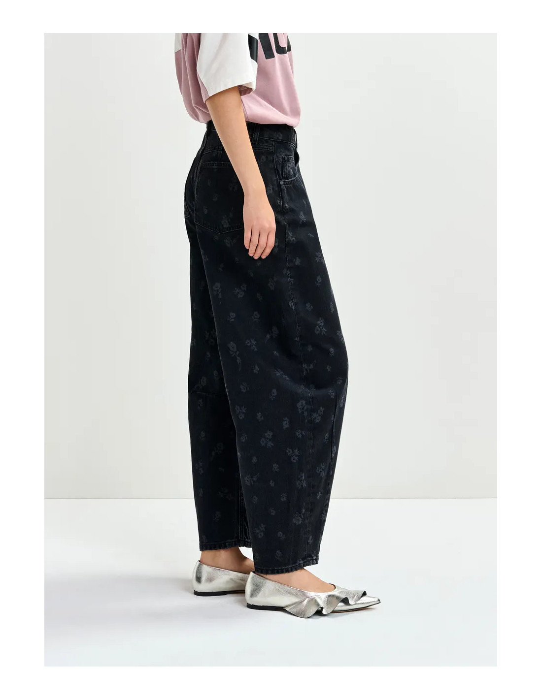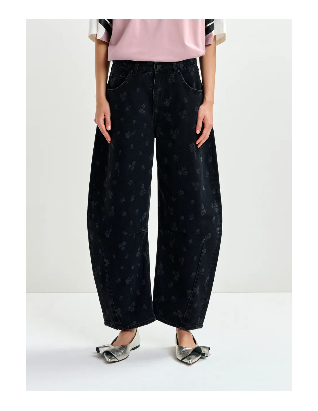 Jean barrel noir imprimé fleuri