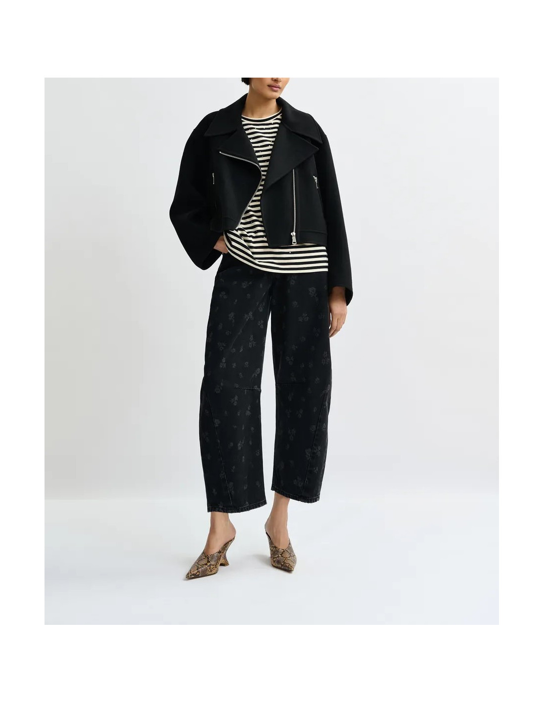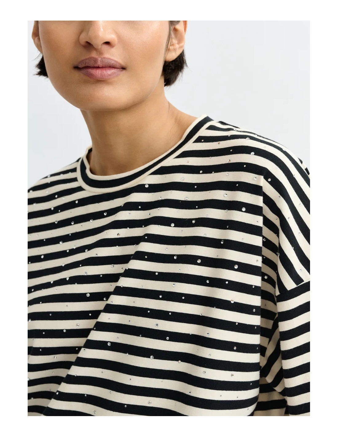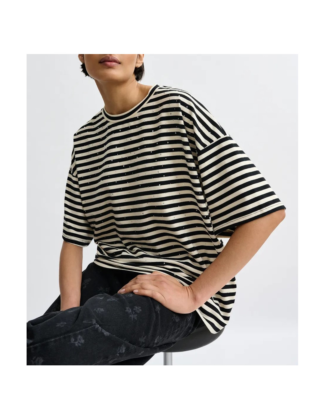 T-Shirt oversize noir et blanc en coton à rayures réhaussé de strass.