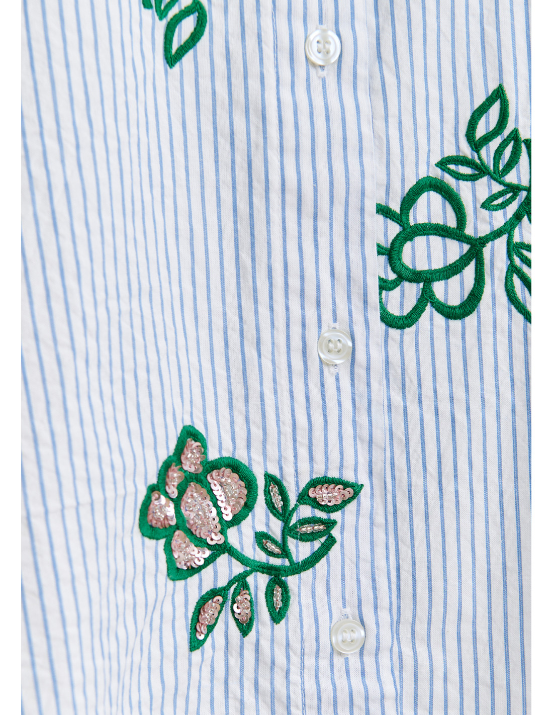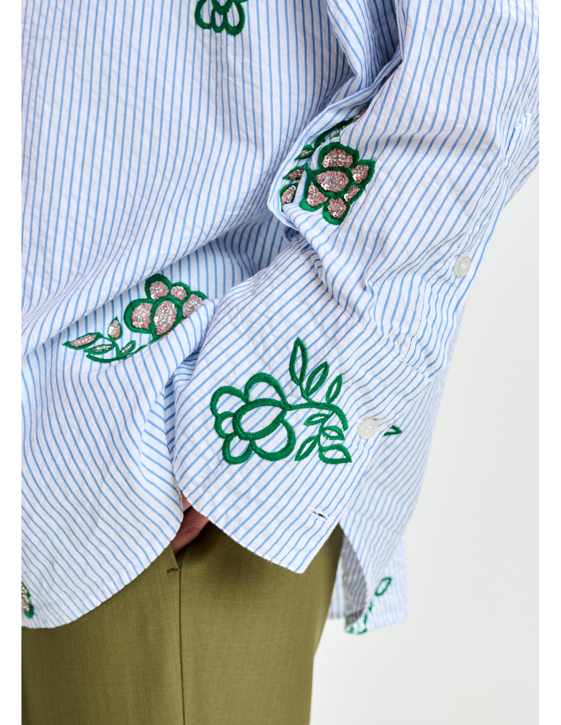 Chemise blanc cassé à fines rayures bleu clair et détails de broderies vertes avec sequins et perles