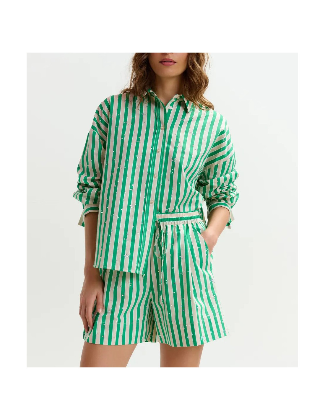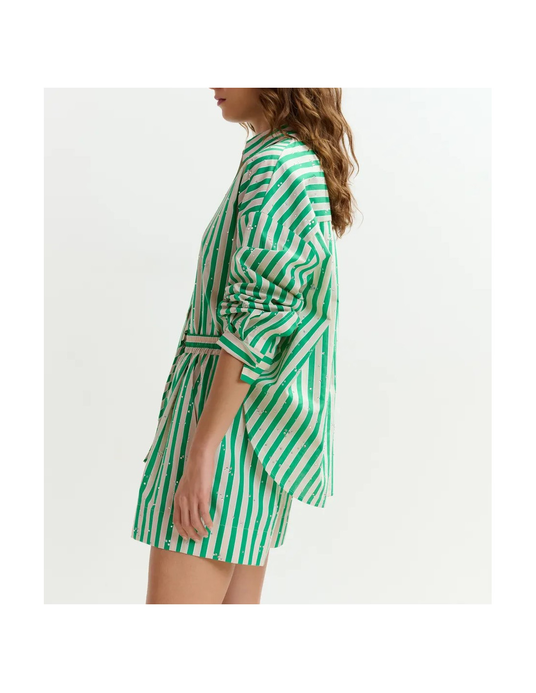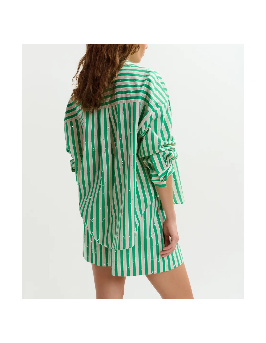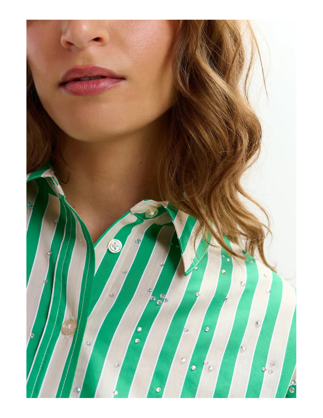 Chemise à rayures en coton mélangé vert et crème agrémentée de strass