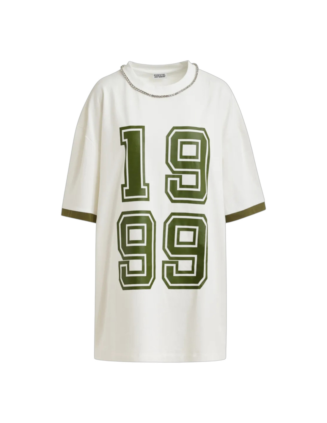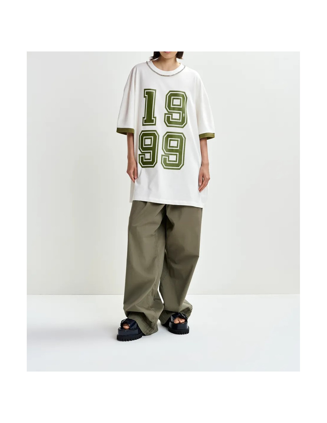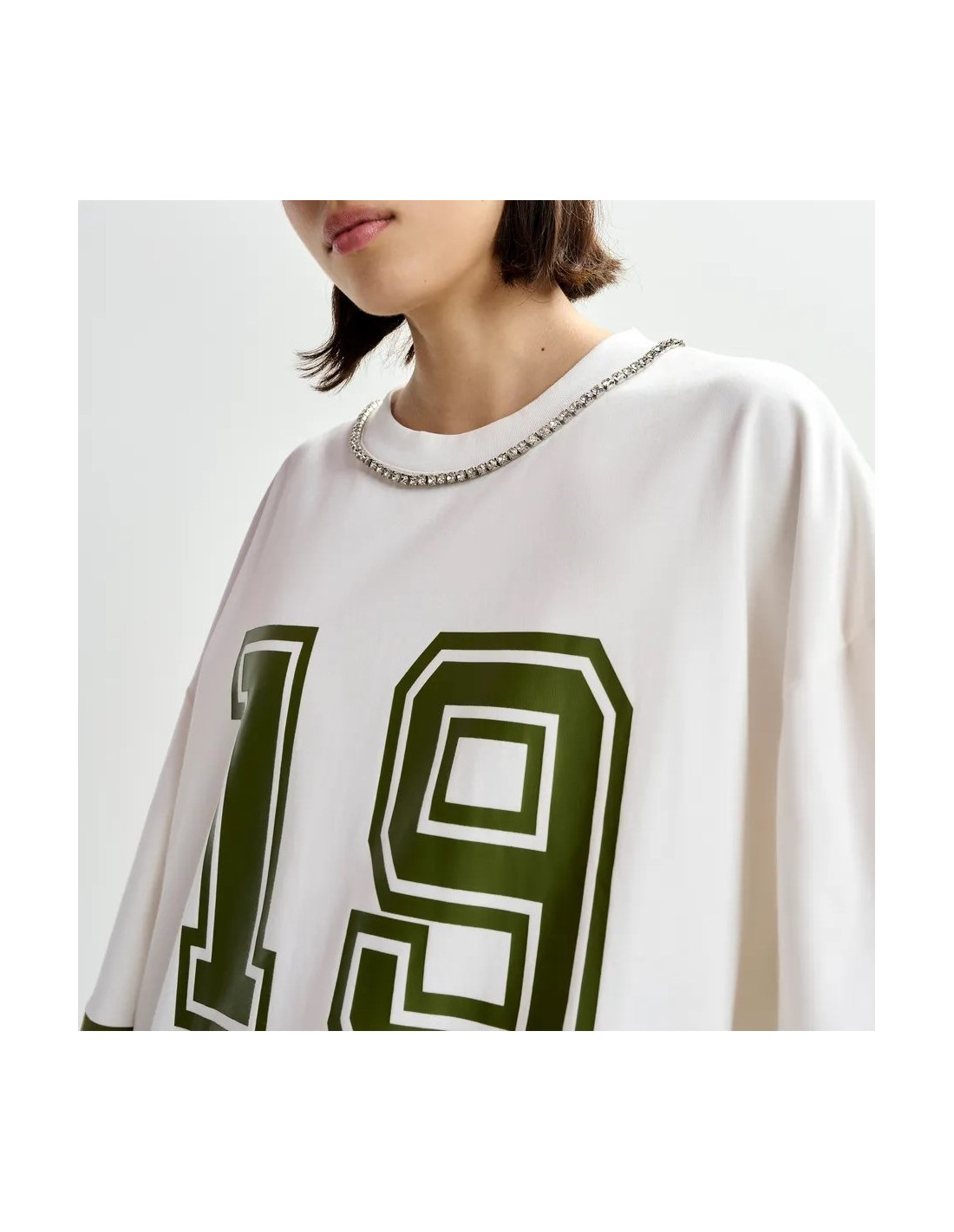 T-Shirt oversize en coton blanc cassé imprimé d'un motif numérique kaki avec strass le long de l'encolure