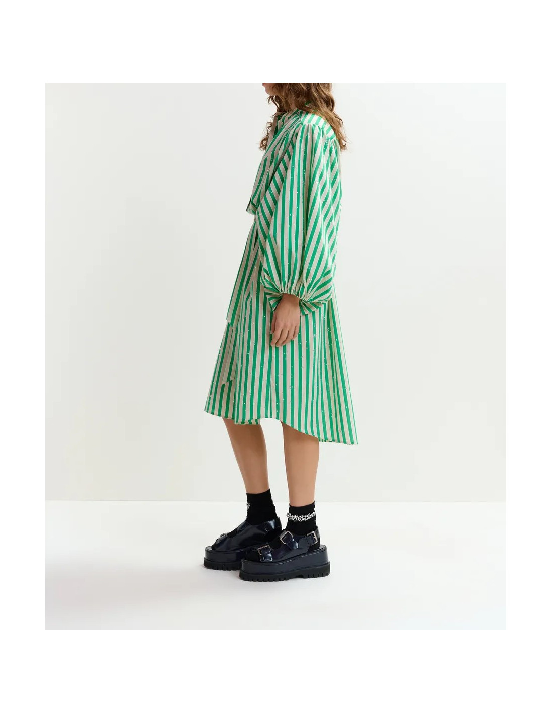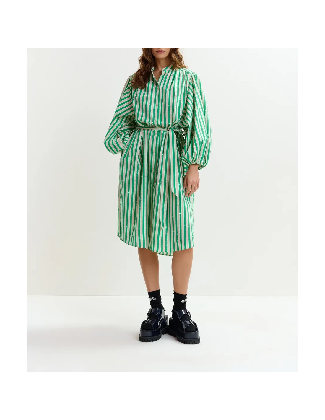 Robe chemise mi-longue en coton mélangé vert et crème à rayures agrémentée de strass