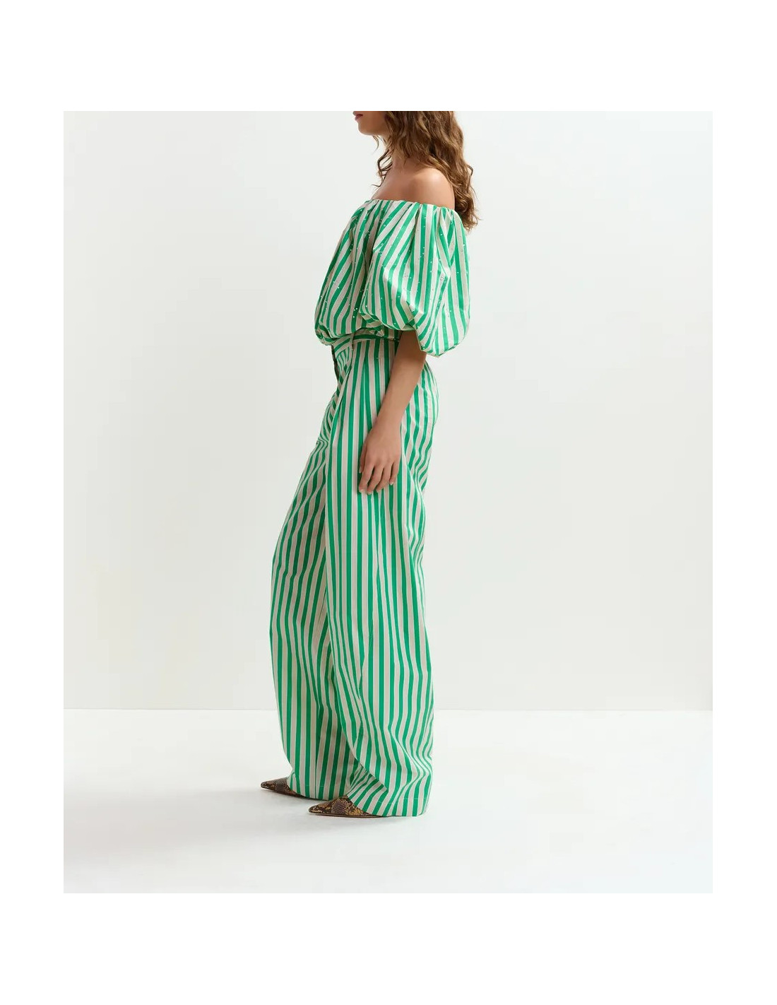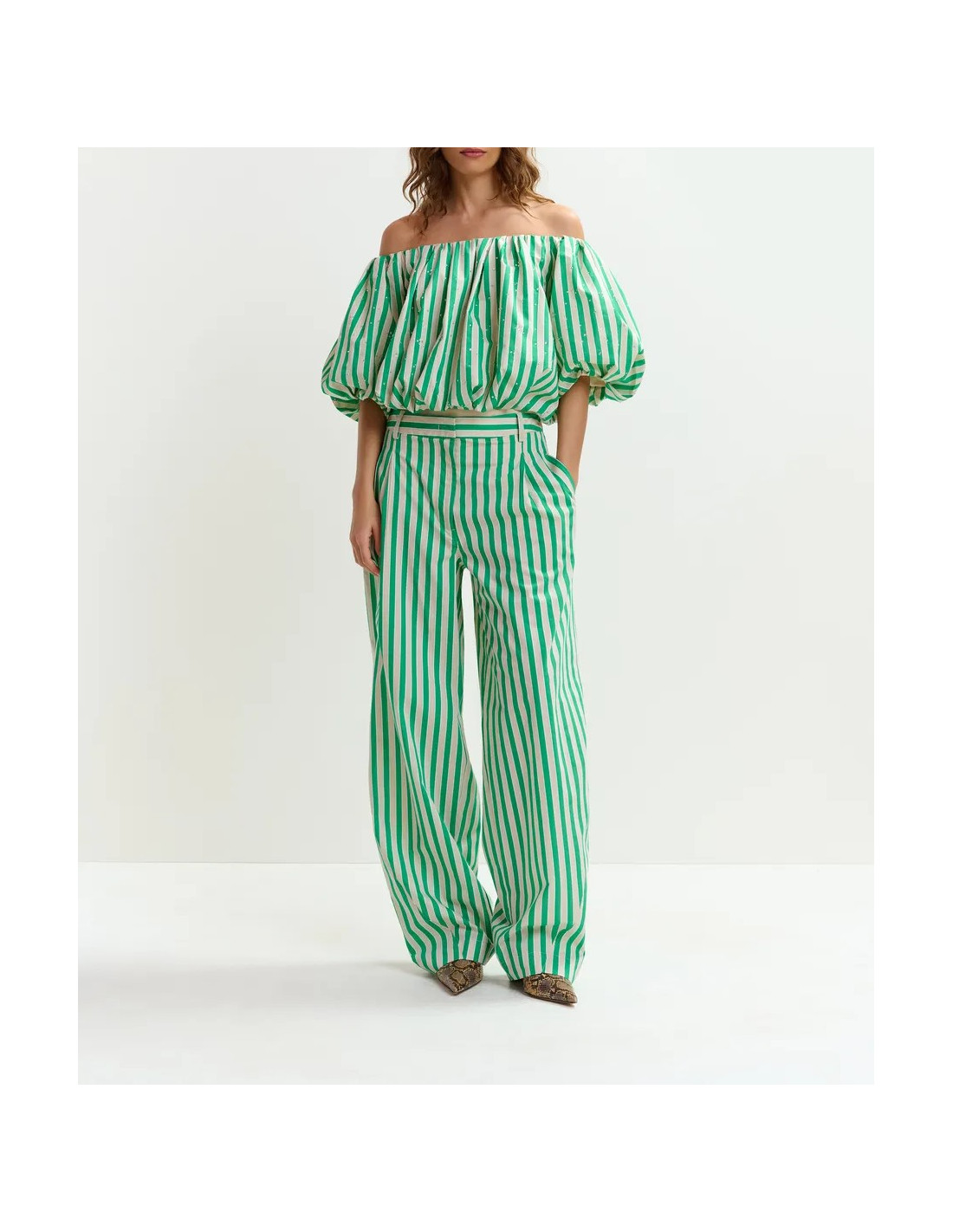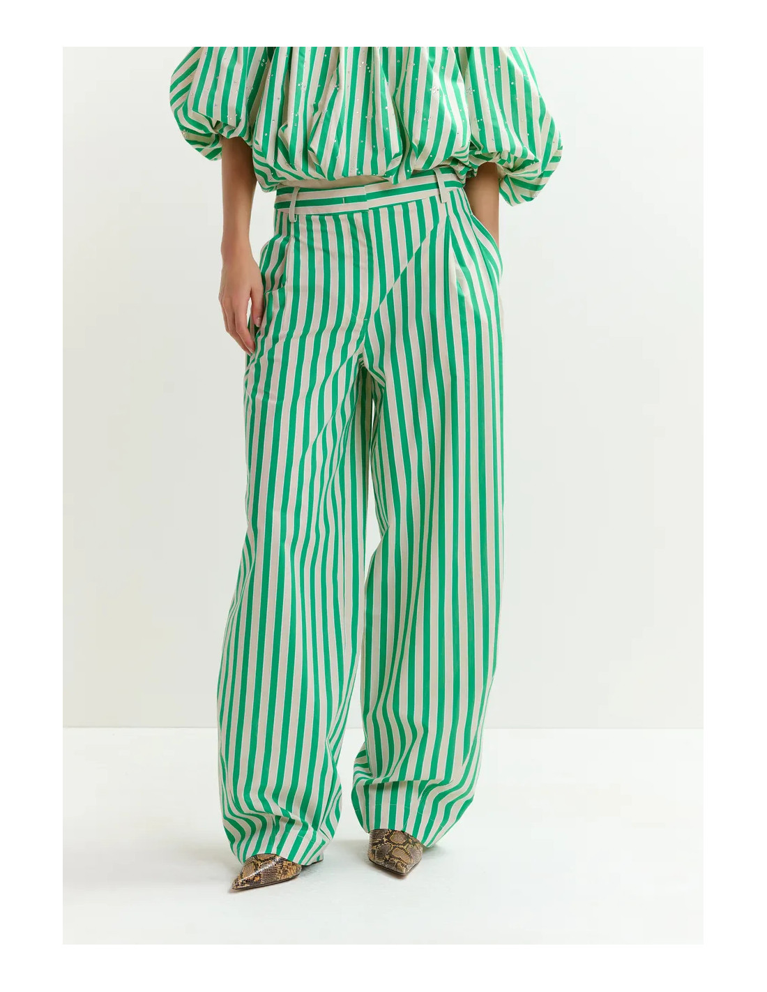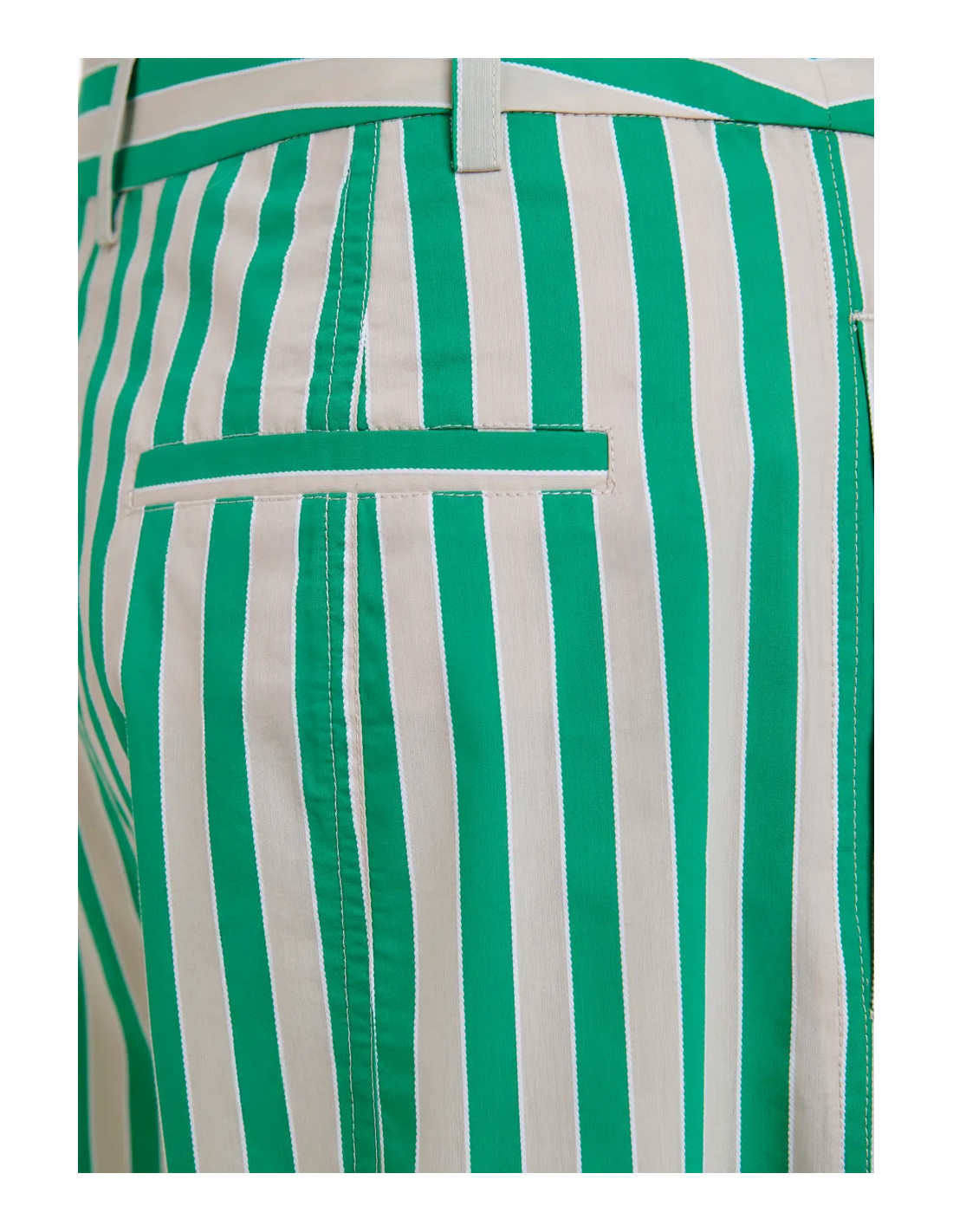 Pantalon en coton mélangé vert et crème à rayures, agrémenté de strass