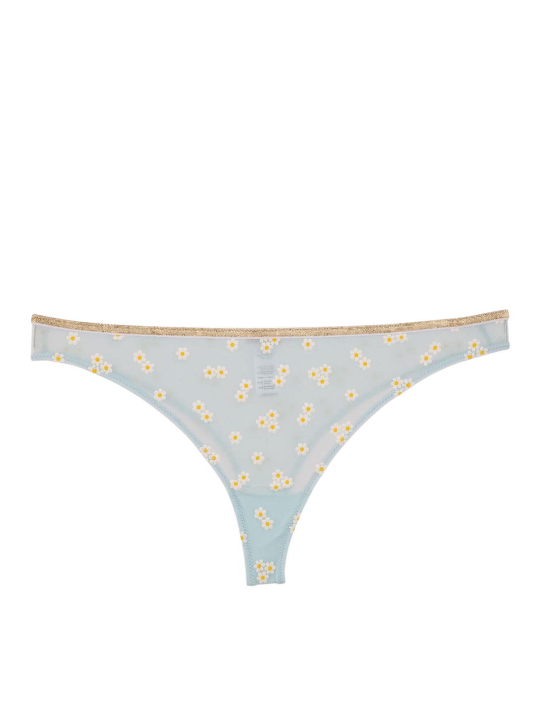 Bas de lingerie coupe brésilienne en tulle transparent bleu avec motif floral